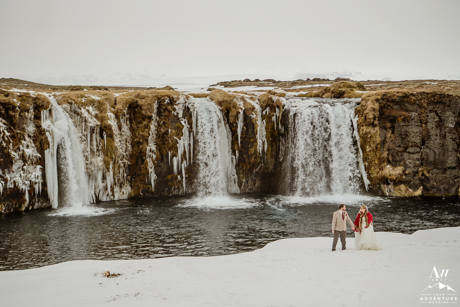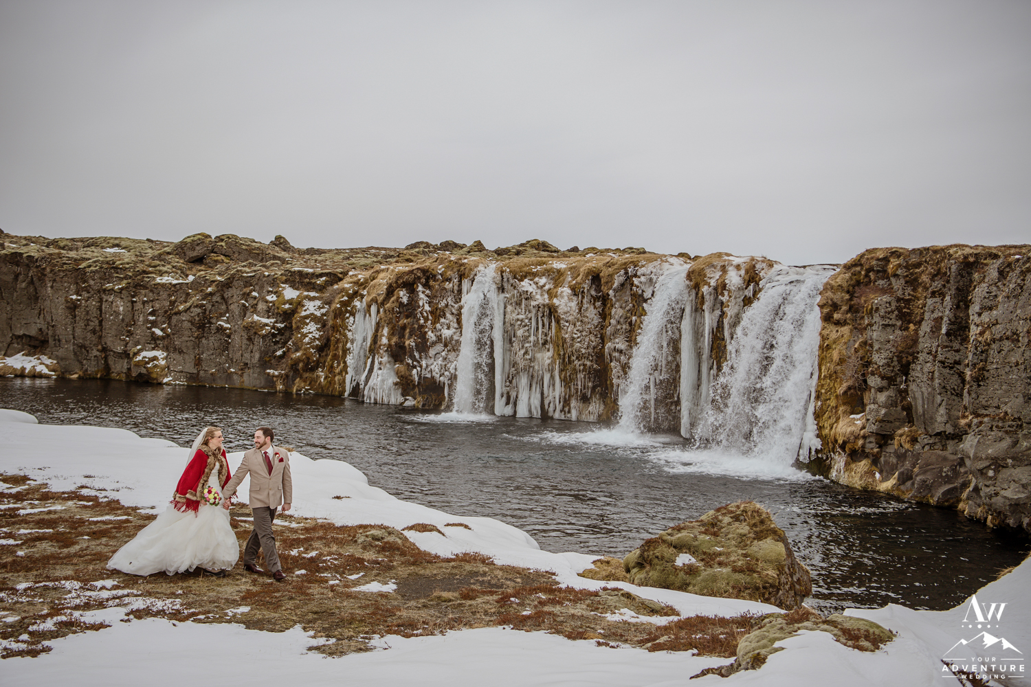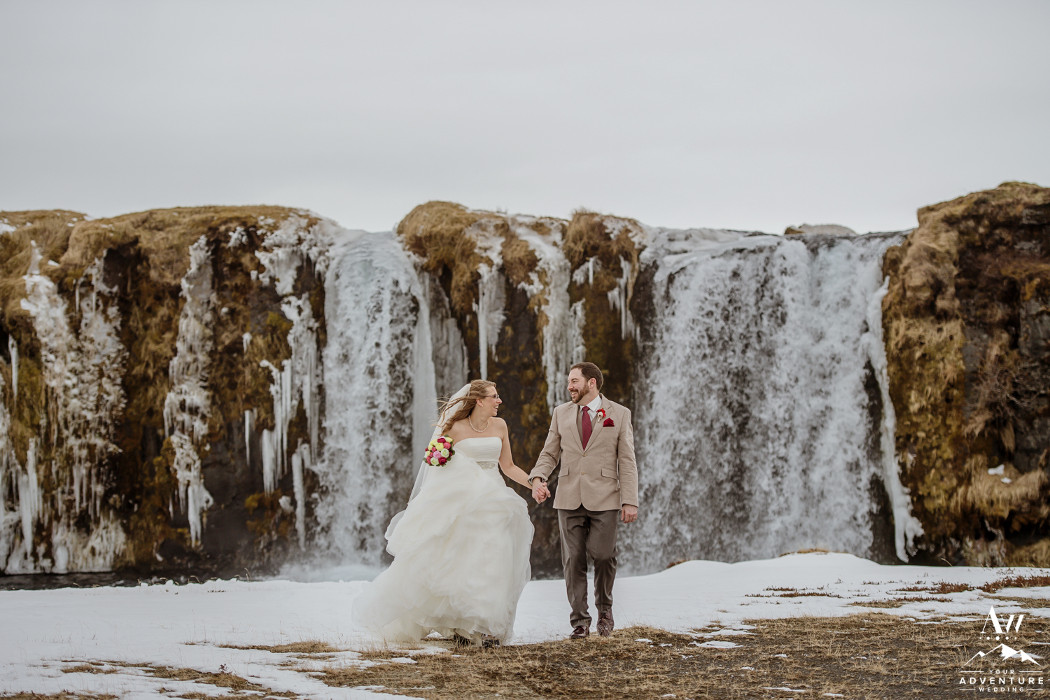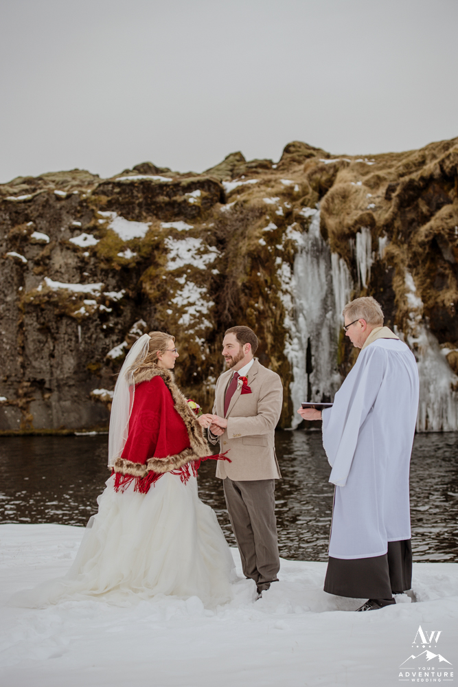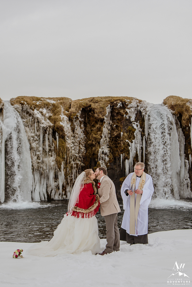 The ceremony concluded Stephanie and Andrew were ready to explore this sweet snow covered waterfall with their Iceland wedding photographer!