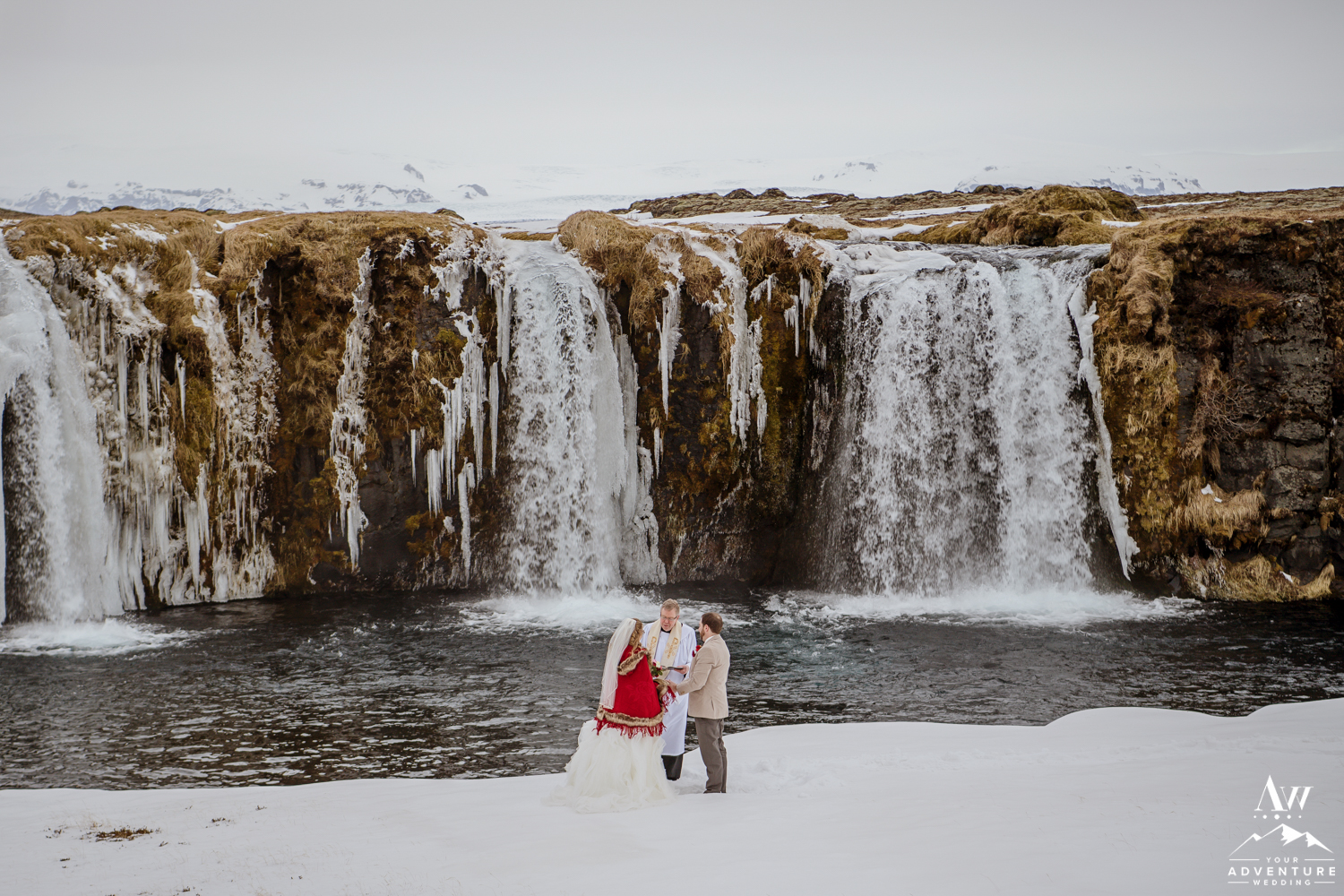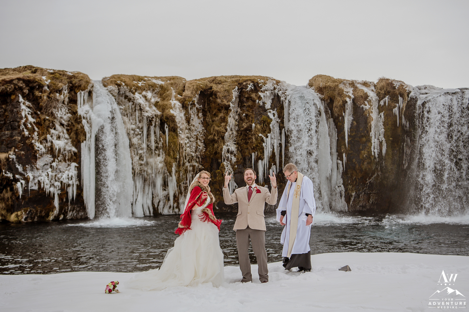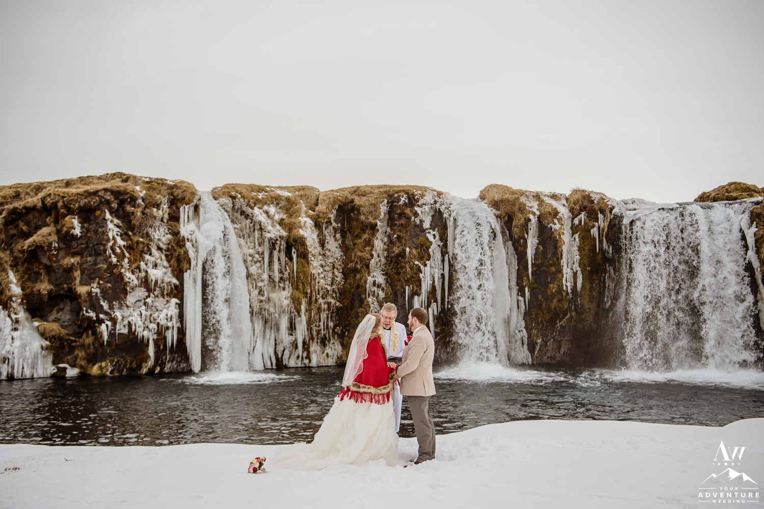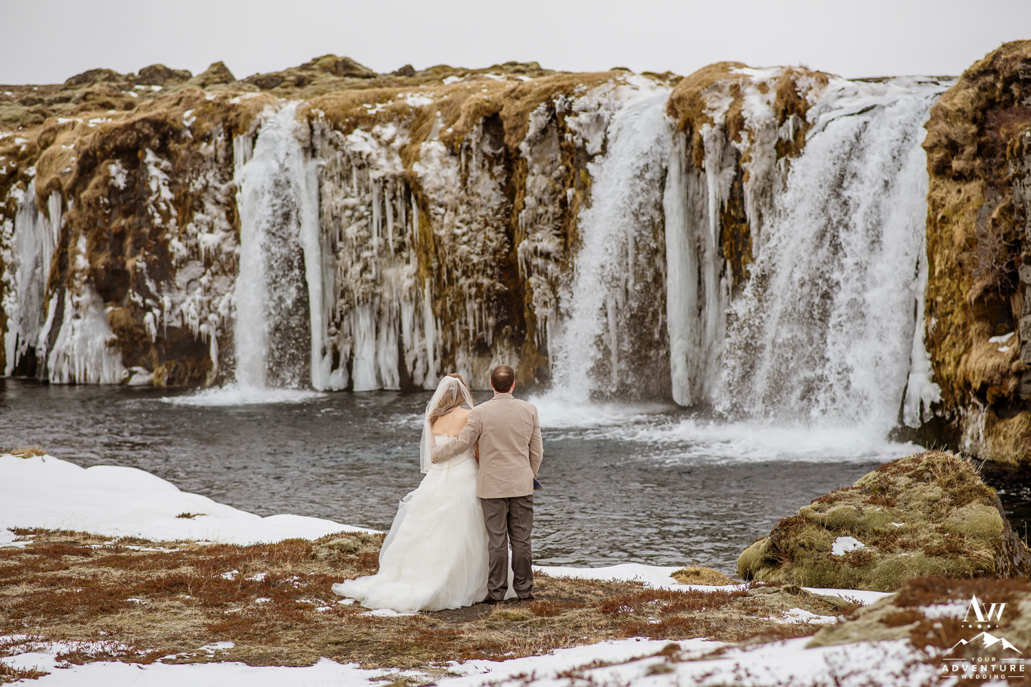 The ceremony concluded Stephanie and Andrew were ready to explore this sweet snow covered waterfall with their Iceland wedding photographer!