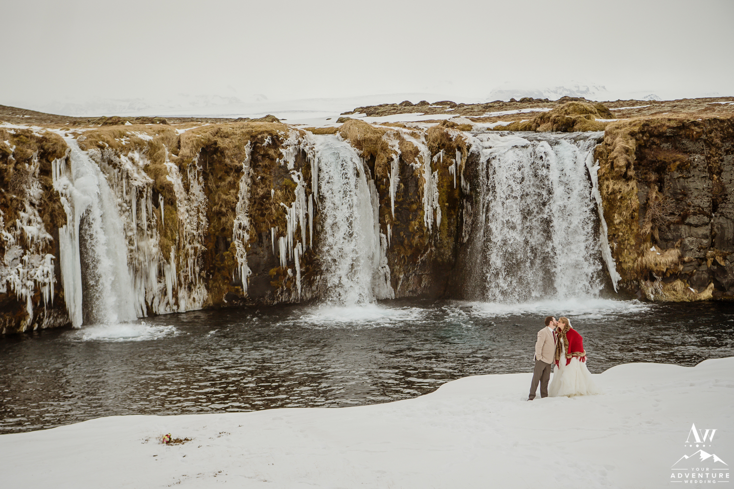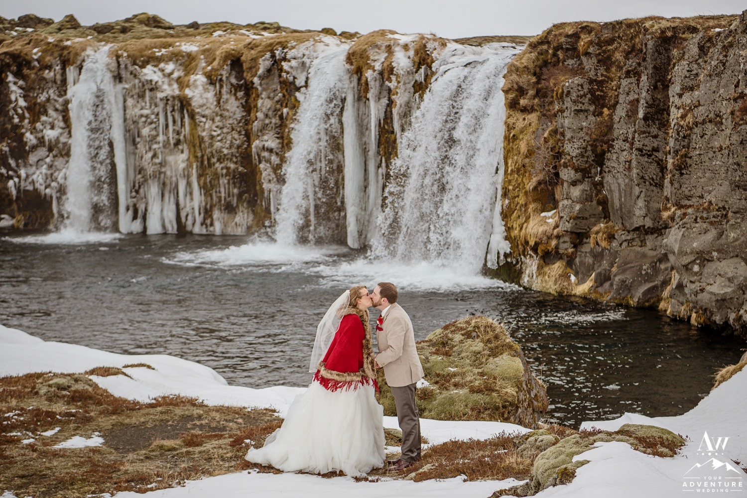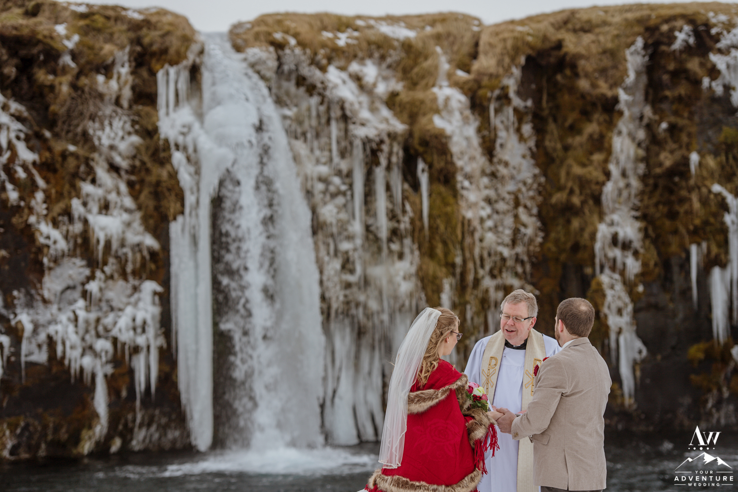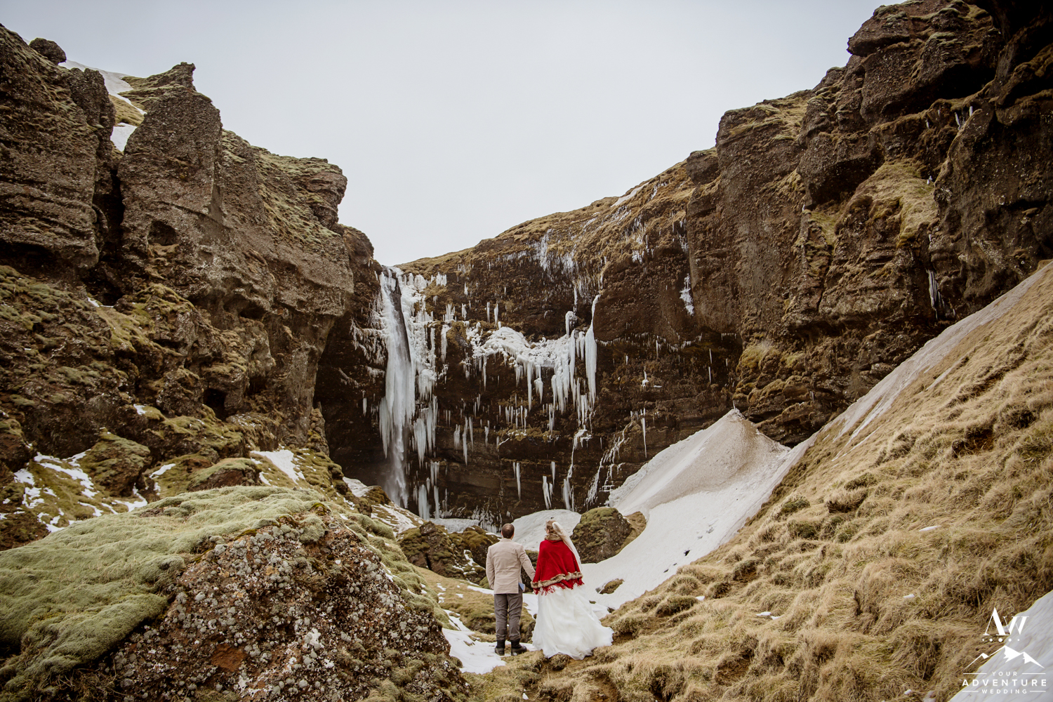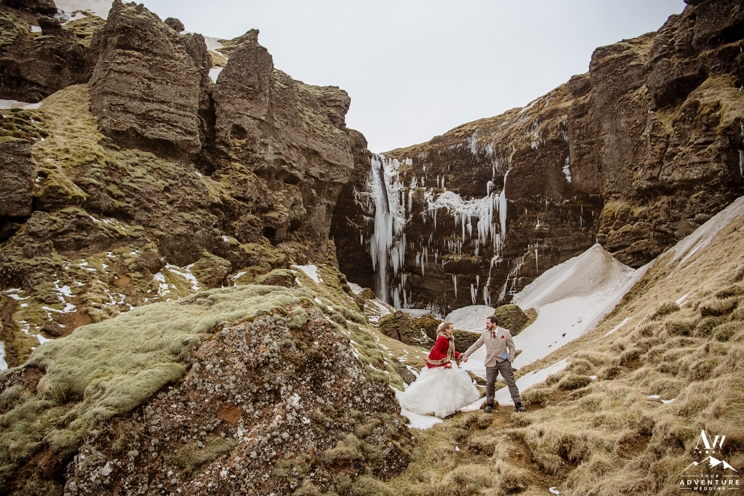 The ceremony concluded Stephanie and Andrew were ready to explore this sweet snow covered waterfall with their Iceland wedding photographer!
