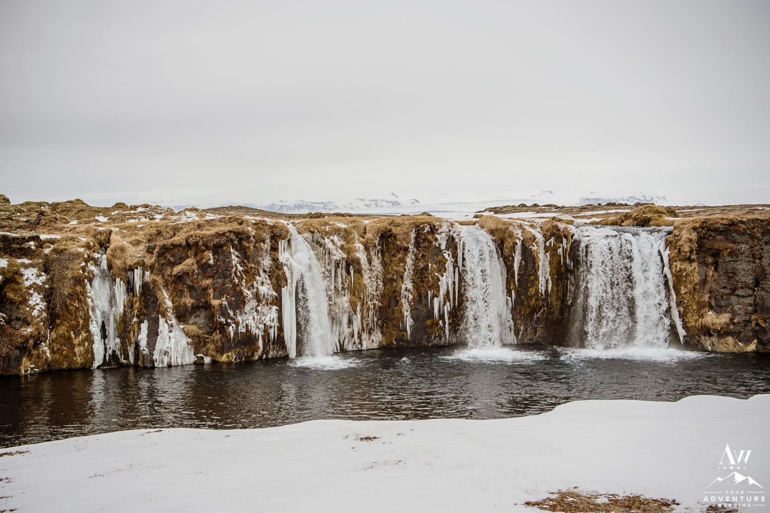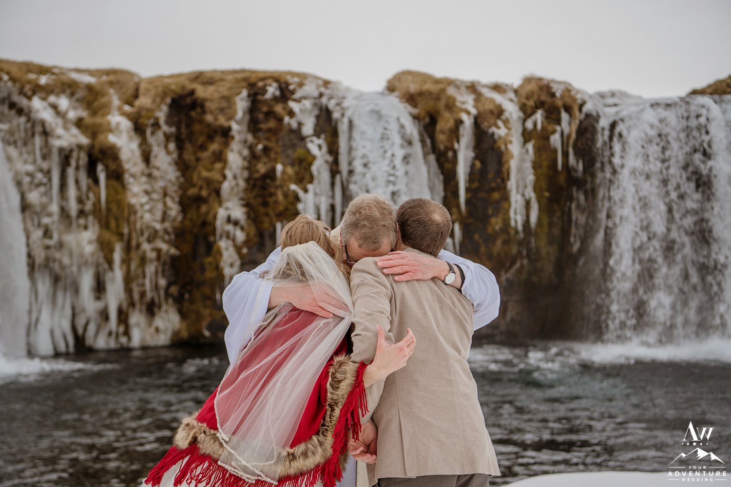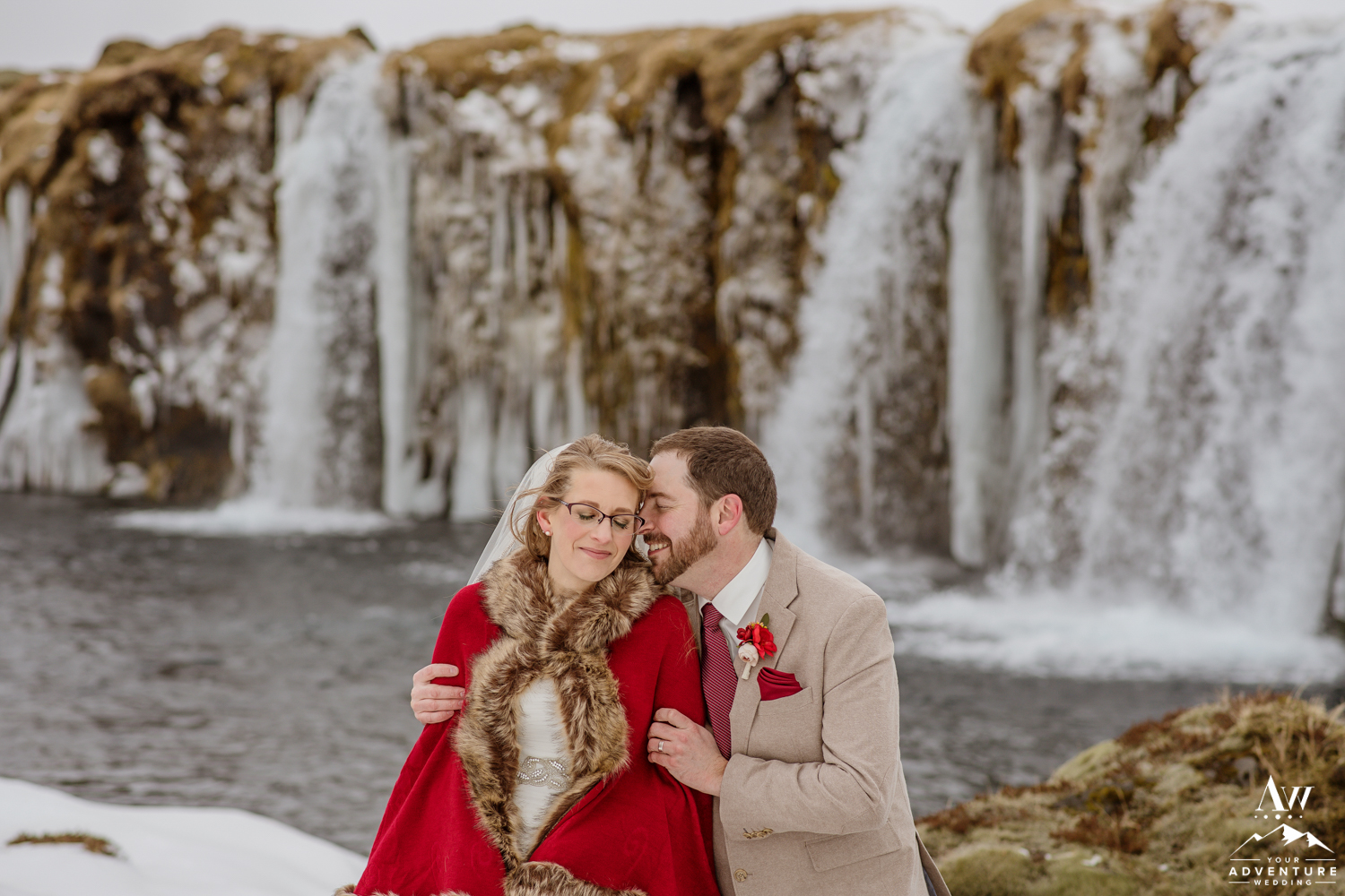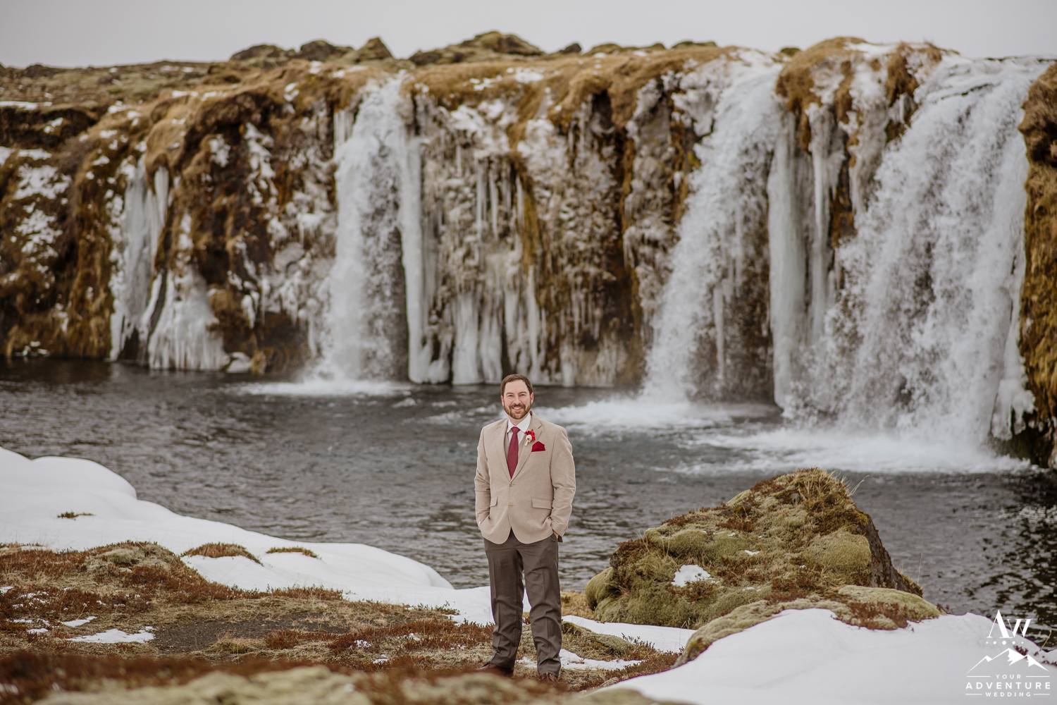 The ceremony concluded Stephanie and Andrew were ready to explore this sweet snow covered waterfall with their Iceland wedding photographer!