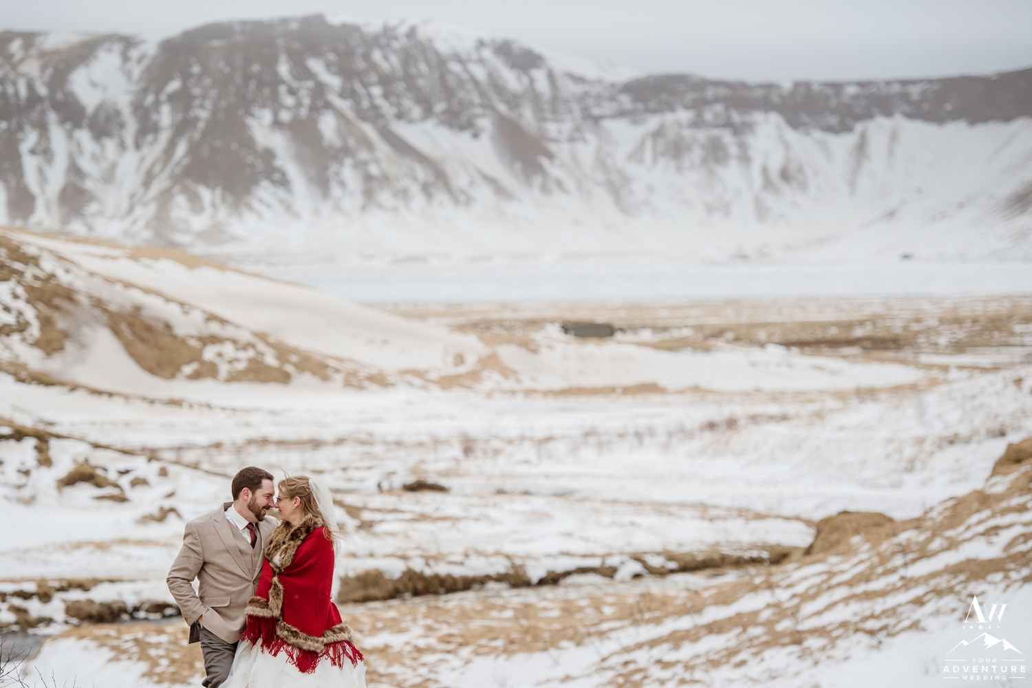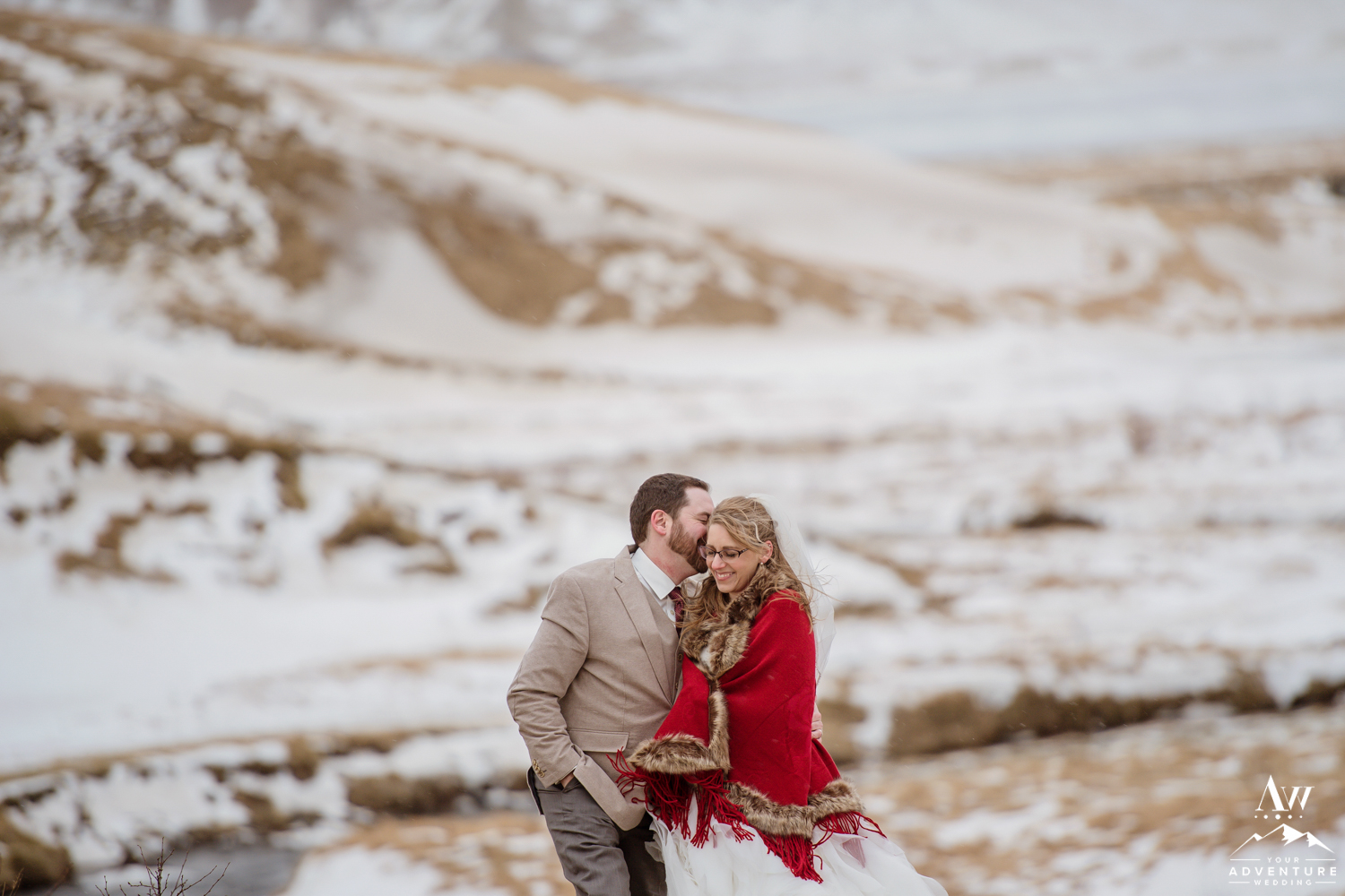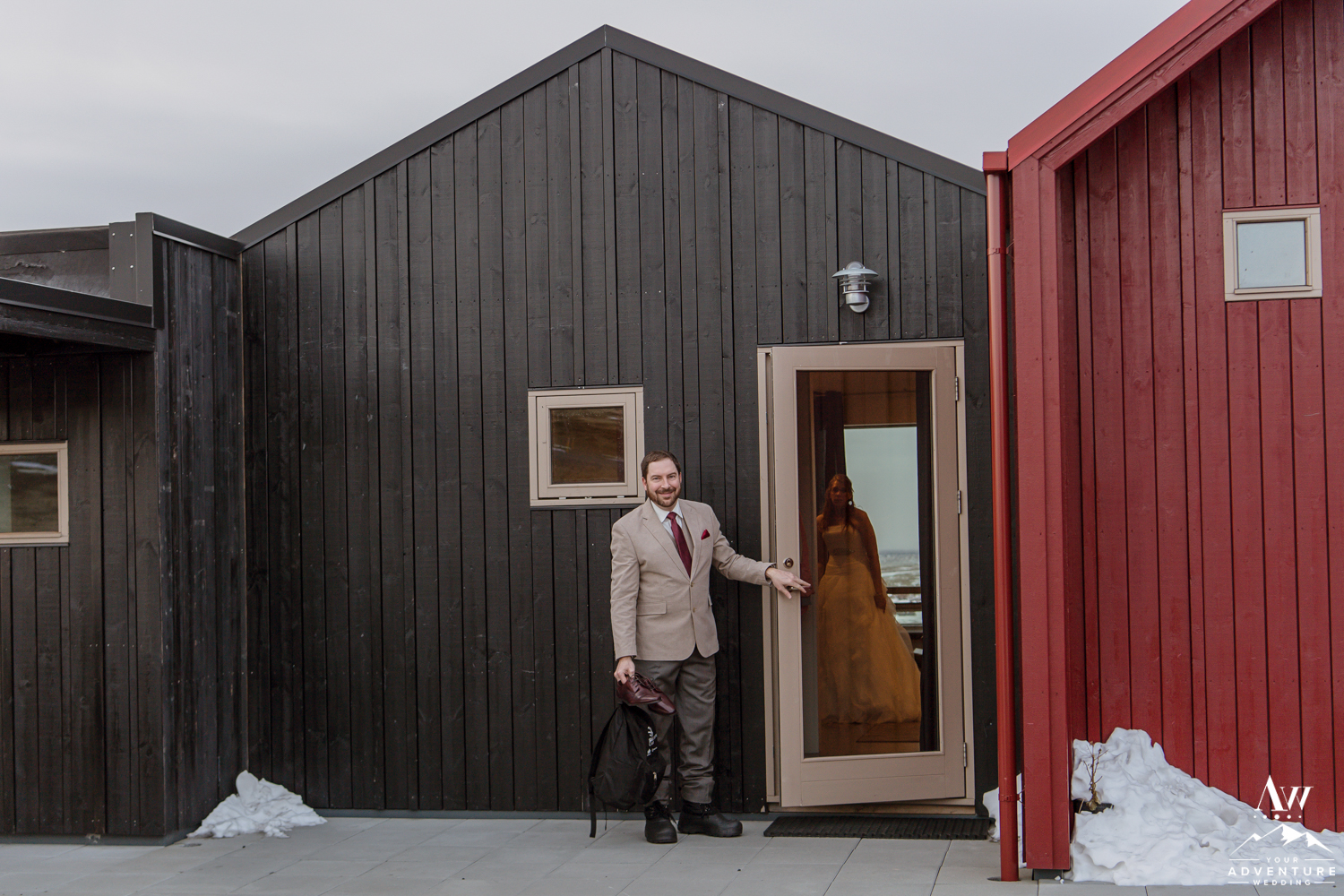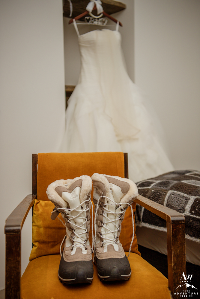 Our Iceland wedding photographer thoroughly enjoyed the details all around the property. She even found the sweetest spot to hang Stephanie’s Iceland wedding dress despite beginning in the dark! Stephanie was definitely prepared with her warm winter wedding boots and red shawl! Andrew’s awesome Iceland wedding groom details followed with his amazing tan suit. Our Iceland Wedding Planner team LOVED that these two wore some colors that would pop even if there would be a blizzard that snuck up at some point during the day!