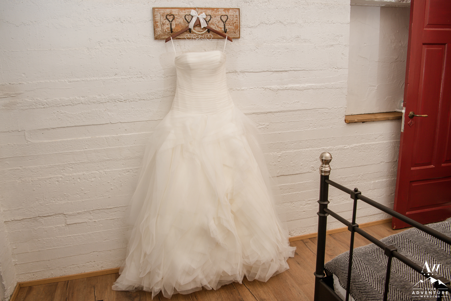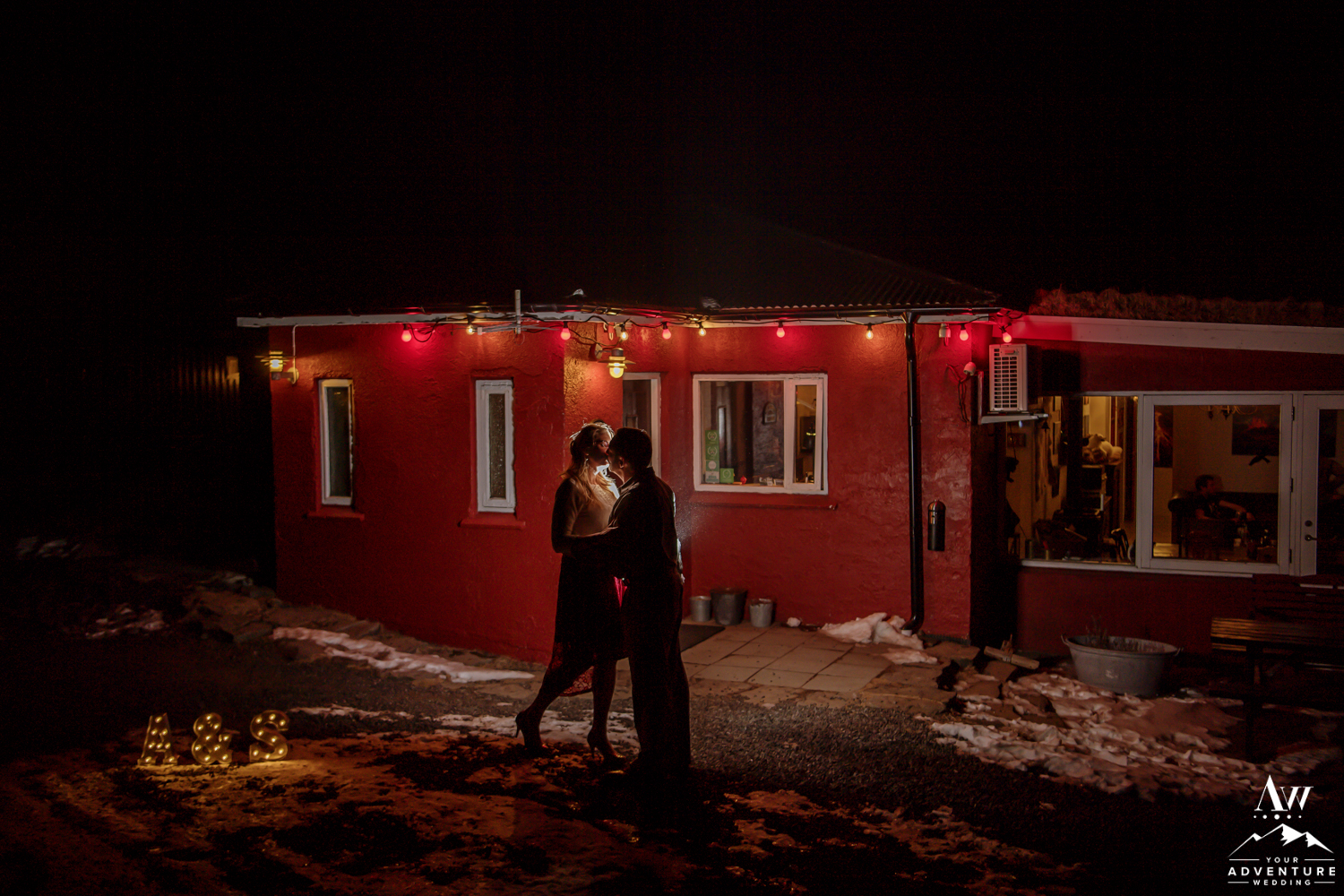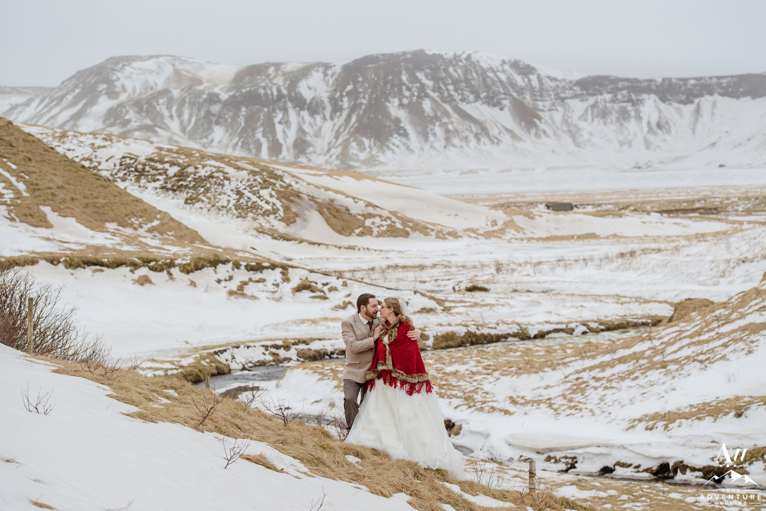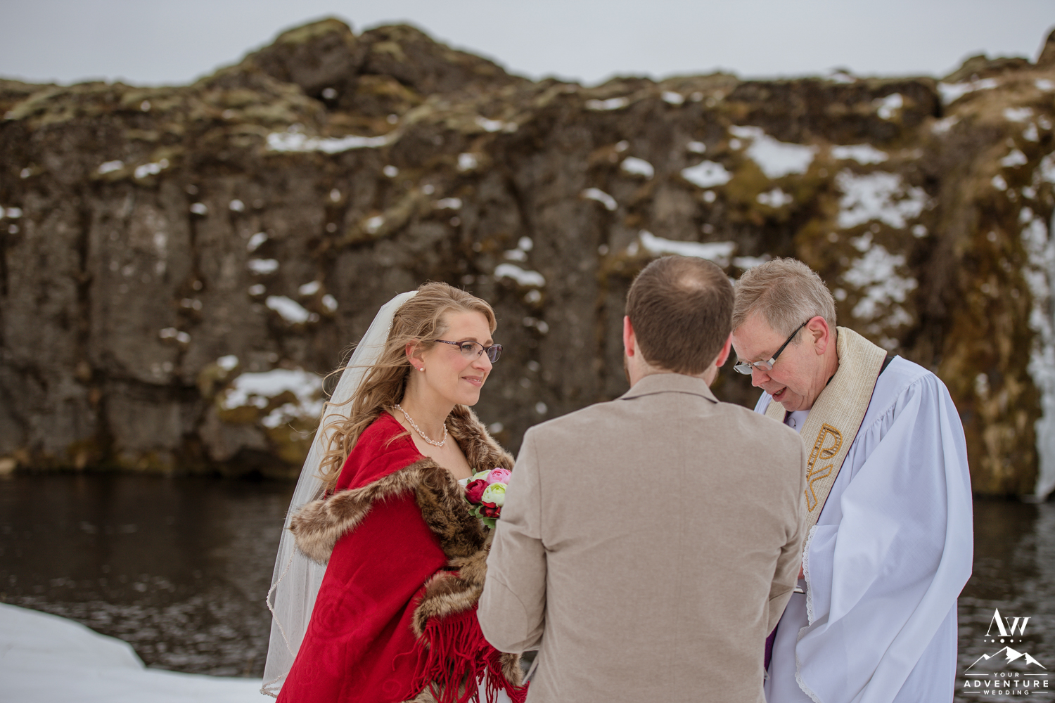 Our Iceland wedding photographer thoroughly enjoyed the details all around the property. She even found the sweetest spot to hang Stephanie’s Iceland wedding dress despite beginning in the dark! Stephanie was definitely prepared with her warm winter wedding boots and red shawl! Andrew’s awesome Iceland wedding groom details followed with his amazing tan suit. Our Iceland Wedding Planner team LOVED that these two wore some colors that would pop even if there would be a blizzard that snuck up at some point during the day!
