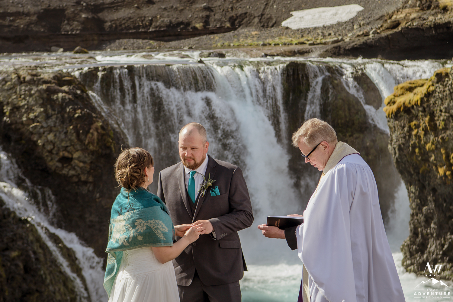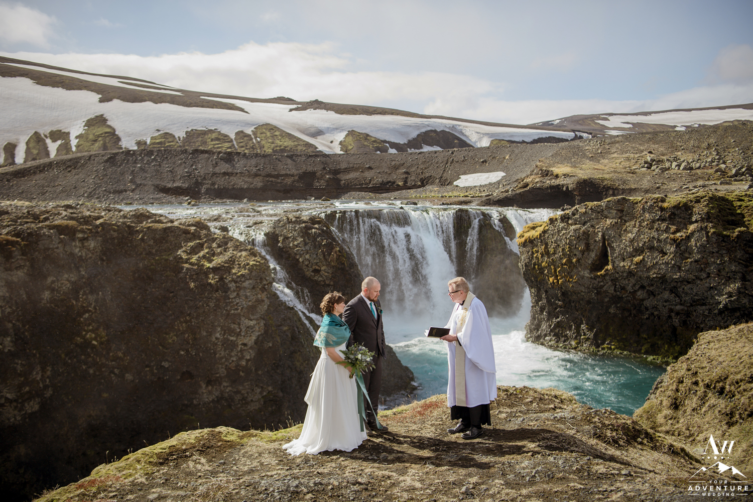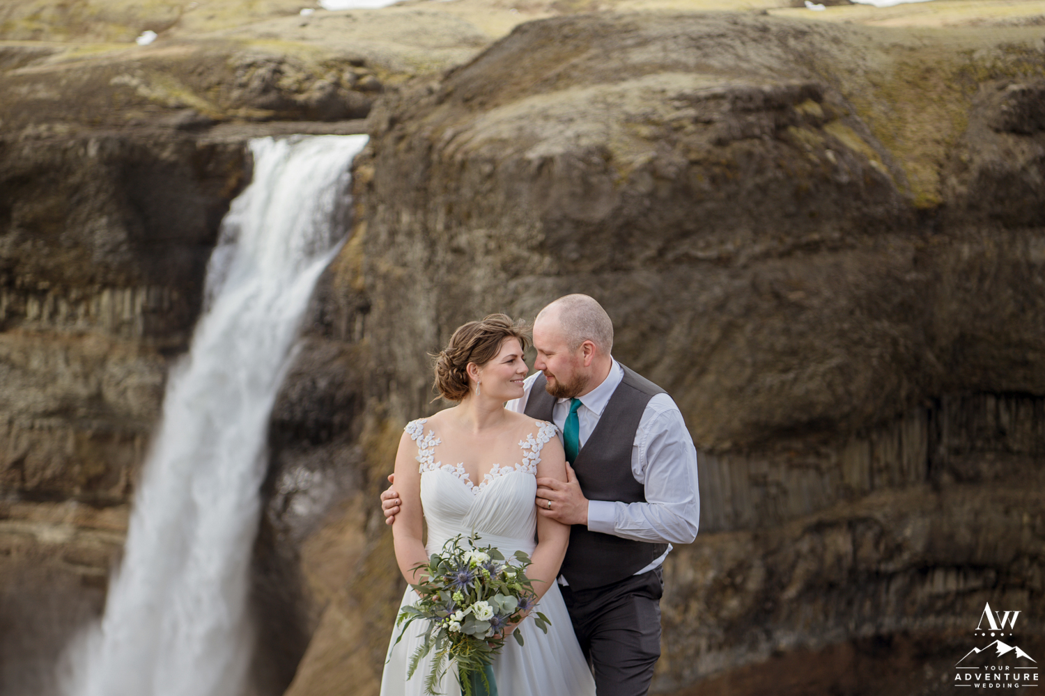Choosing your Iceland wedding ceremony location is one of the sweetest parts of the planning process, especially if you’re drawn to waterfalls.  Bonnie and Dennis were the first ever to marry at this secret highland waterfall and they looked so freaking good for their Iceland adventure wedding ceremony!  Pastor Egill crafted a super intimate Iceland wedding ceremony which also incorporated their mutual love in geology (aka love of rocks) where they had a “rock” unity ceremony. They each chose stones that represented themselves and they tossed in the river for the rocks to forever run next to each other.  DREAMY!