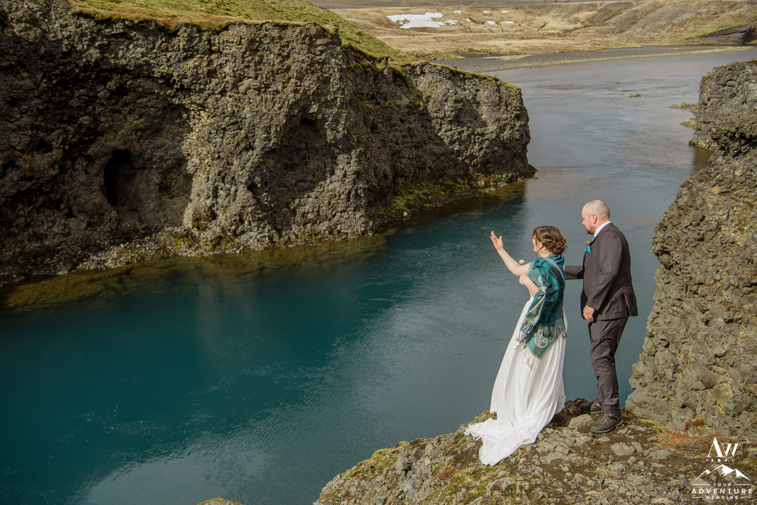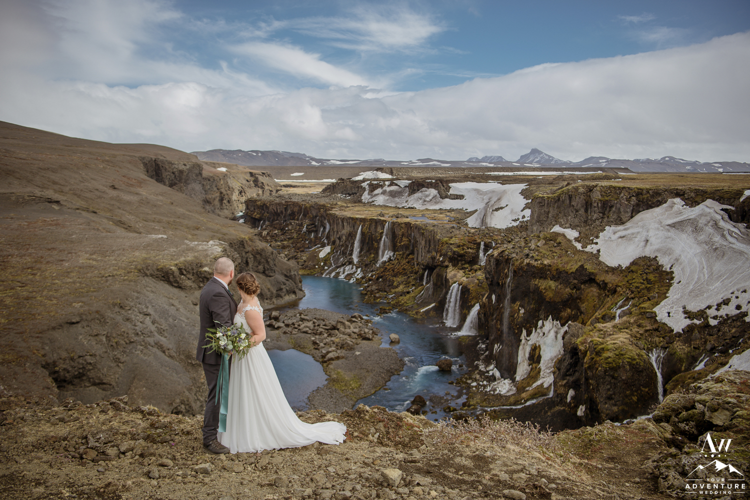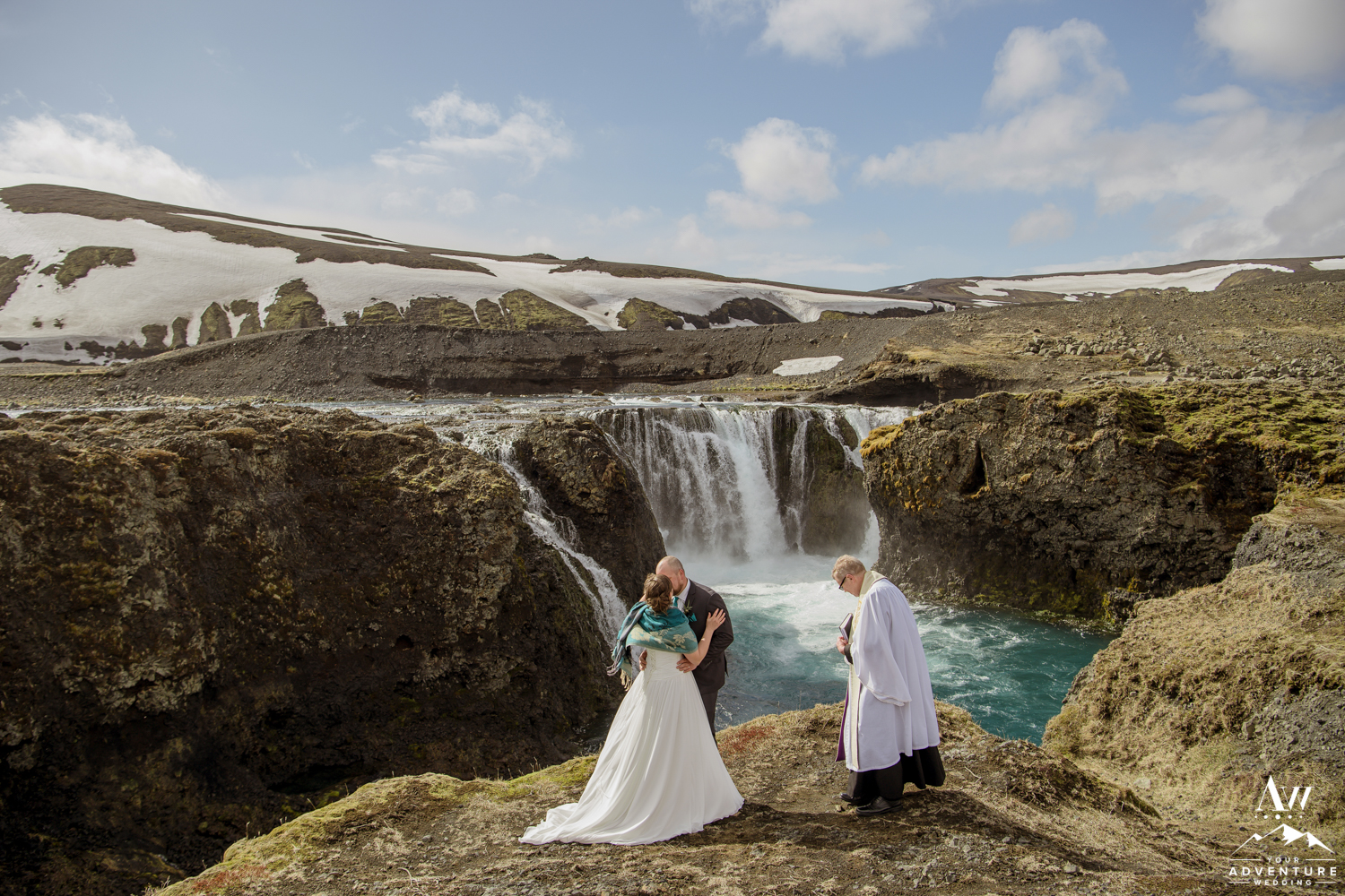 Choosing your Iceland wedding ceremony location is one of the sweetest parts of the planning process, especially if you’re drawn to waterfalls.  Bonnie and Dennis were the first ever to marry at this secret highland waterfall and they looked so freaking good for their Iceland adventure wedding ceremony!  Pastor Egill crafted a super intimate Iceland wedding ceremony which also incorporated their mutual love in geology (aka love of rocks) where they had a “rock” unity ceremony. They each chose stones that represented themselves and they tossed in the river for the rocks to forever run next to each other.  DREAMY!