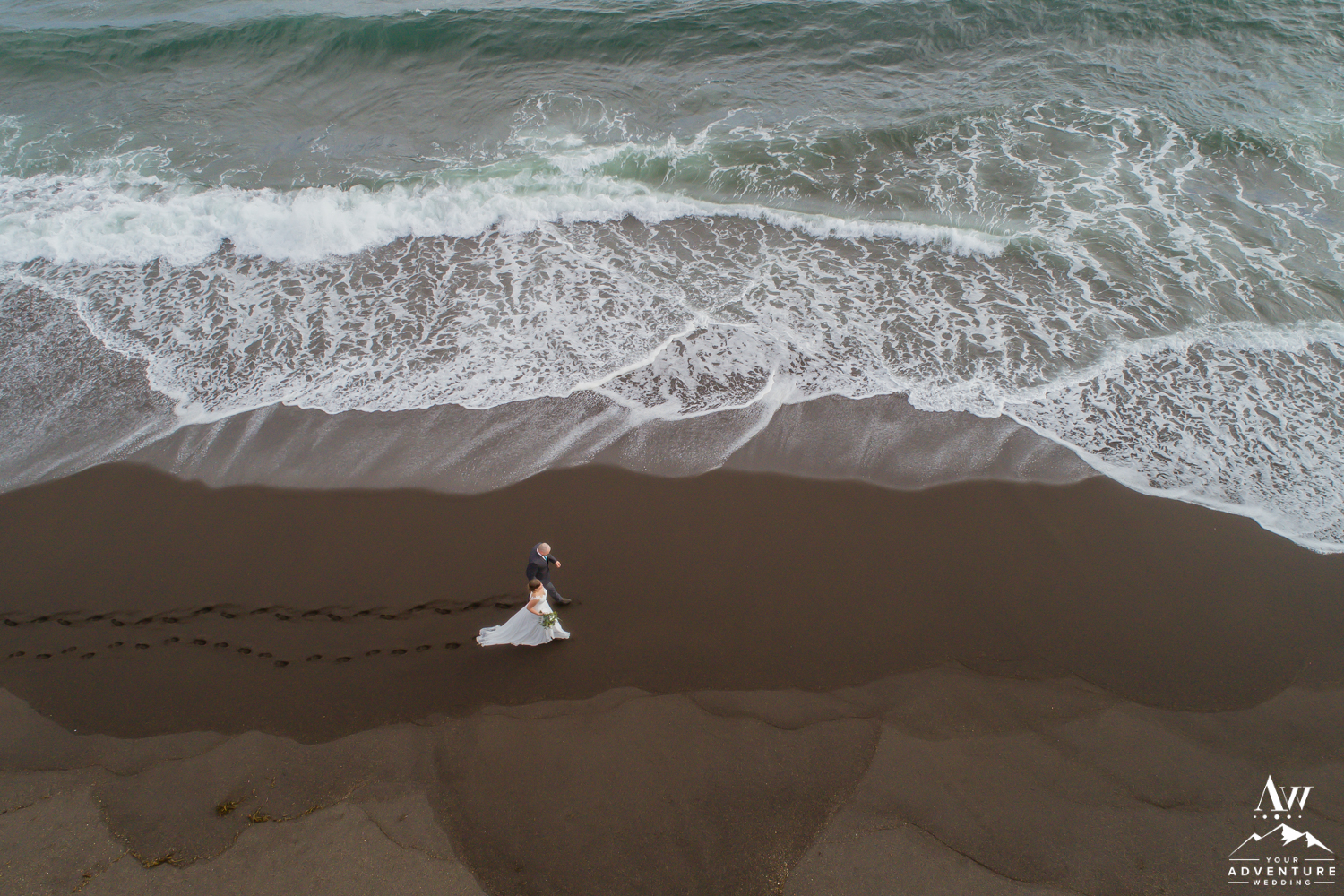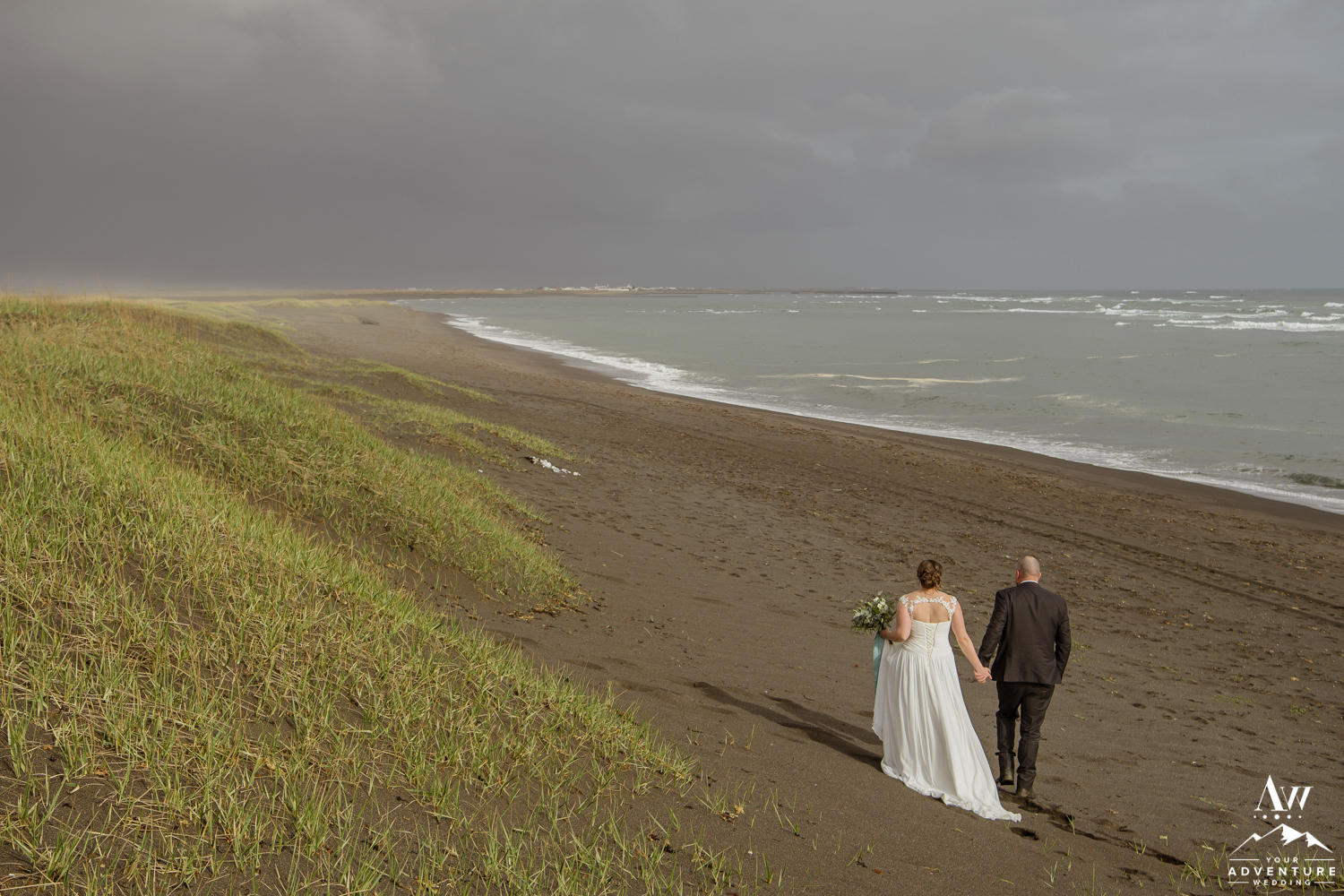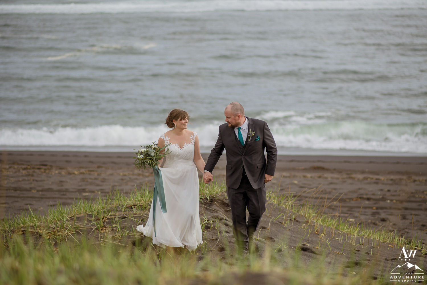 Black sand beaches are a thing here in case you hadn’t realized it.  Iceland is chock-full of volcanic landscape leaving most of the beaches full of black sand versus golden or white.  Bonnie and Dennis thoroughly enjoyed running around exploring these black sand dunes getting Iceland wedding photos taken.  This fabulous place was the last location stop during their Iceland adventure wedding.  One of our all time favorite Iceland wedding photos is below… it reminds us truly how small we are next to the endless ocean!