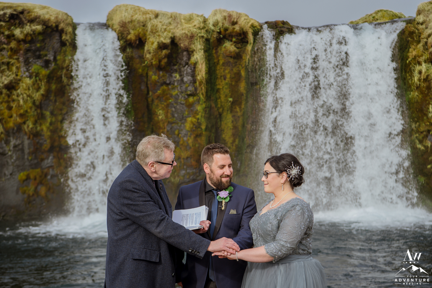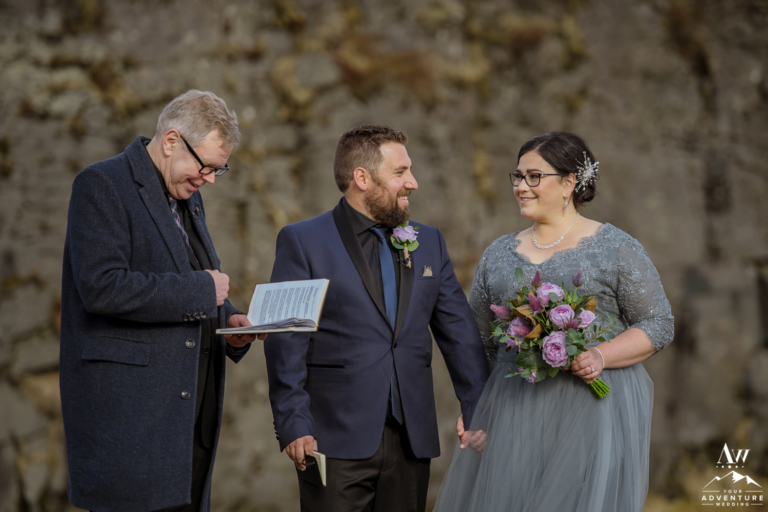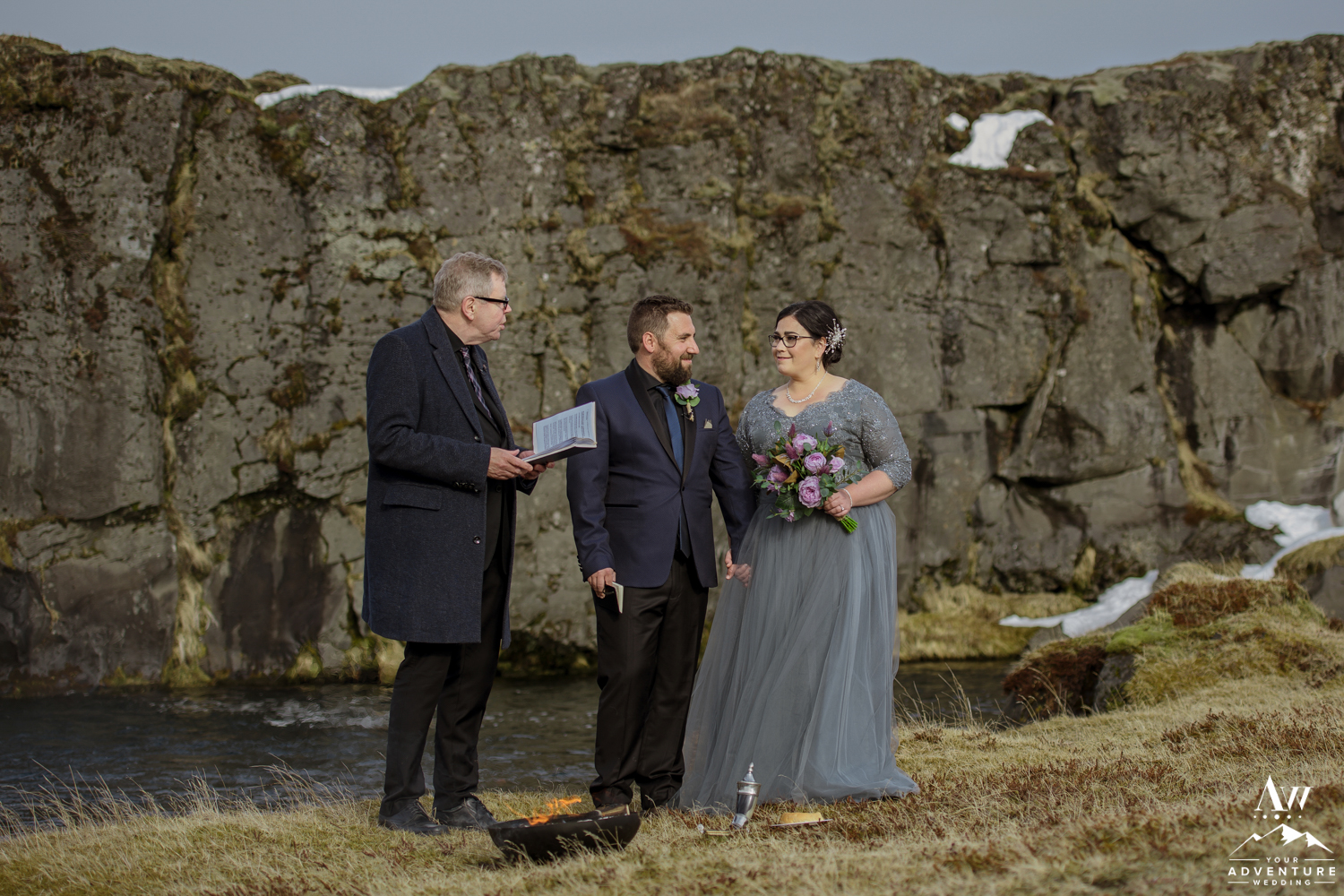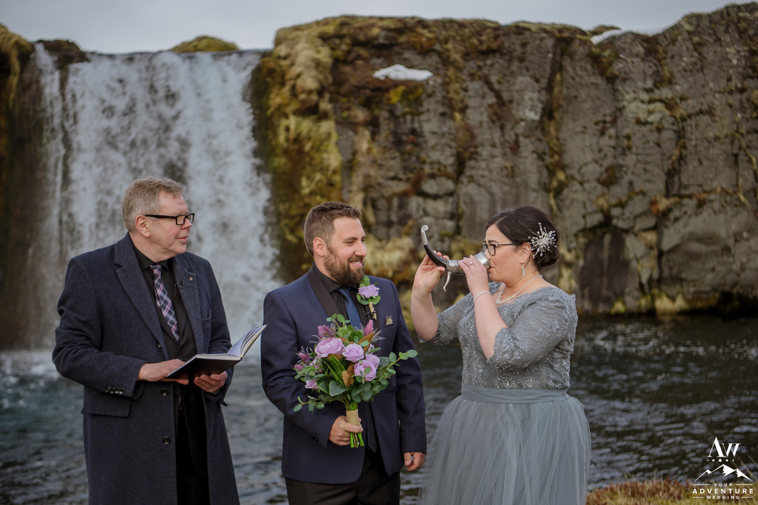 Arriving to their private waterfall ceremony location, Heather and Dane were awed by its beauty. Our Iceland Wedding Planner team took a couple of moments to setup a fire pit and get the Pastor in place. Pastor Egill had crafted the loveliest Iceland wedding ceremony that was truly unforgettable along with Heather and Dane’s vows to each other! Then before exchanging Iceland wedding rings, they took their first drink together our of a Norse horn and broke bread together signifying their lifetime bond together.