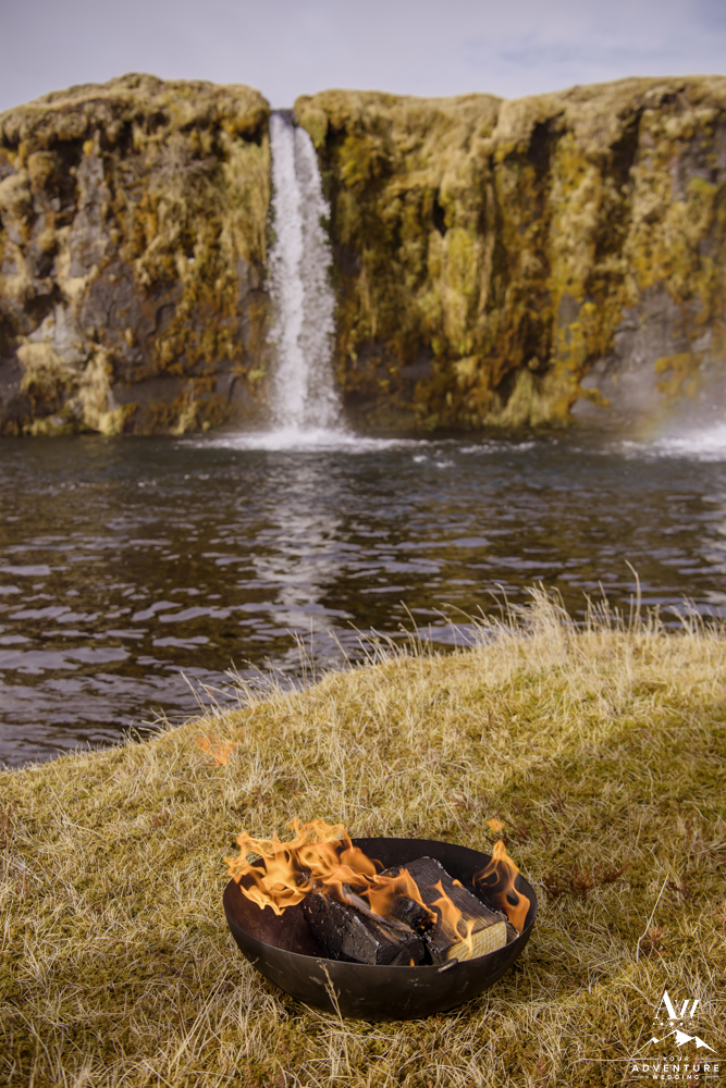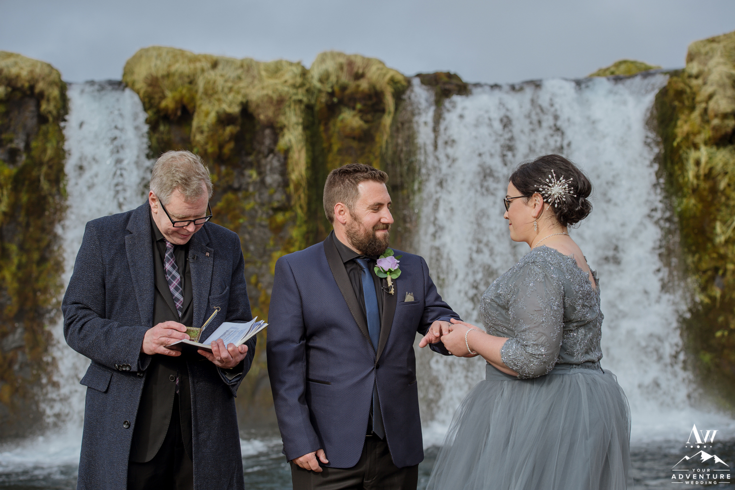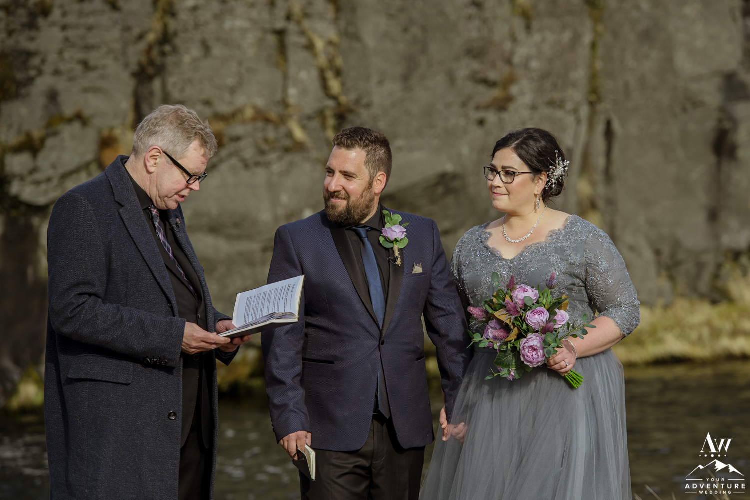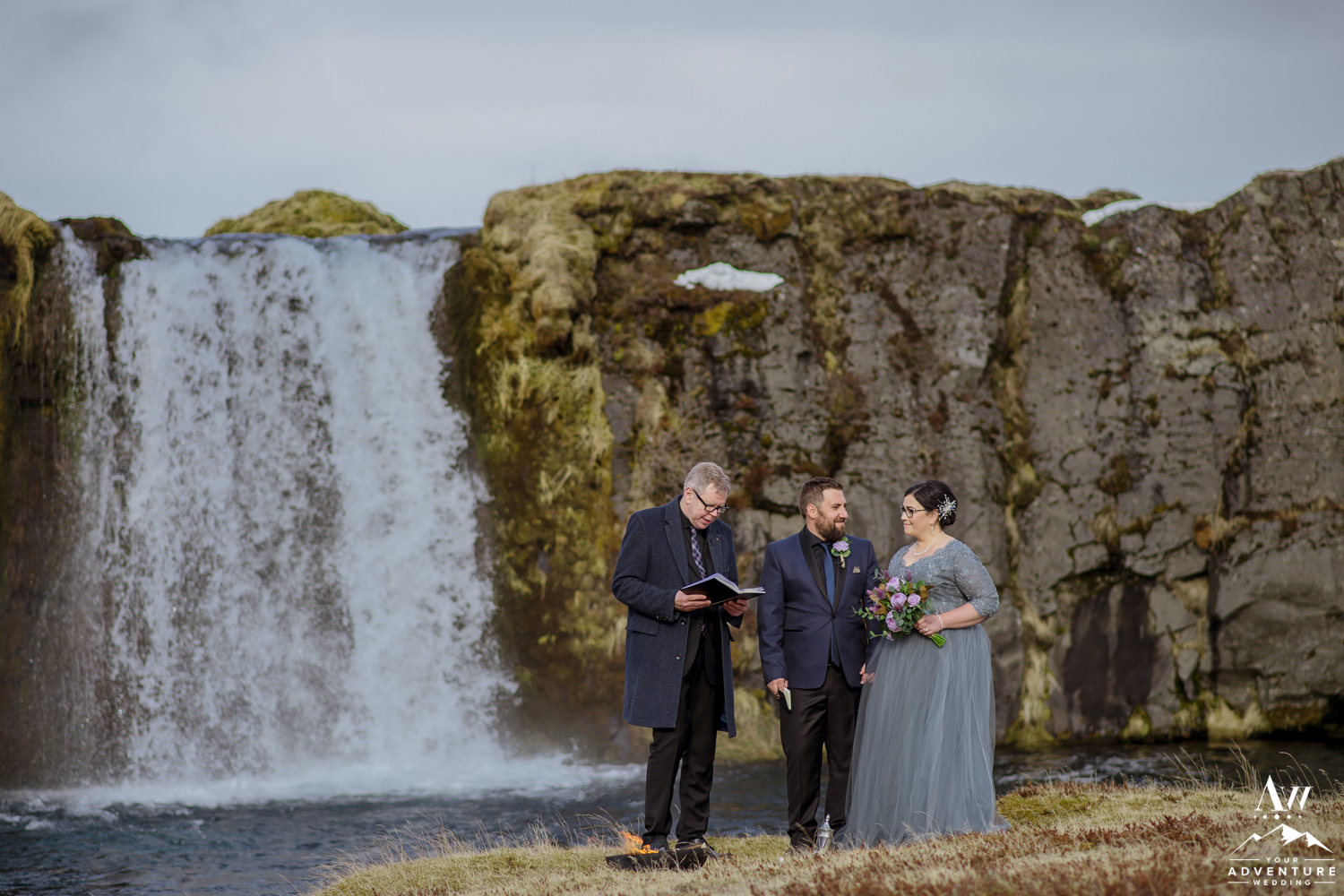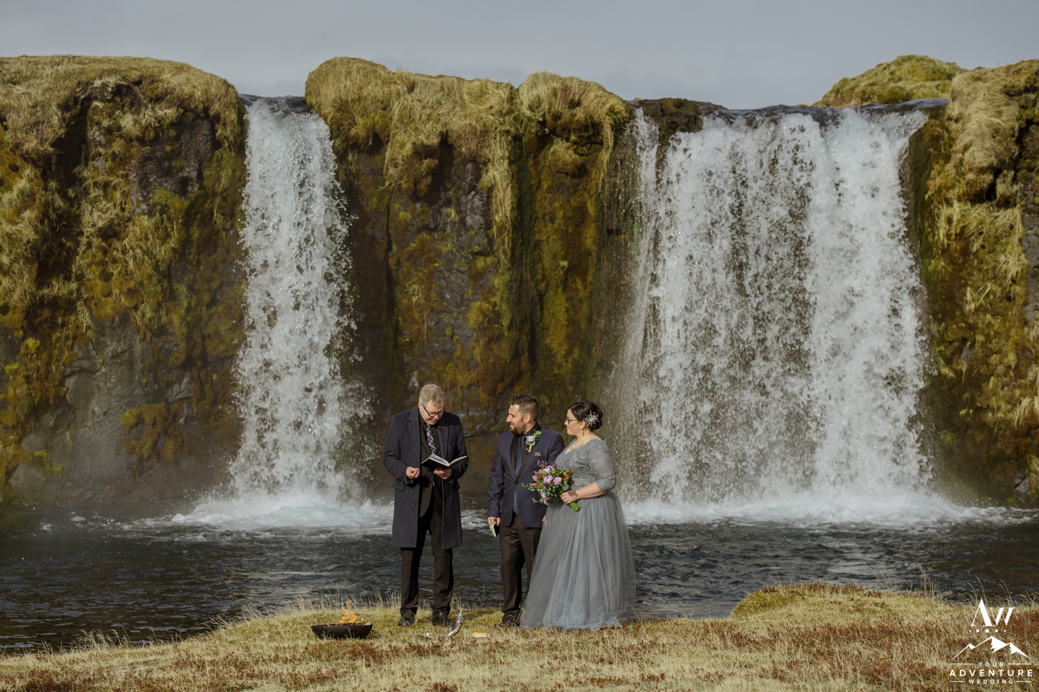 Arriving to their private waterfall ceremony location, Heather and Dane were awed by its beauty. Our Iceland Wedding Planner team took a couple of moments to setup a fire pit and get the Pastor in place. Pastor Egill had crafted the loveliest Iceland wedding ceremony that was truly unforgettable along with Heather and Dane’s vows to each other! Then before exchanging Iceland wedding rings, they took their first drink together our of a Norse horn and broke bread together signifying their lifetime bond together.
