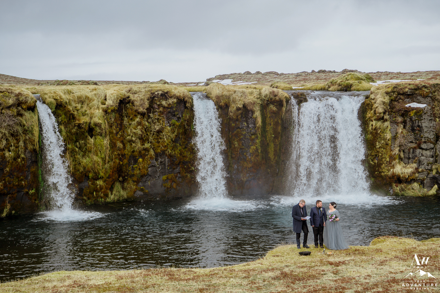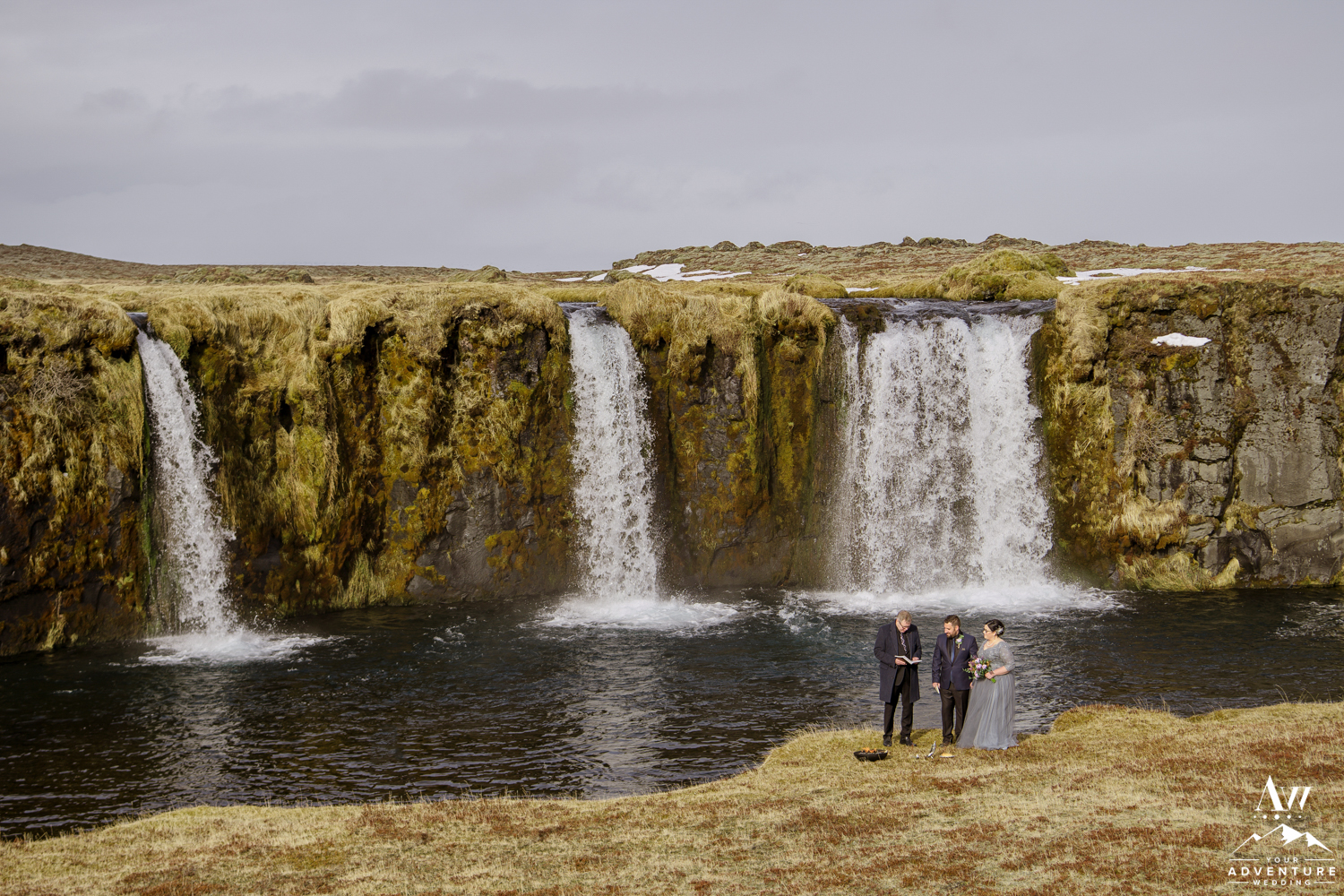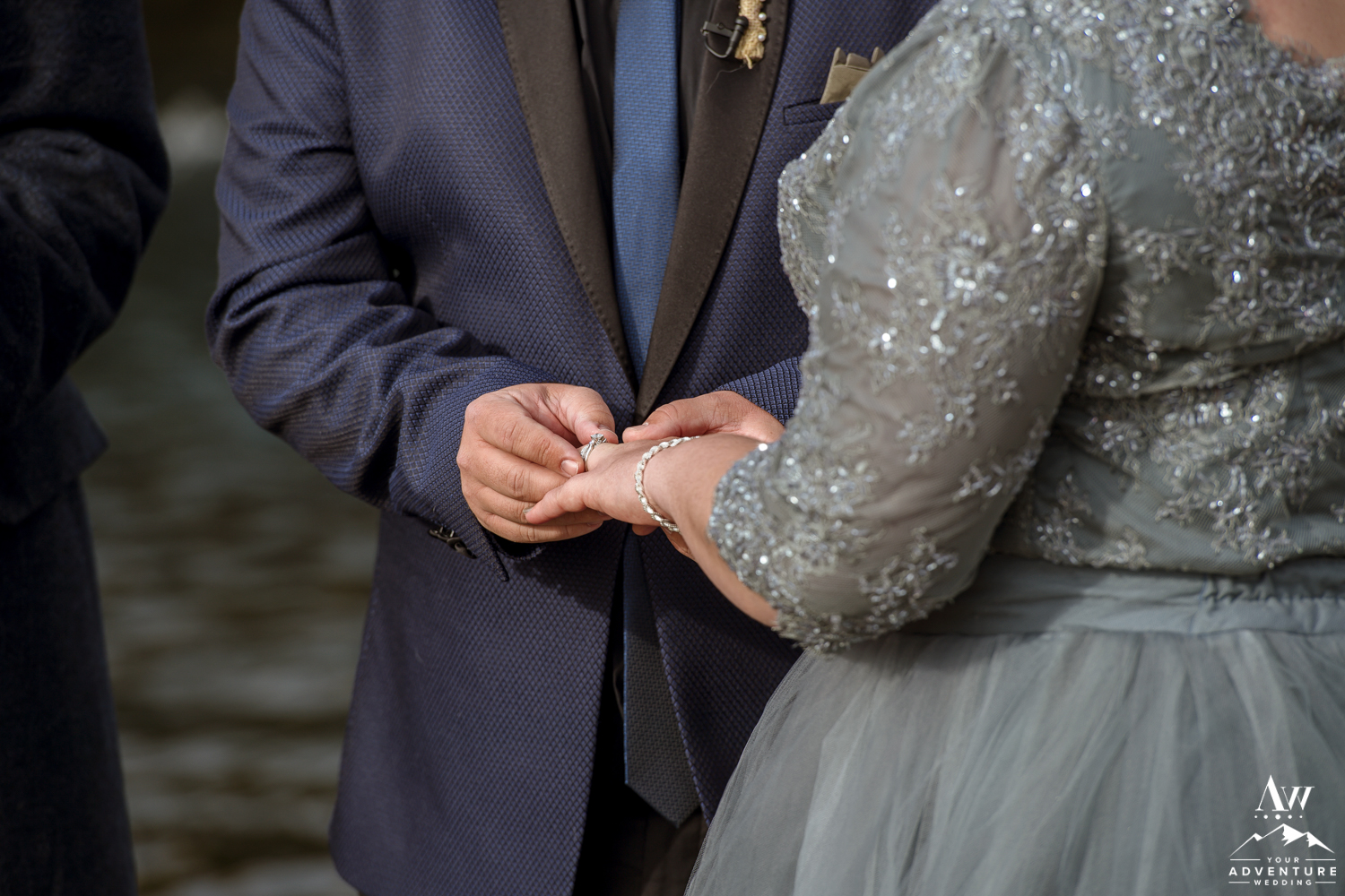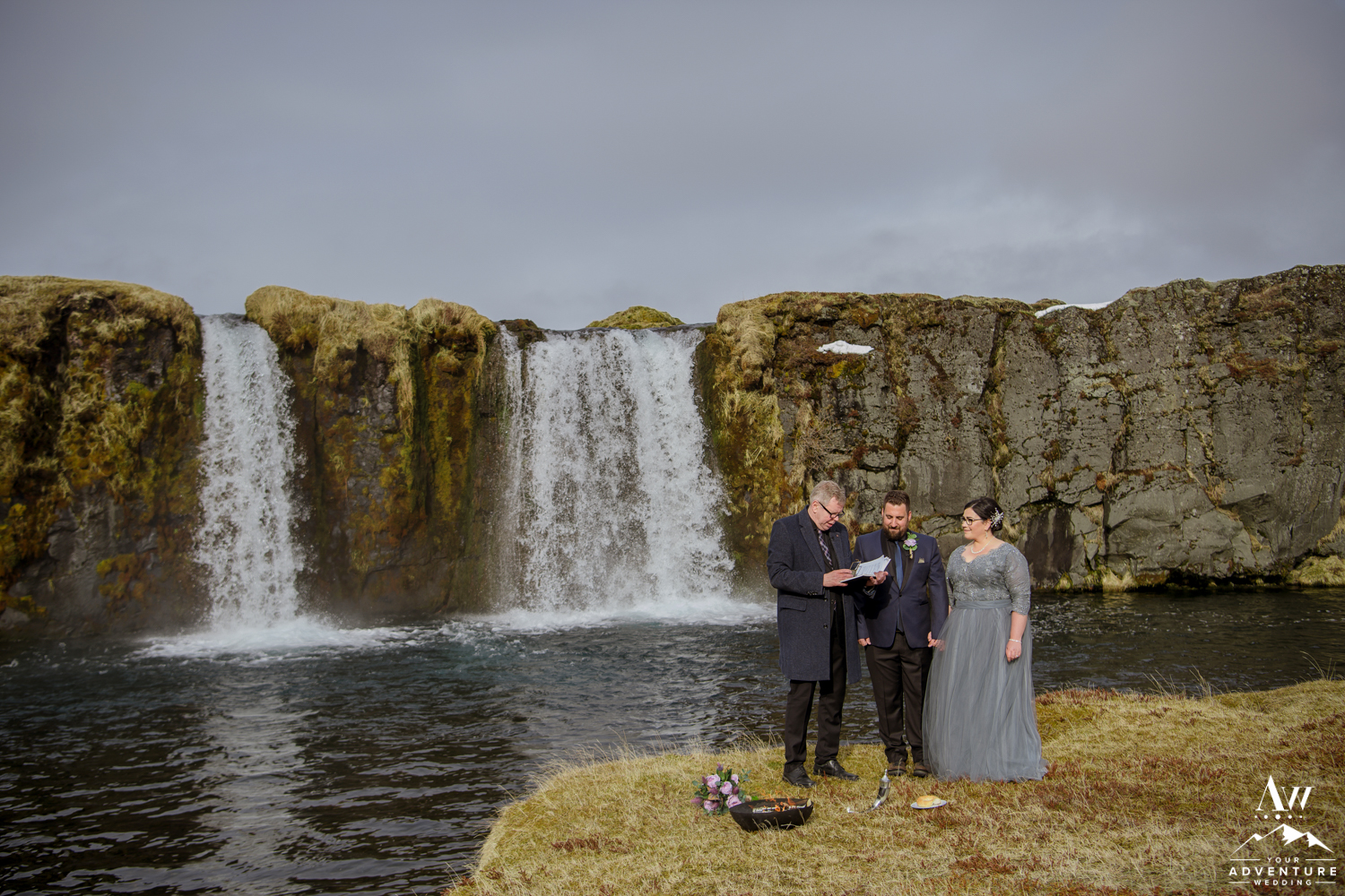 Arriving to their private waterfall ceremony location, Heather and Dane were awed by its beauty. Our Iceland Wedding Planner team took a couple of moments to setup a fire pit and get the Pastor in place. Pastor Egill had crafted the loveliest Iceland wedding ceremony that was truly unforgettable along with Heather and Dane’s vows to each other! Then before exchanging Iceland wedding rings, they took their first drink together our of a Norse horn and broke bread together signifying their lifetime bond together.