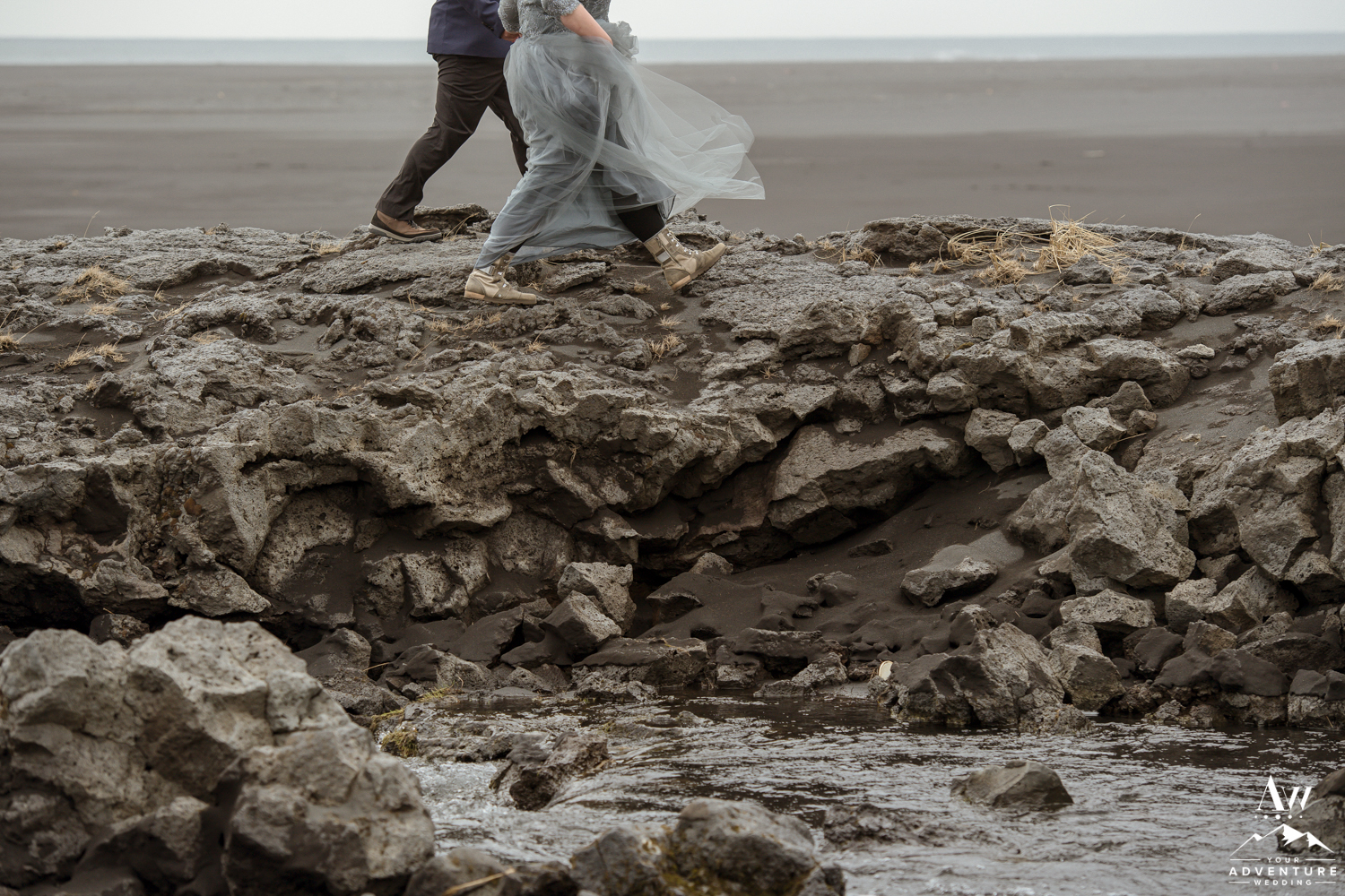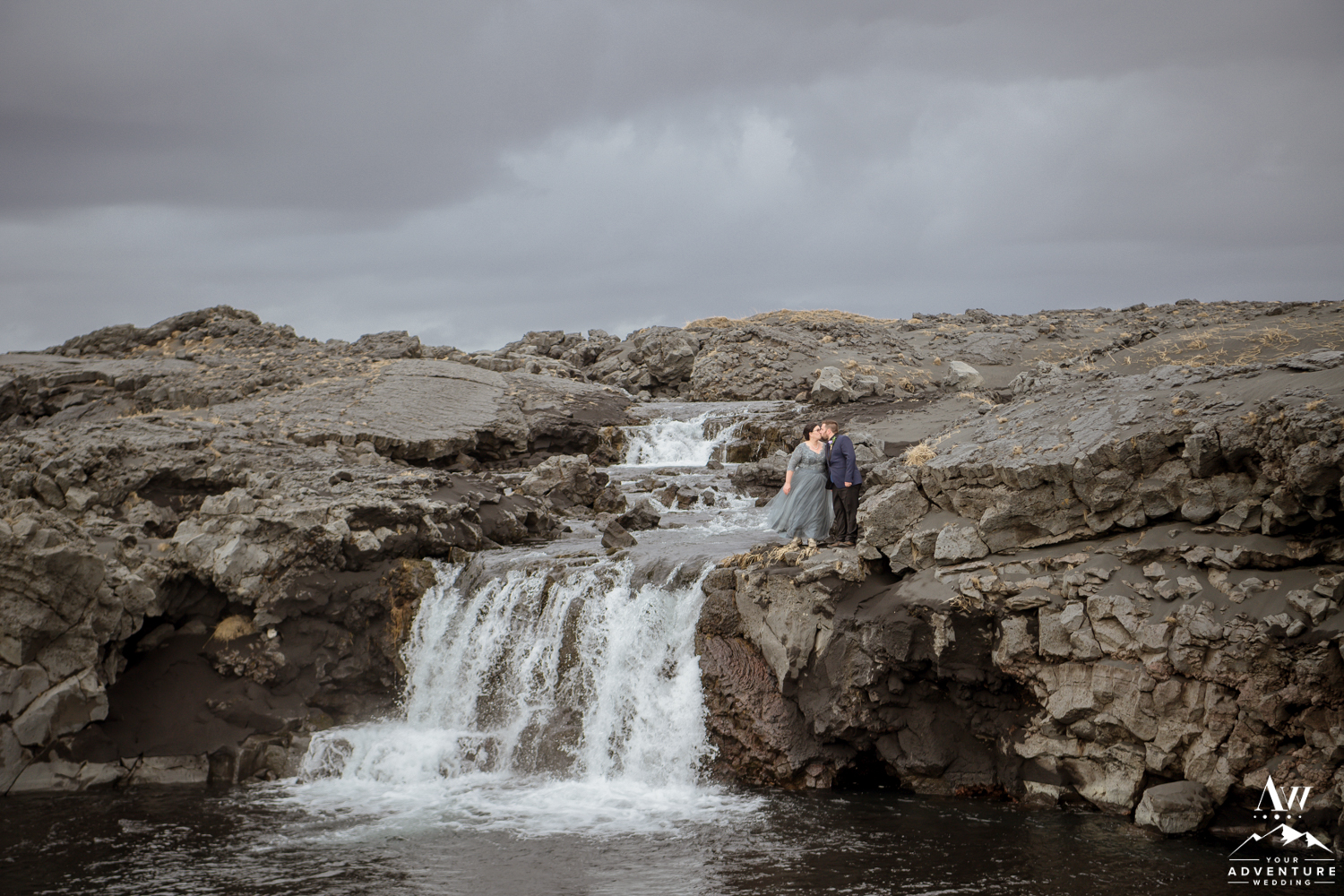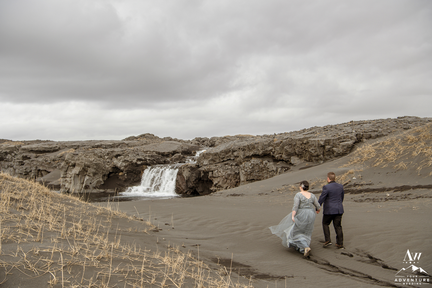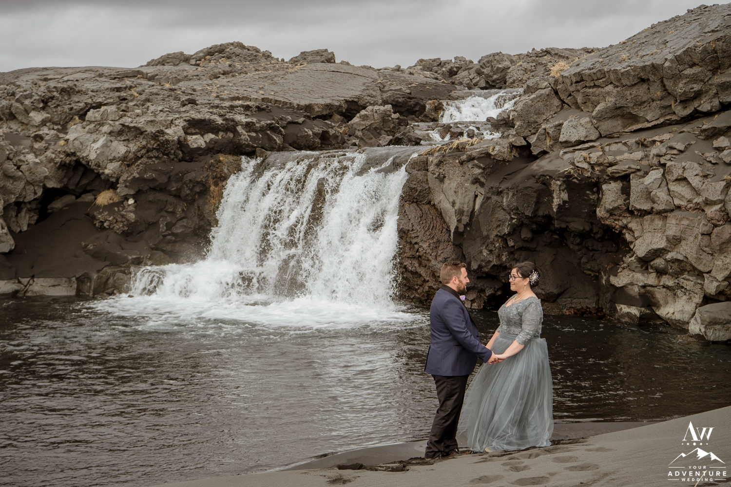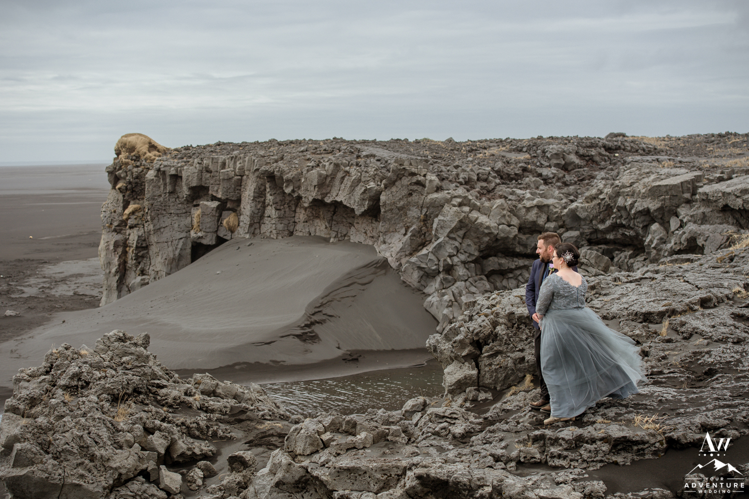 The last exciting stop on Heather and Dane’s adventurous elopement in Iceland was one of our favorite spots that when we say it out-loud feels like it’s unreal… A black sand lava rock waterfall. Say what?! I know, only in Iceland! This spectacular Iceland wedding location complimented Heather’s gray Iceland wedding dress really well too!