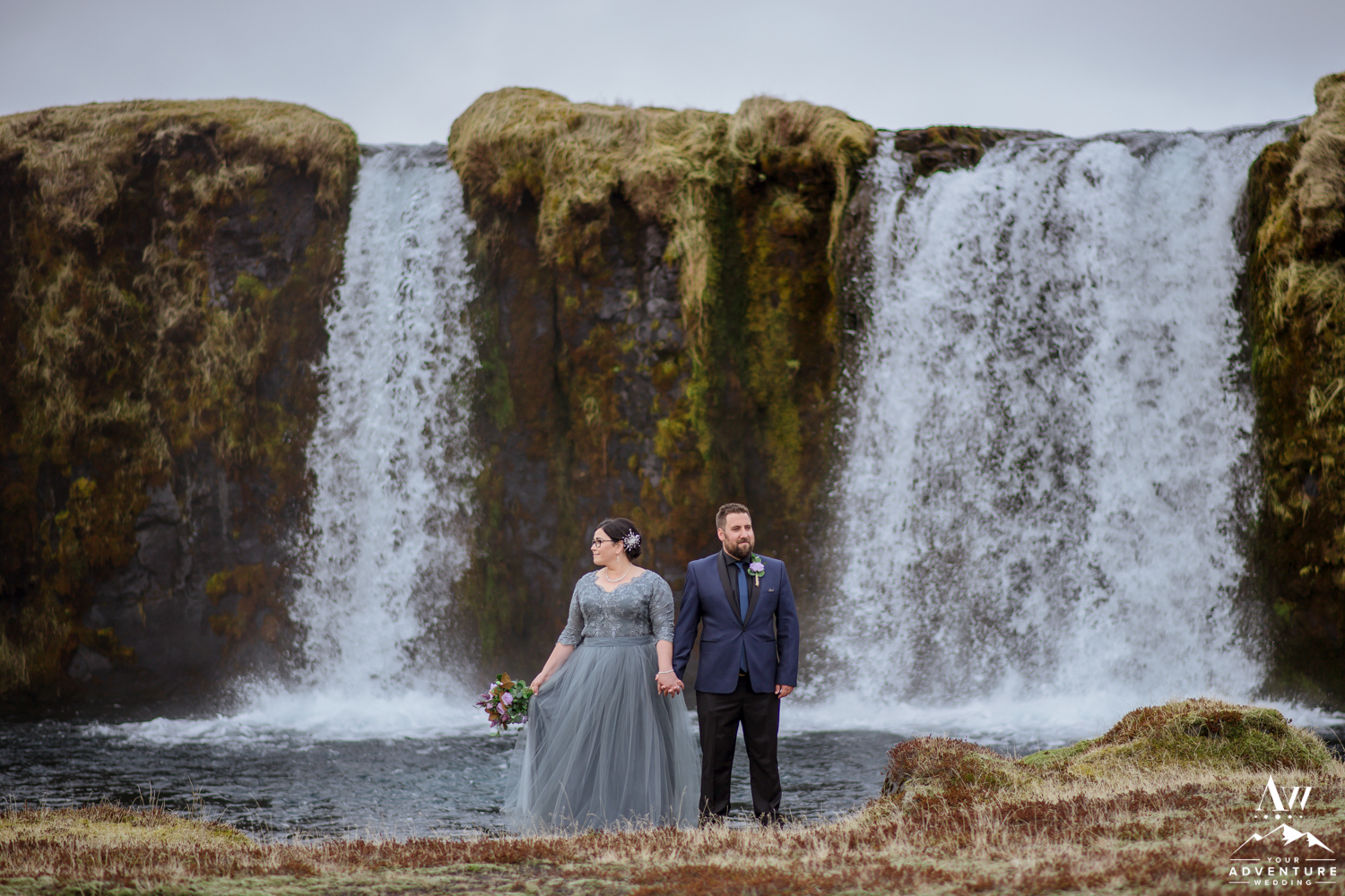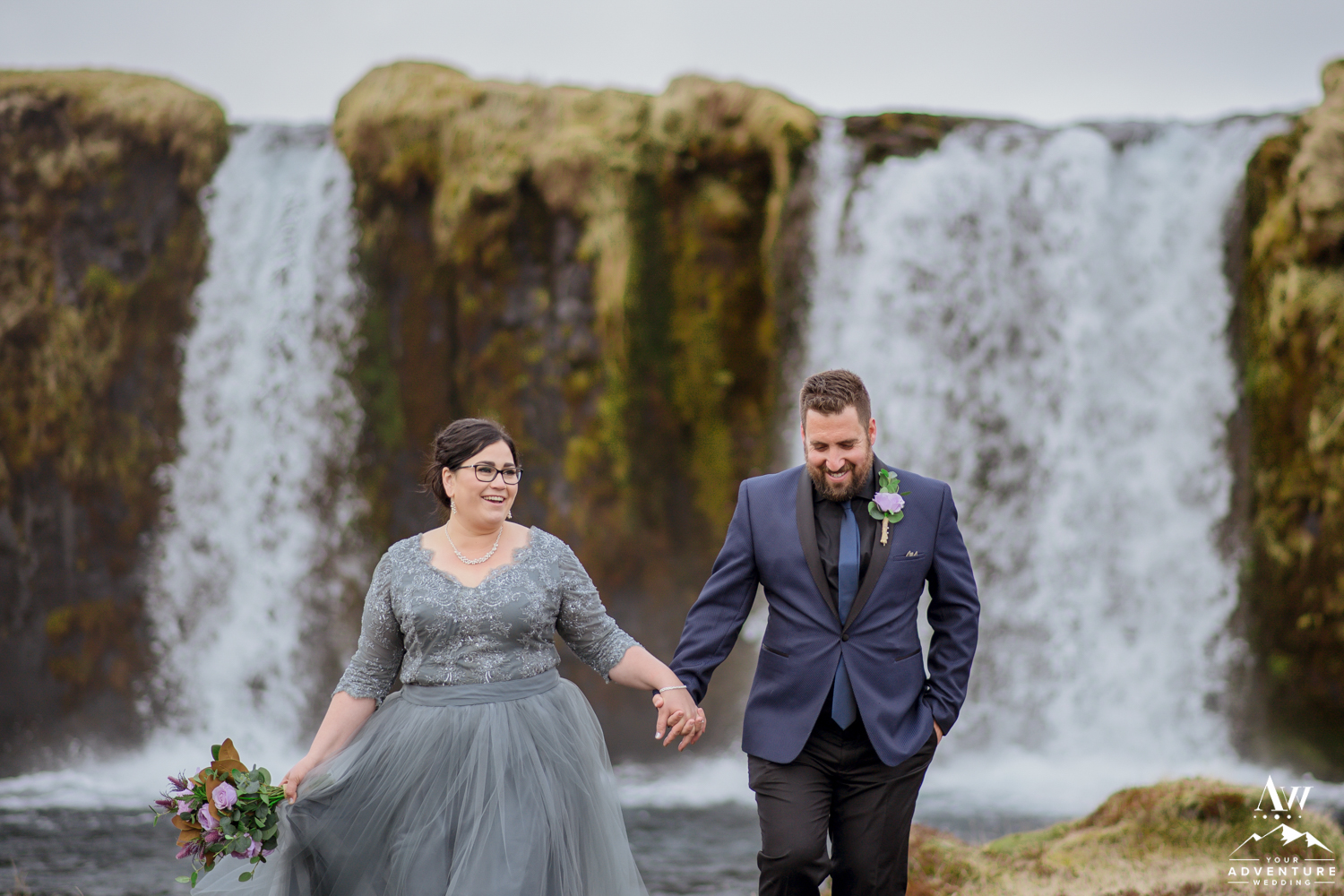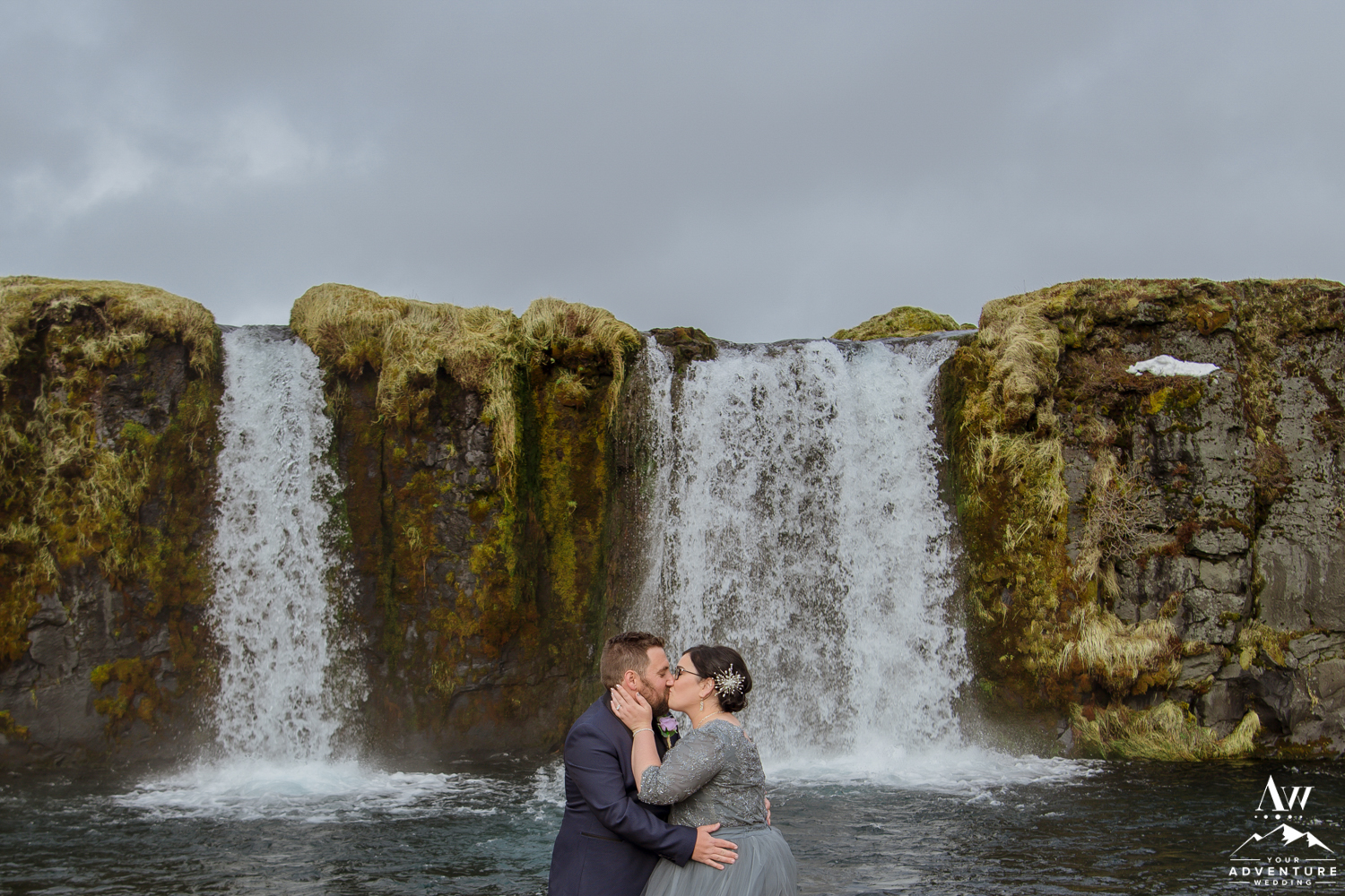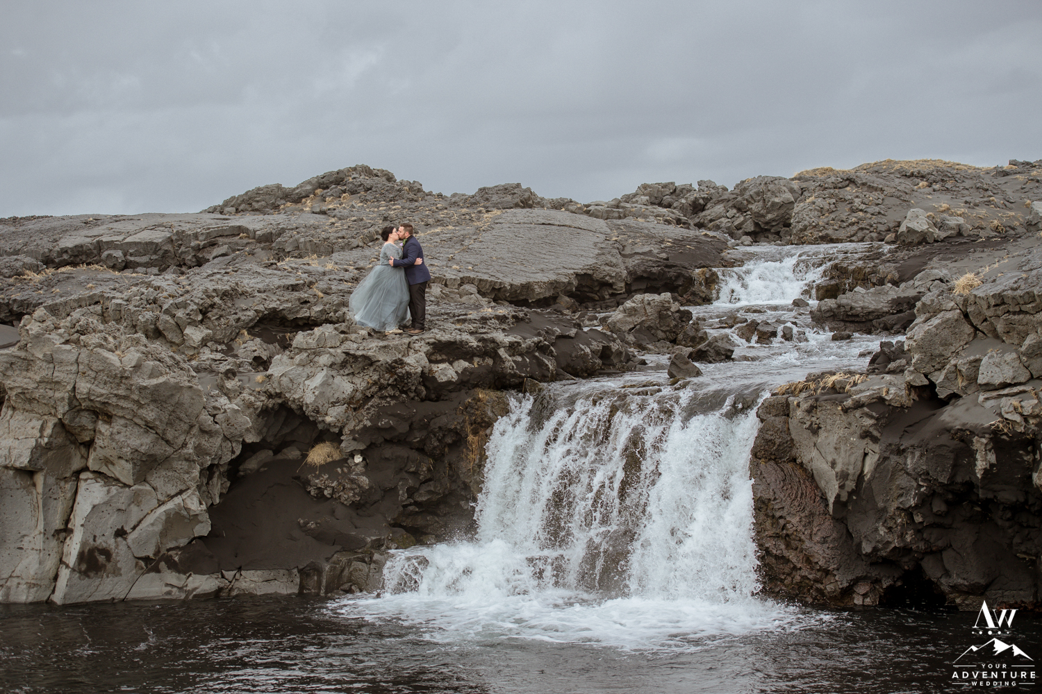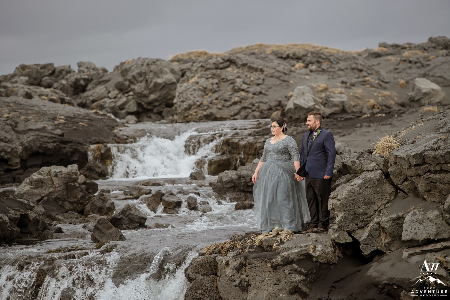 The last exciting stop on Heather and Dane’s adventurous elopement in Iceland was one of our favorite spots that when we say it out-loud feels like it’s unreal… A black sand lava rock waterfall. Say what?! I know, only in Iceland! This spectacular Iceland wedding location complimented Heather’s gray Iceland wedding dress really well too!