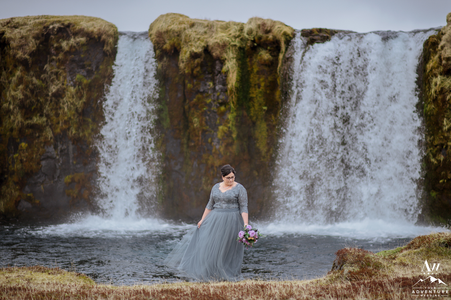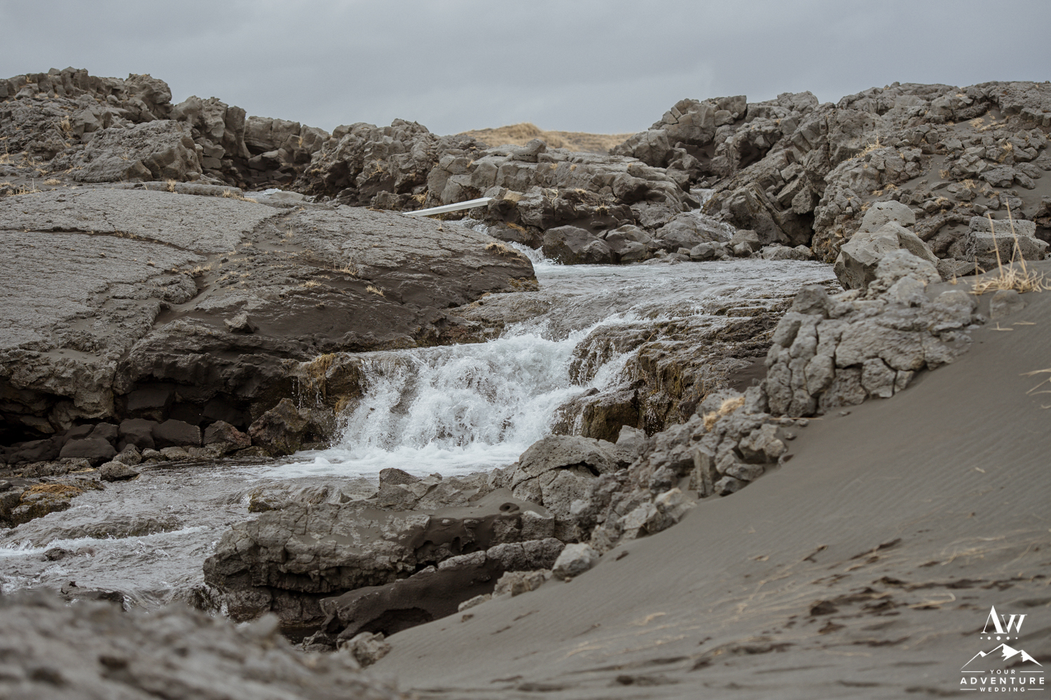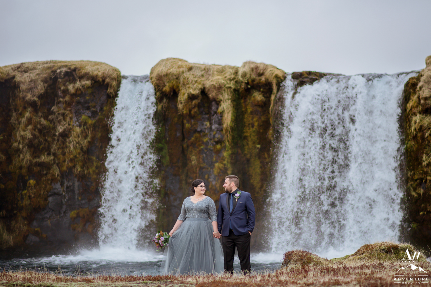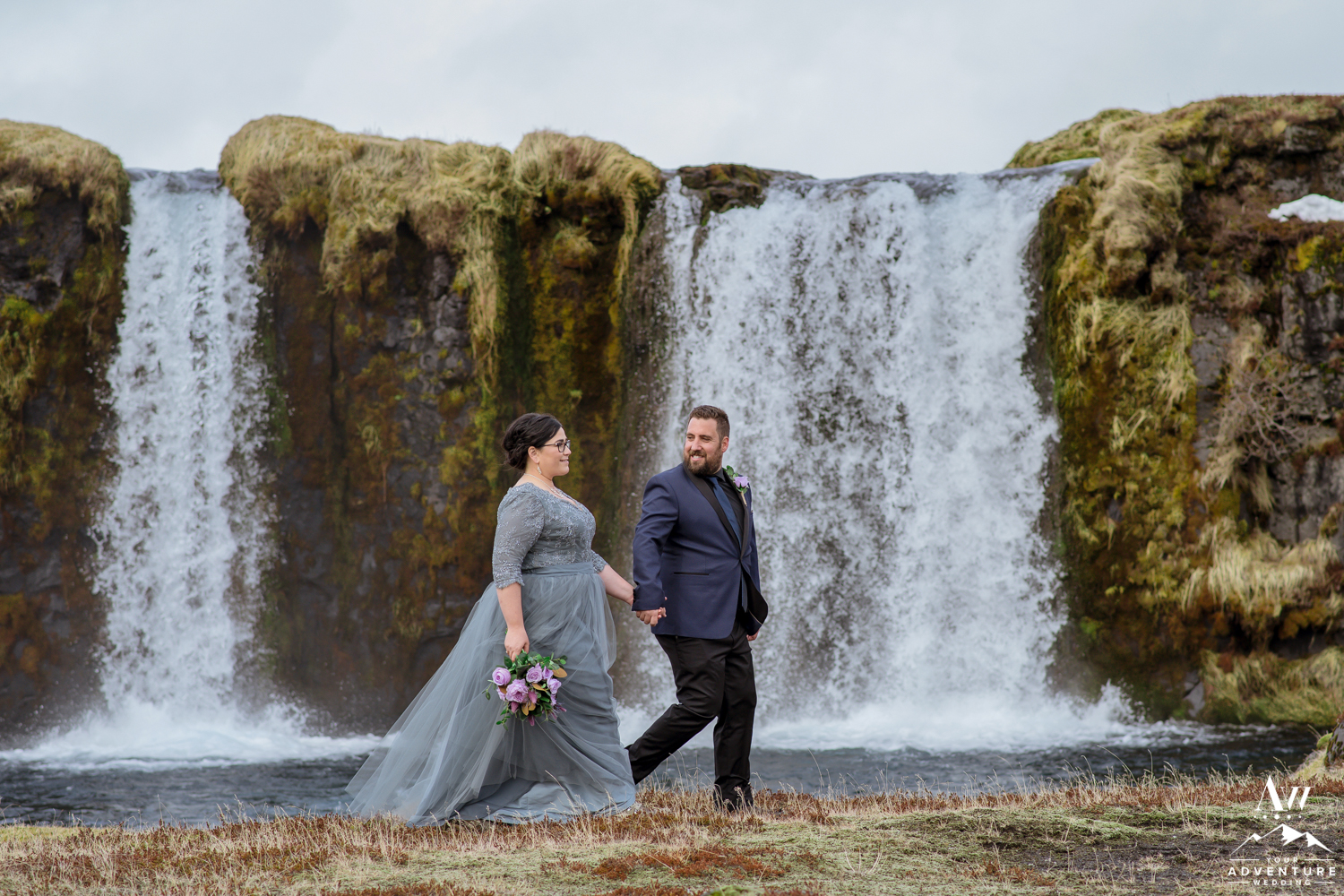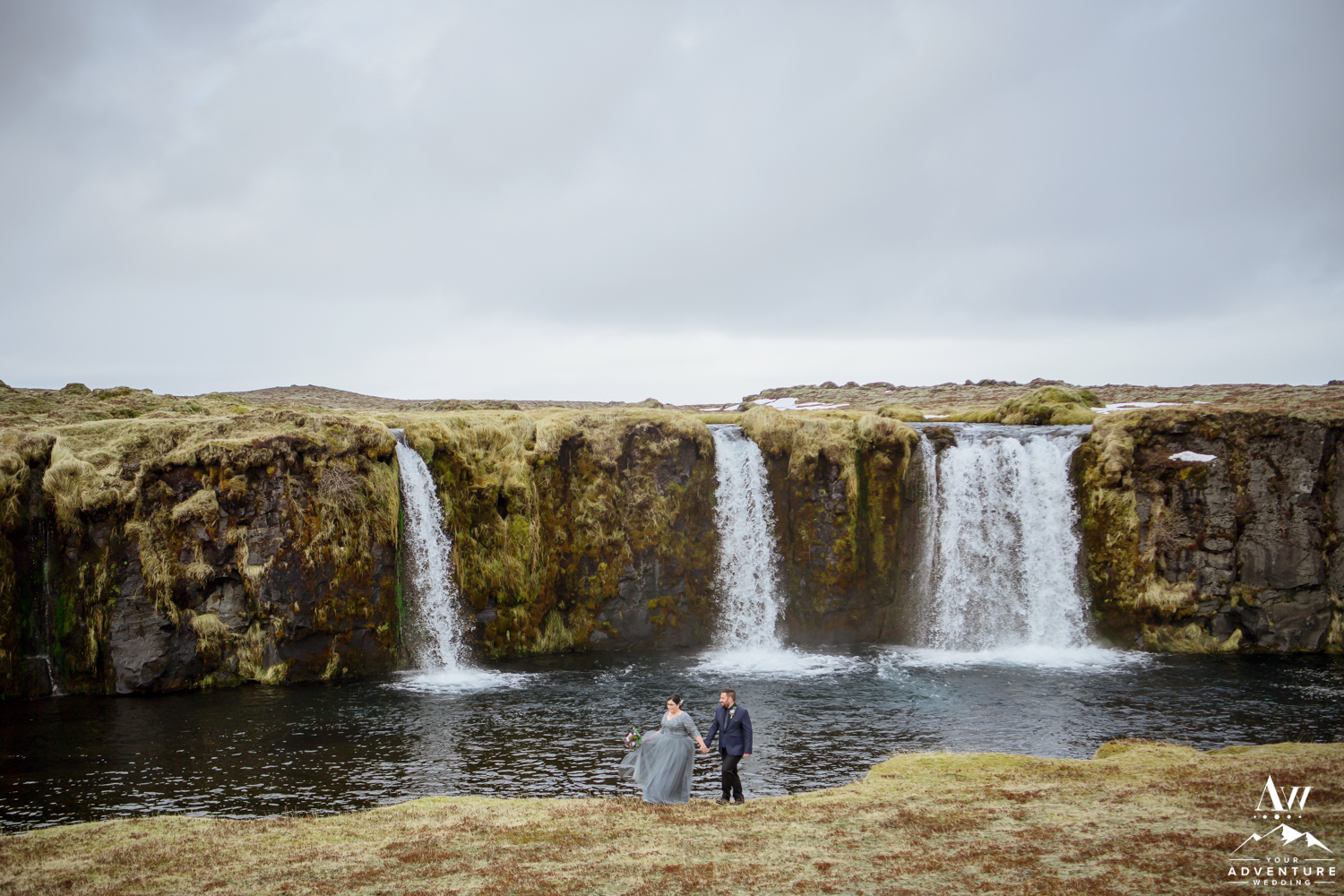 The last exciting stop on Heather and Dane’s adventurous elopement in Iceland was one of our favorite spots that when we say it out-loud feels like it’s unreal… A black sand lava rock waterfall. Say what?! I know, only in Iceland! This spectacular Iceland wedding location complimented Heather’s gray Iceland wedding dress really well too!