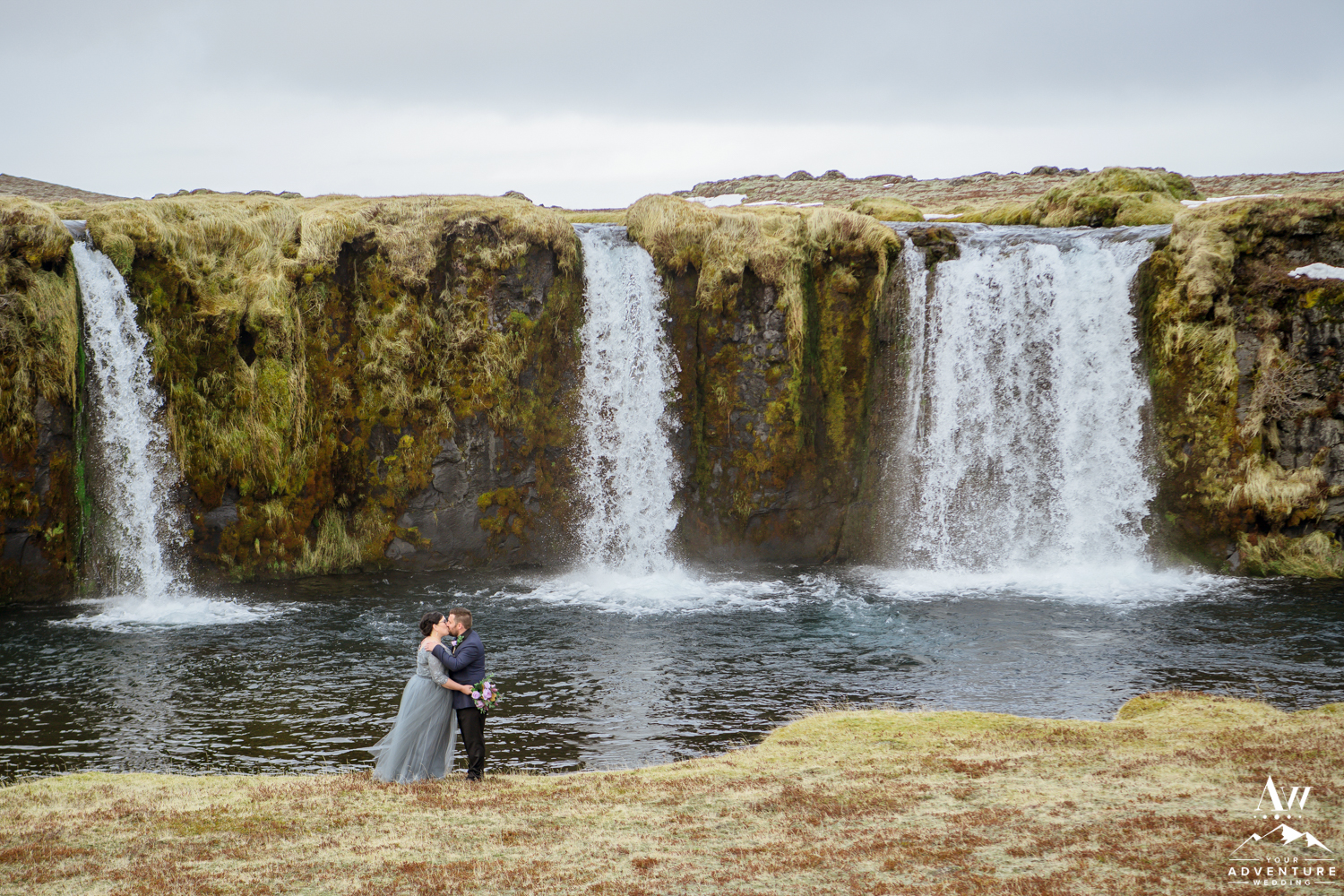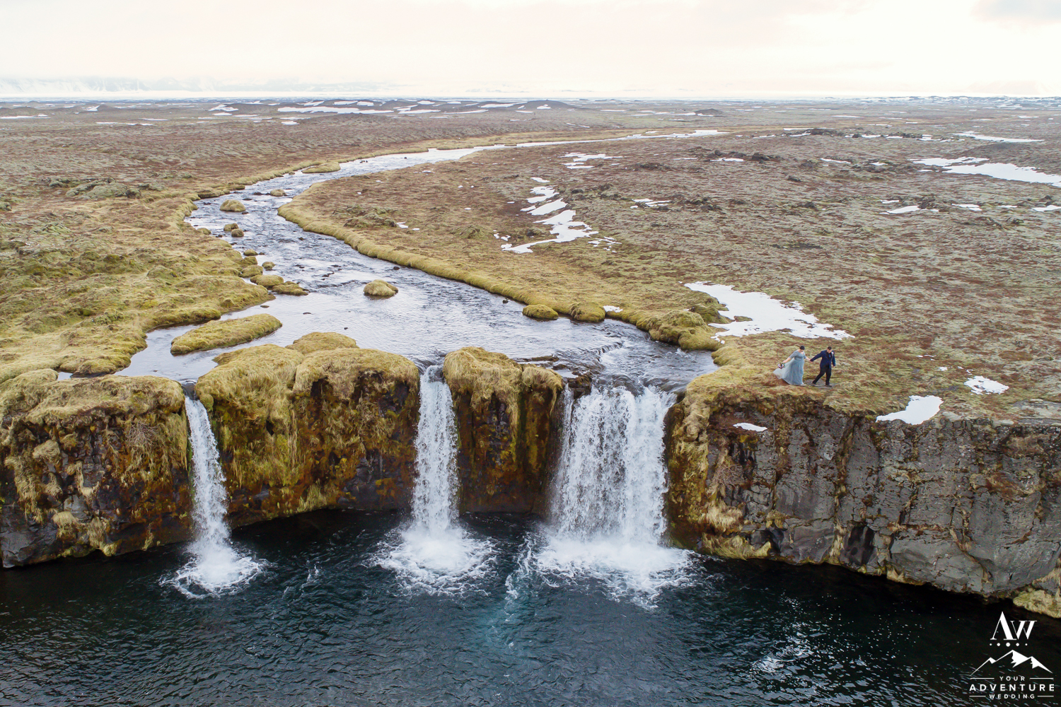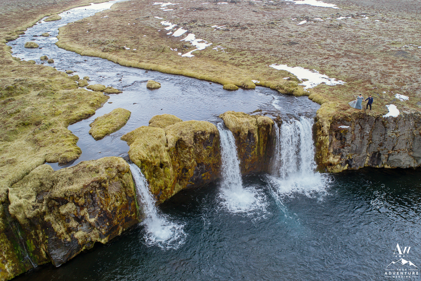 Iceland wedding portraits at this gorgeous private waterfall began shortly after the couple had time to explore it! There are so many lovely options at this unique waterfall in Iceland. Our Iceland wedding photo team even had the awesome opportunity to fly their drone!