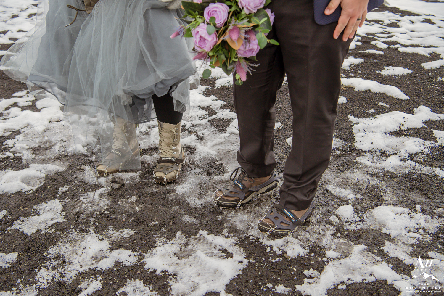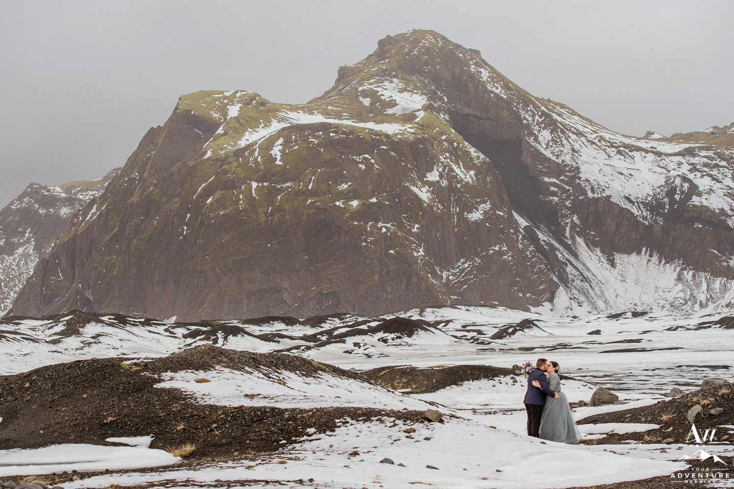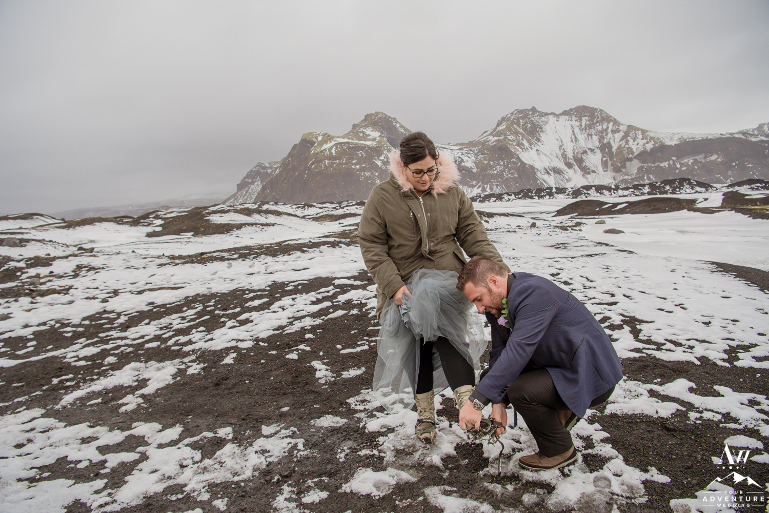 When you visit Iceland in April, there is a very good chance you can have the opportunity to journey to an ice cave during your adventurous elopement in Iceland. As one of Heather and Dane’s many Iceland wedding exploration spots they craved to visit a black glacier area and loved the idea of putting on crampons to hike up to an ice cave! It was a unique experience for them to have on their adventure wedding day!