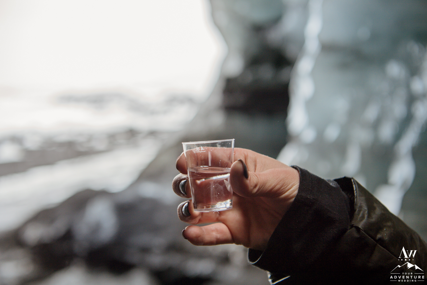 The weather turned a bit wicked while Heather and Dane explored through the ice caves but they embraced it! And a traditional shot of Icelandic Brennivin helped warm them up during their adventure wedding!