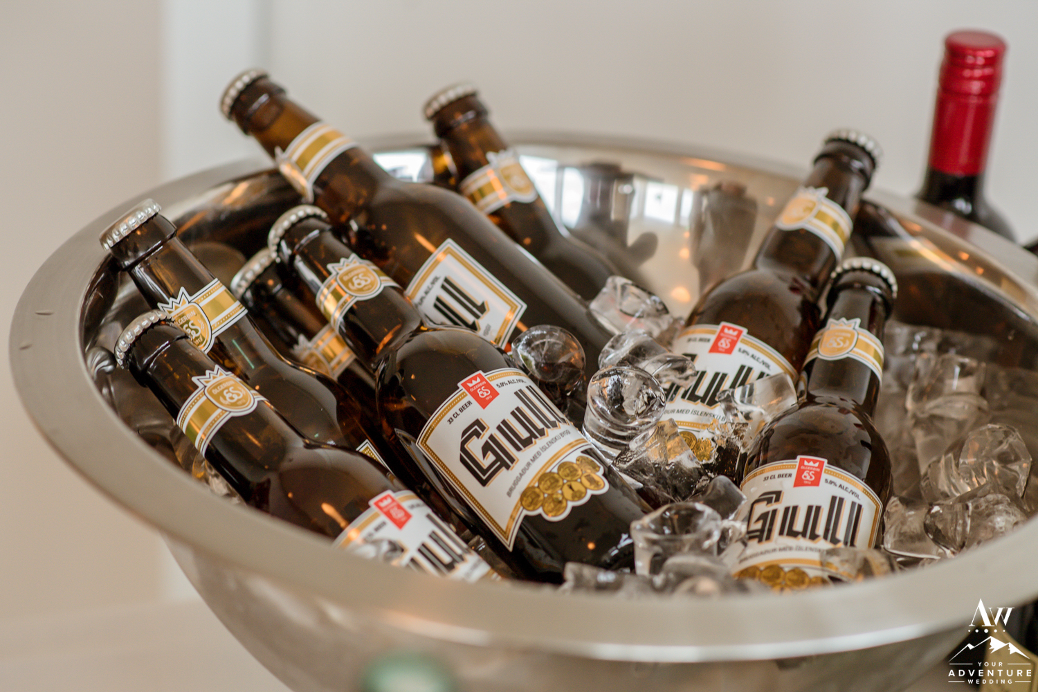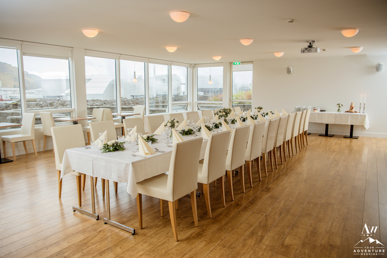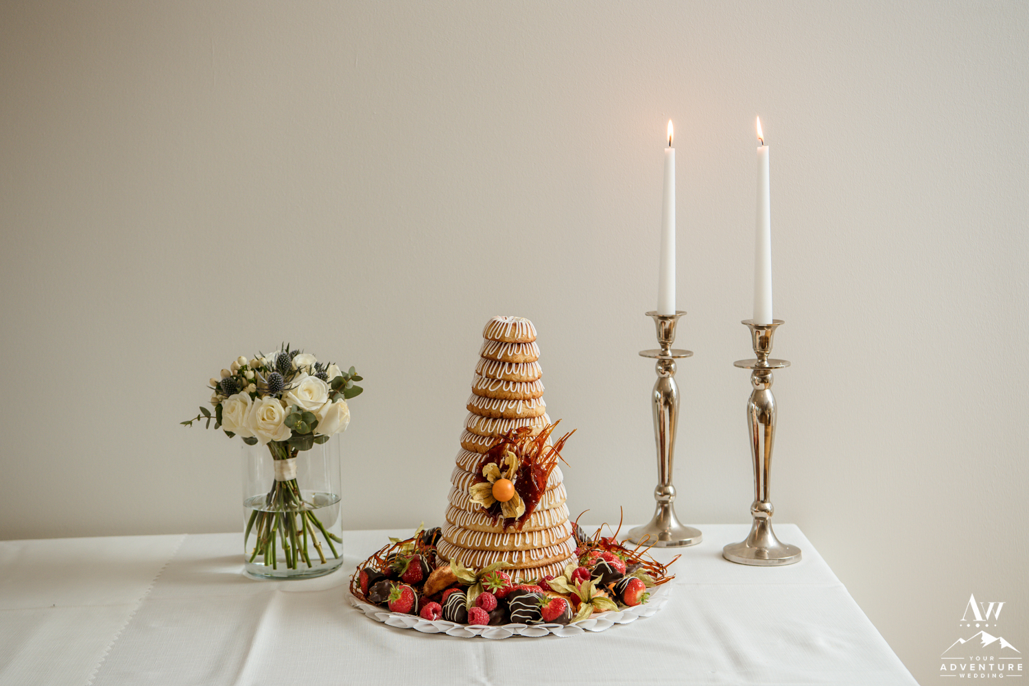 The guests arrived back to the Northern Lights Inn and were able to have time to rest and refresh. At 7:30pm they were invited down to a private space in Max’s Restaurant where an elegant Iceland wedding reception awaited them. Sarah and JB had a strong color theme of ivory and navy continue to follow through the reception decor. Guests were treated to a delicious 4 course meal which even included a traditional Iceland wedding cake called a Kransakaka! Guests relived their epic rainy Iceland wedding day adventures by talking about their favorite locations. A perfect end to a very adventurous rainy wedding day!