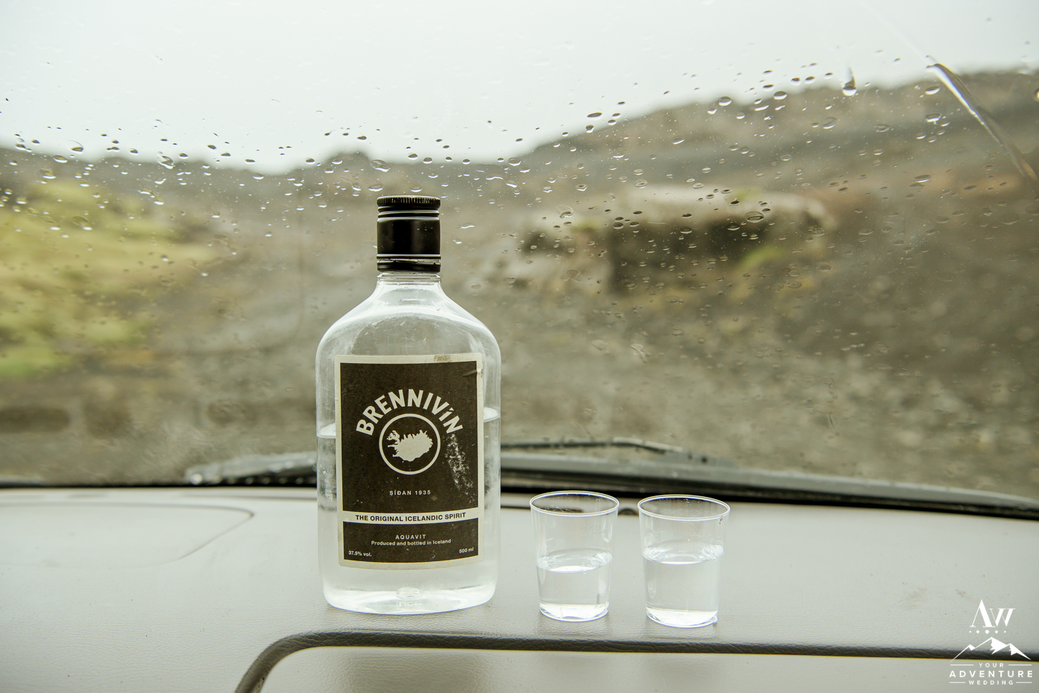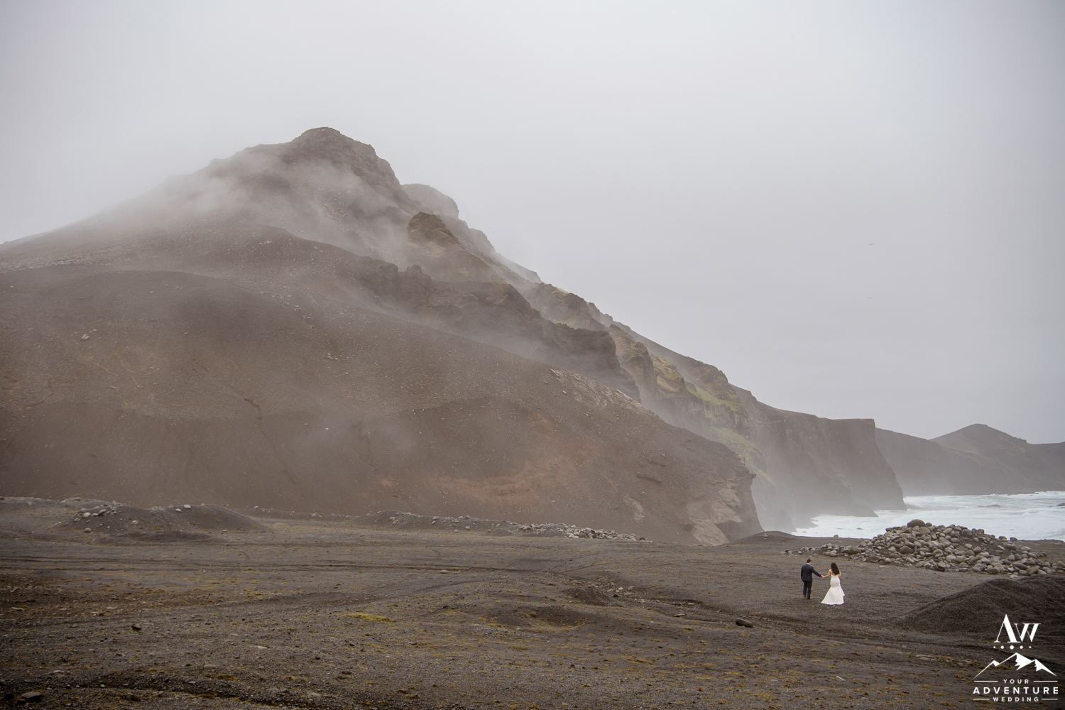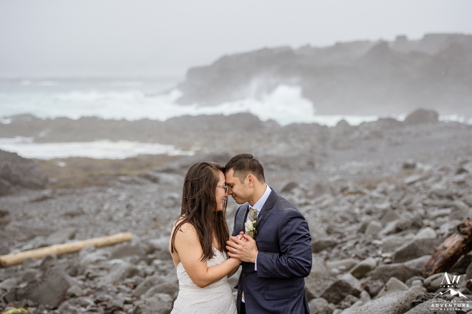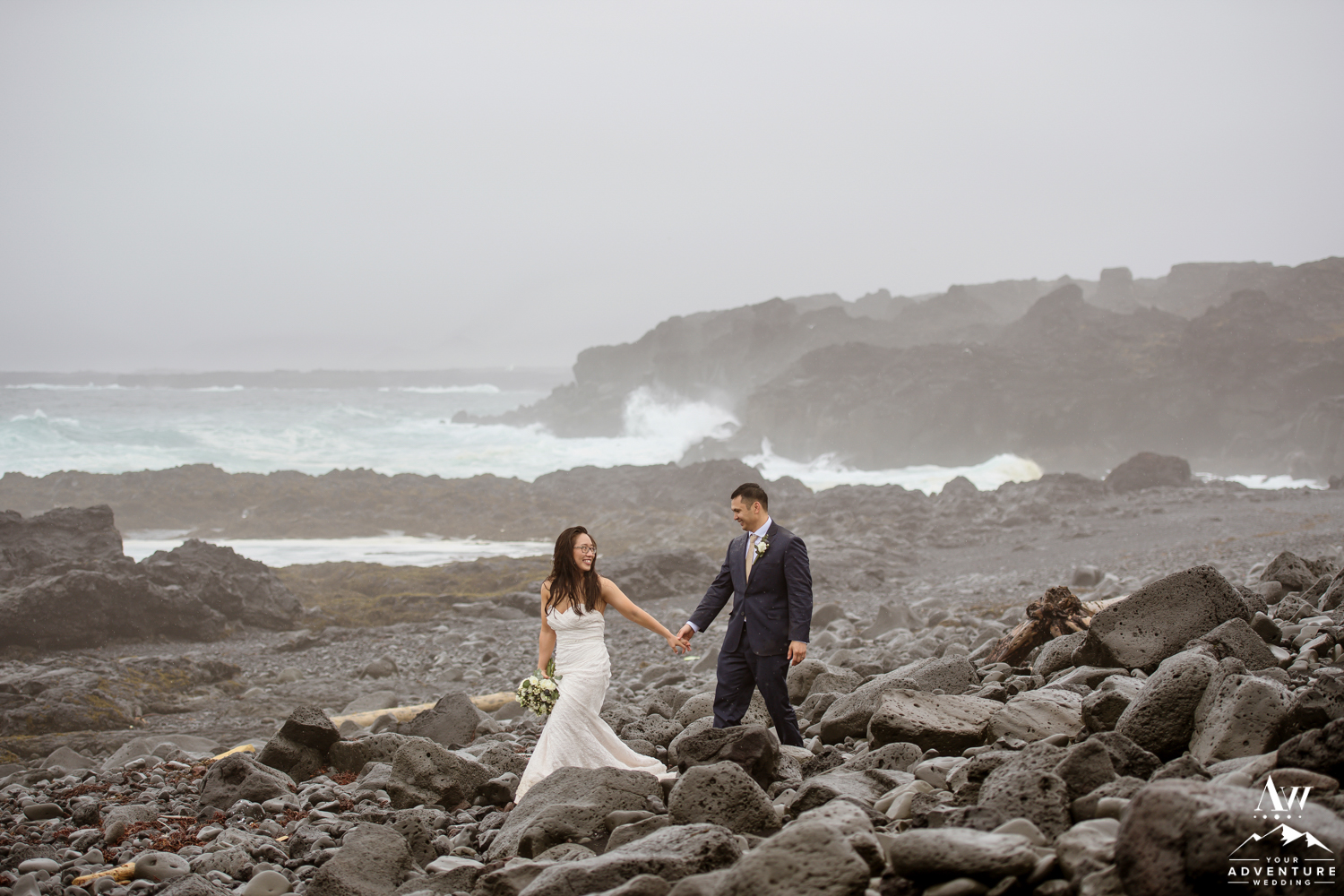 The Icelandic weather can be brutal no matter the time of year, so more often than not, we keep a little warm up in our Iceland wedding planning “go bag” of Brennivin. Sometimes you need a little shot of liquid courage to get the muscles heated and energy flowing to run around for Iceland wedding photos! #truestory There’s no shame in that! Soaked to the bone, these two explored the beach together and savored their warm up cuddles in between.