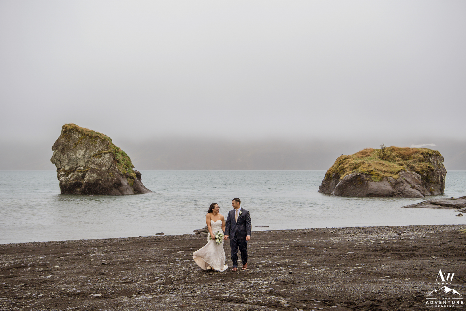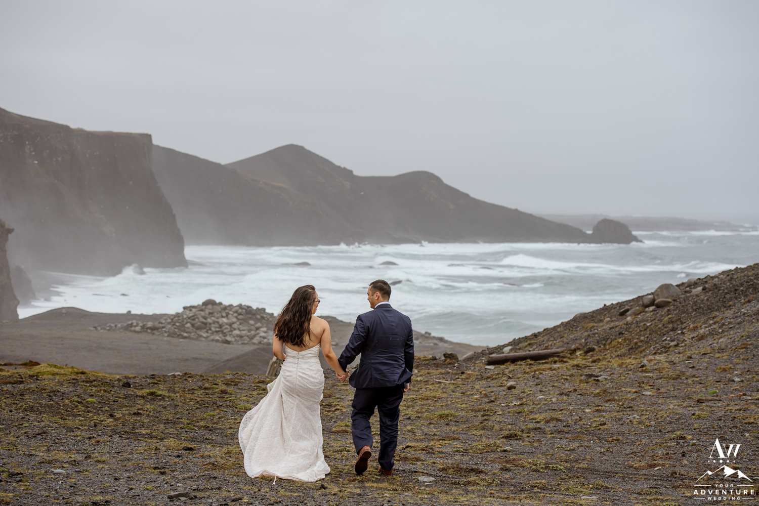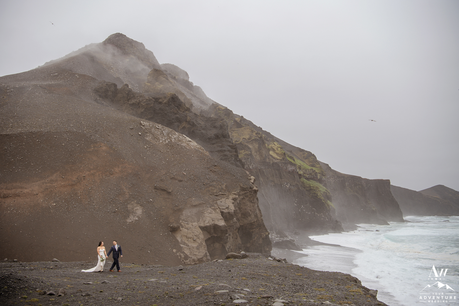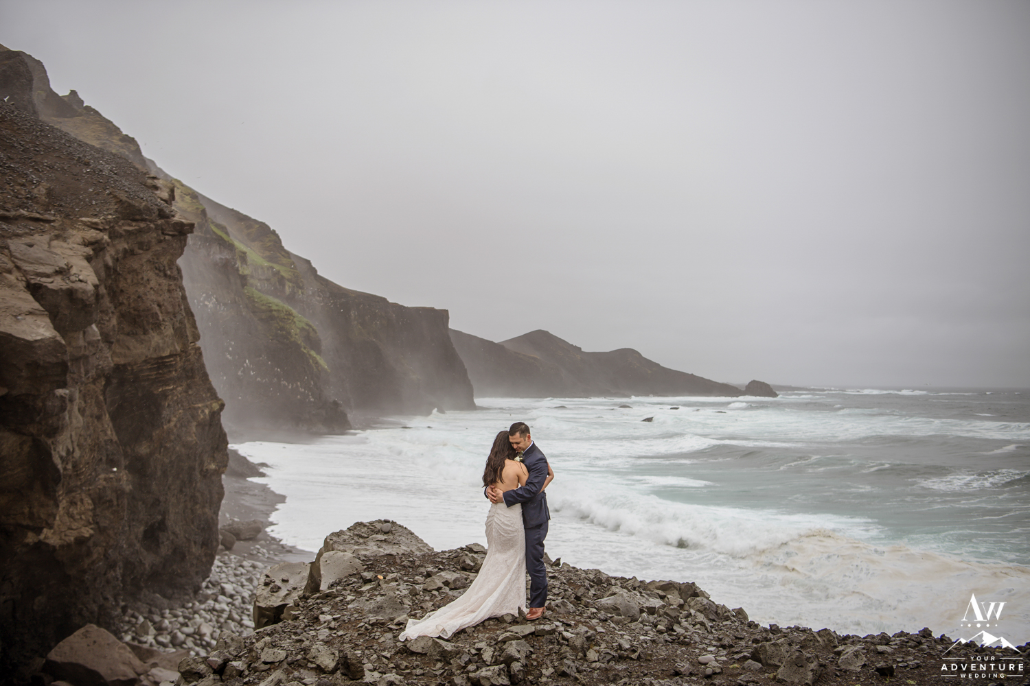 The Icelandic weather can be brutal no matter the time of year, so more often than not, we keep a little warm up in our Iceland wedding planning “go bag” of Brennivin. Sometimes you need a little shot of liquid courage to get the muscles heated and energy flowing to run around for Iceland wedding photos! #truestory There’s no shame in that! Soaked to the bone, these two explored the beach together and savored their warm up cuddles in between.