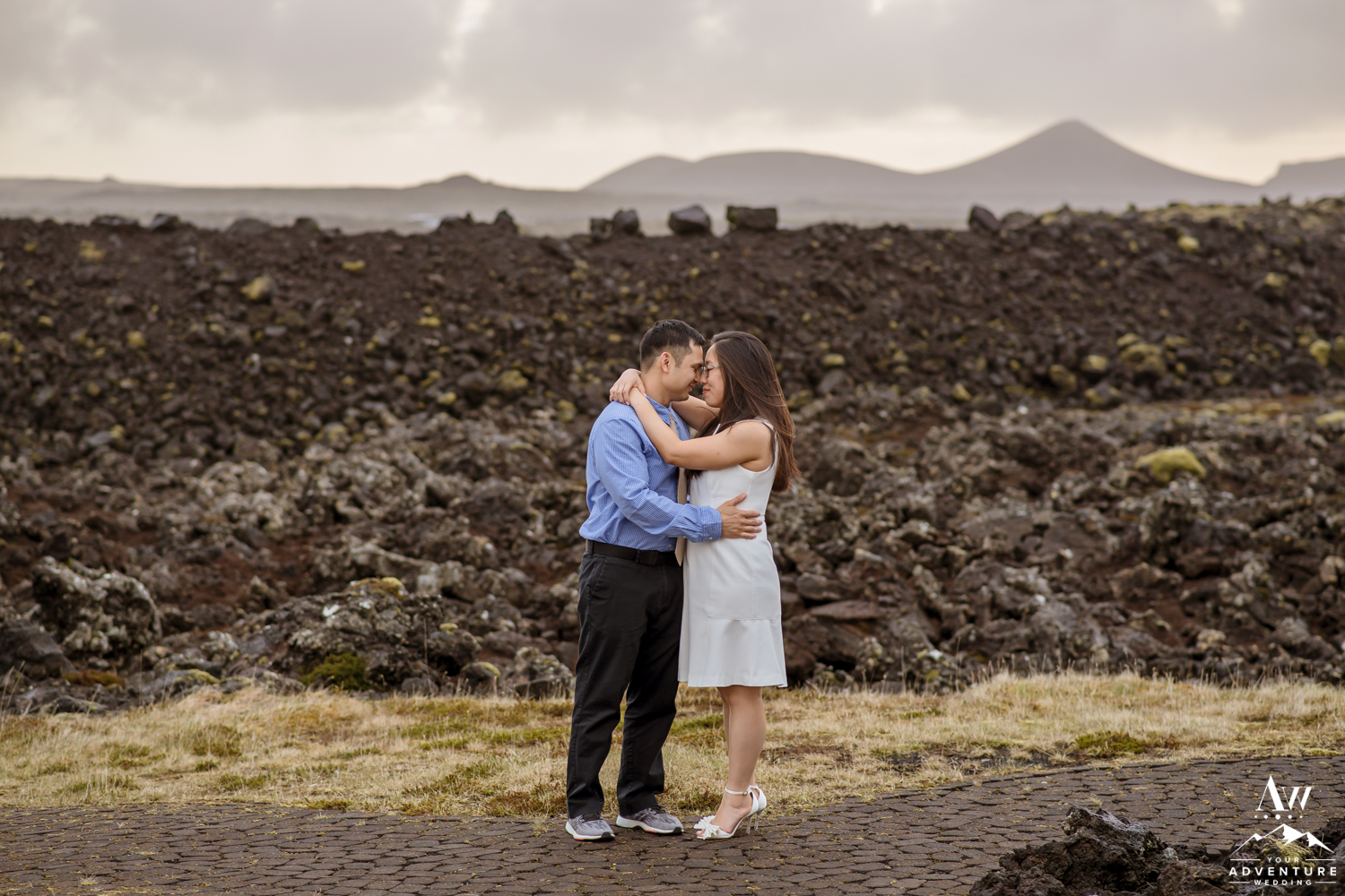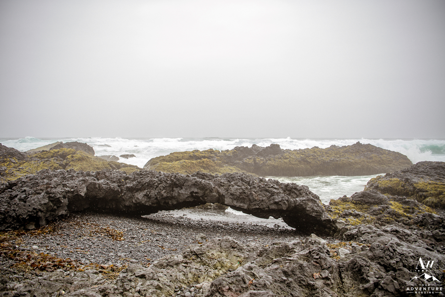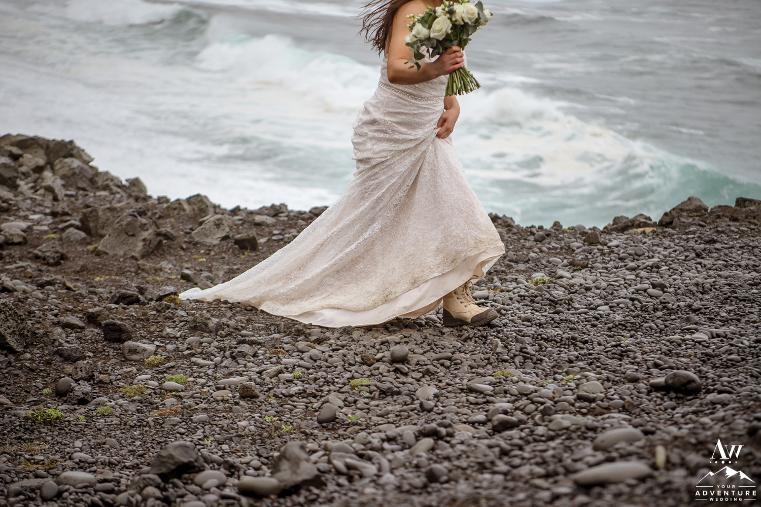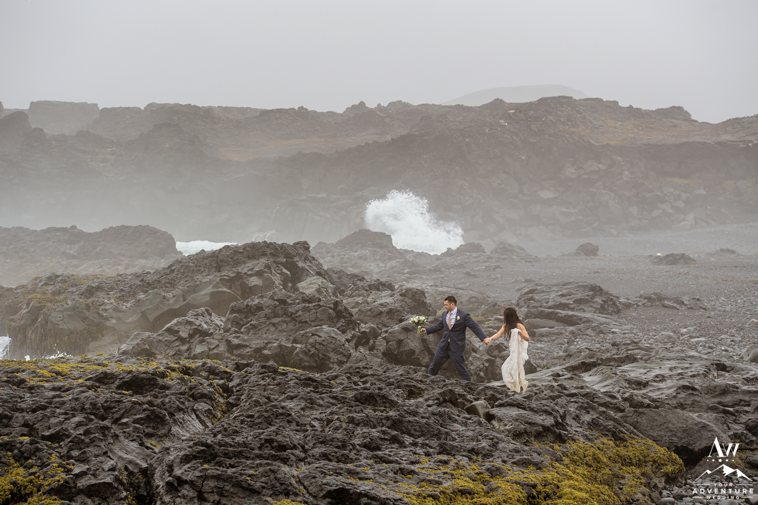 The Icelandic weather can be brutal no matter the time of year, so more often than not, we keep a little warm up in our Iceland wedding planning “go bag” of Brennivin. Sometimes you need a little shot of liquid courage to get the muscles heated and energy flowing to run around for Iceland wedding photos! #truestory There’s no shame in that! Soaked to the bone, these two explored the beach together and savored their warm up cuddles in between.