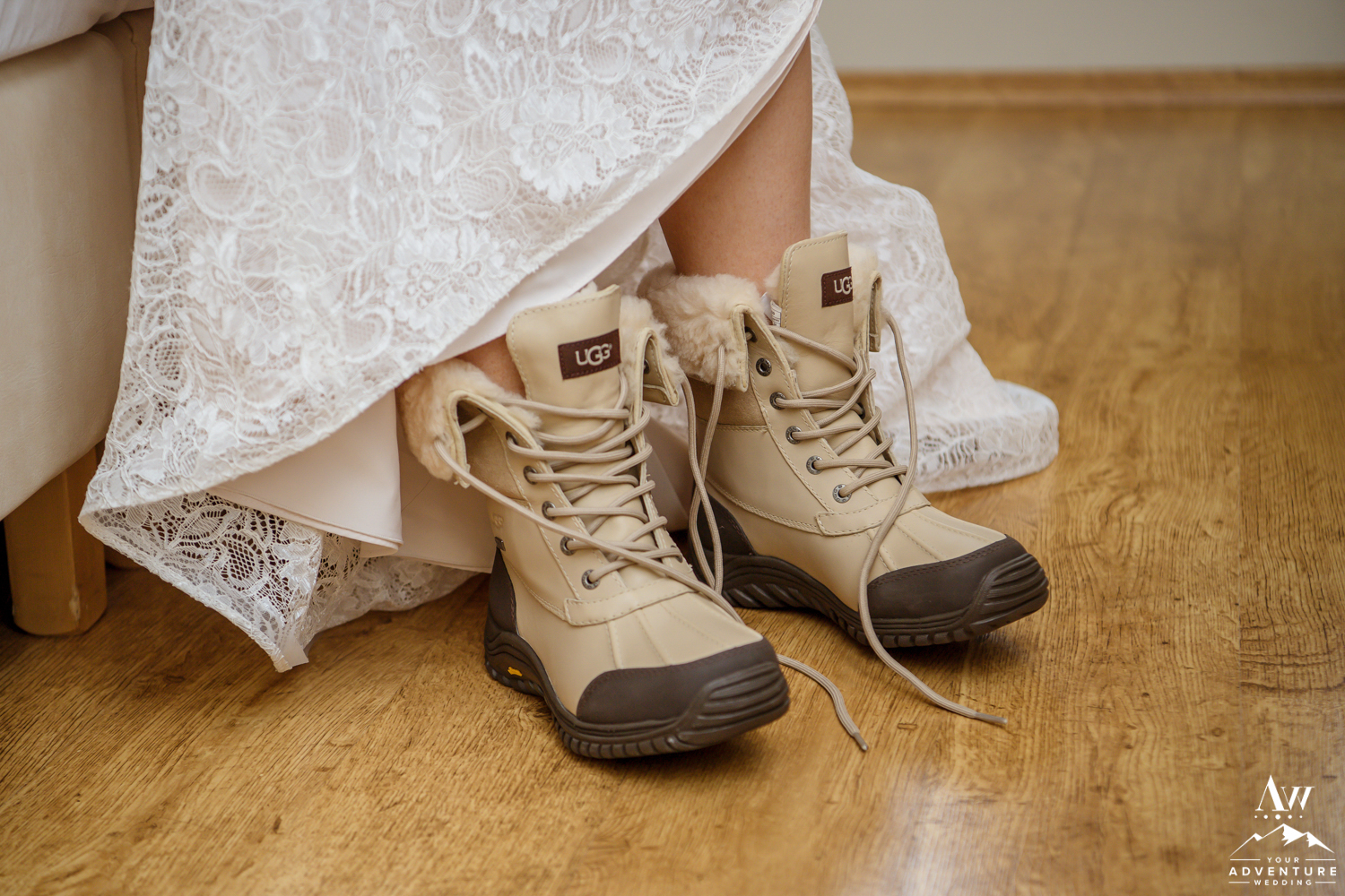Sarah and her girls got ready in their room together that brisk May morning. It was fun for our Iceland wedding photographer to see them laugh and primp together. Most of their friendships go back many years from childhood to med school. We loved that Sarah celebrated her PHD and recent doctor-hood by having her Iceland wedding dress from her personalized “Dr” hanger! Oh la la and her Iceland wedding shoes were stylish and smart. She had a fab pair of UGG boots for the adventure portion of the day and than awesome pair of heels for the Iceland wedding reception.