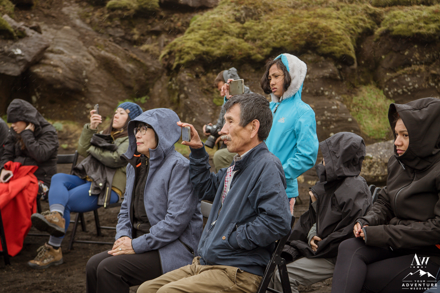 Our Iceland Wedding Planner team was granted permission to hold the private Iceland wedding ceremony at this beautiful lakeside location. Our 2 super jeeps plus porta potty jeep got the guests down to the lake so they only walked a tiny bit to where we had set up the chairs for the Iceland wedding ceremony. It was pouring down with rain and windy so we sheltered the guests against a rocky cove and toweled off the chairs as the guests took their seats.
