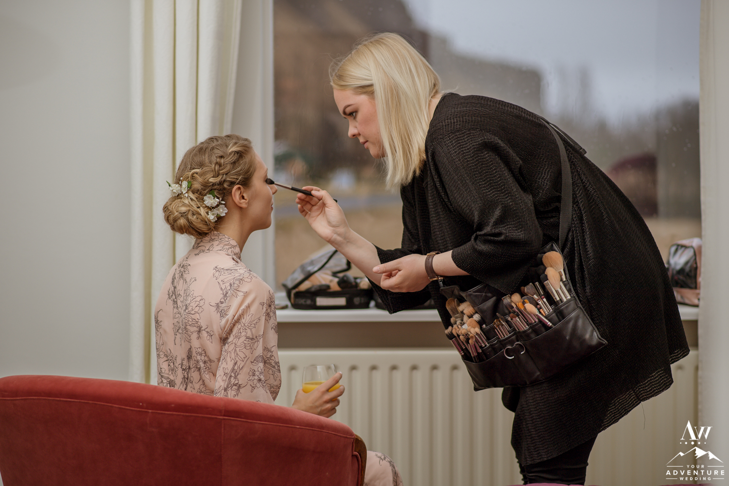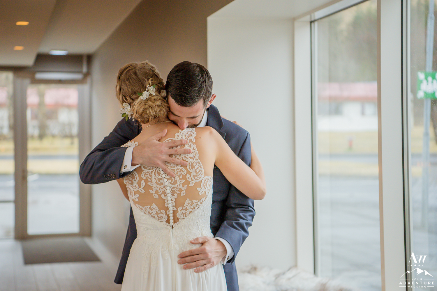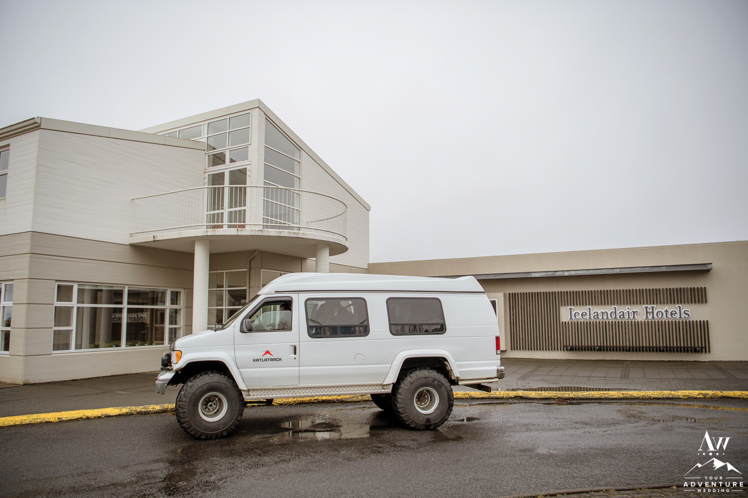 During winter weddings in Iceland (November-April), weather continues to be fickle, but Jacalyn, Michael, and their parents as guests were ready to embrace anything mother nature dealt! The southern Iceland wedding adventure morning began around 5am at one of our favorite wedding hotels, Icelandair Klaustur with our hair and makeup team beautifying Jacalyn! The Iceland wedding photographer was super excited to capture all of the details too! From welcome bags to the “Happy Tears” tissues, Jacalyn had thought of everything with our Iceland Wedding Planner teams expertise! Before loading into the super jeep, these two shared a quick and intimate first look too!