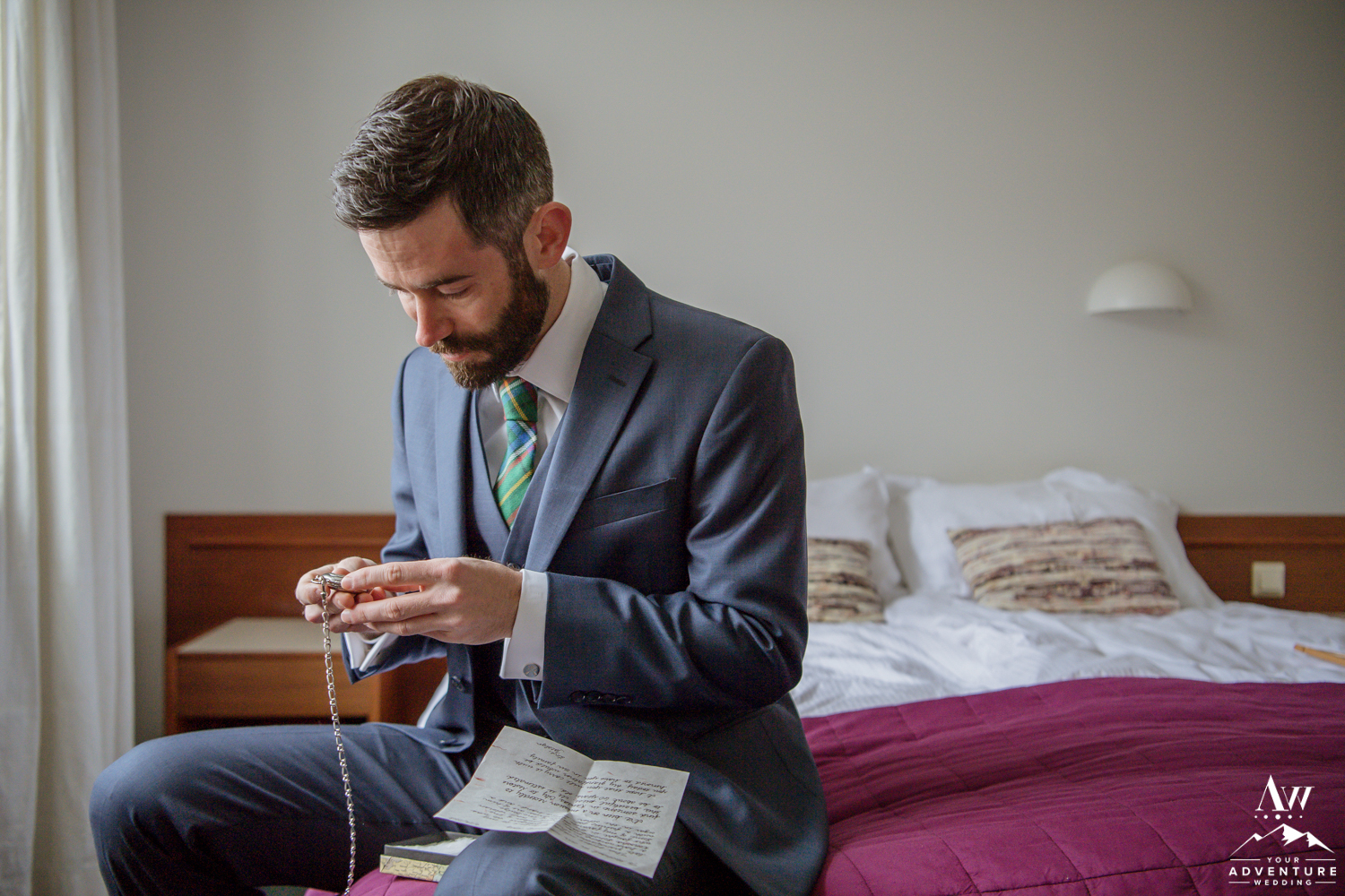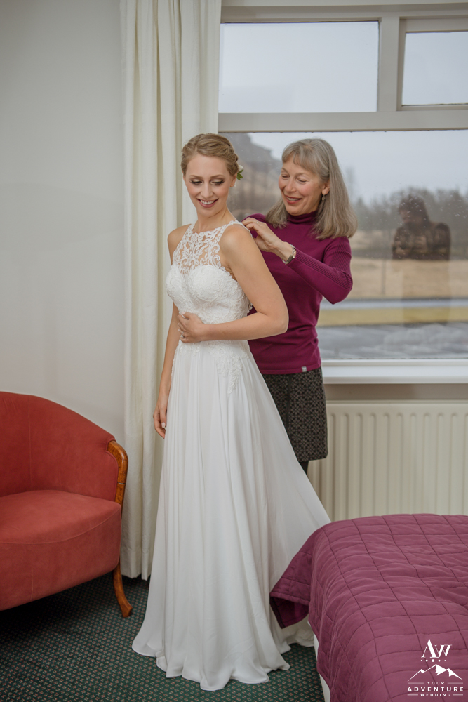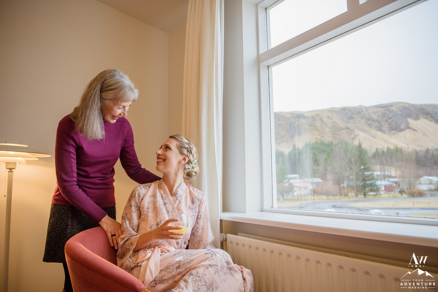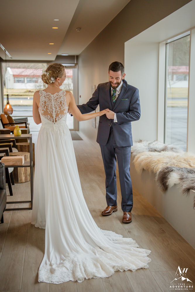 During winter weddings in Iceland (November-April), weather continues to be fickle, but Jacalyn, Michael, and their parents as guests were ready to embrace anything mother nature dealt! The southern Iceland wedding adventure morning began around 5am at one of our favorite wedding hotels, Icelandair Klaustur with our hair and makeup team beautifying Jacalyn! The Iceland wedding photographer was super excited to capture all of the details too! From welcome bags to the “Happy Tears” tissues, Jacalyn had thought of everything with our Iceland Wedding Planner teams expertise! Before loading into the super jeep, these two shared a quick and intimate first look too!