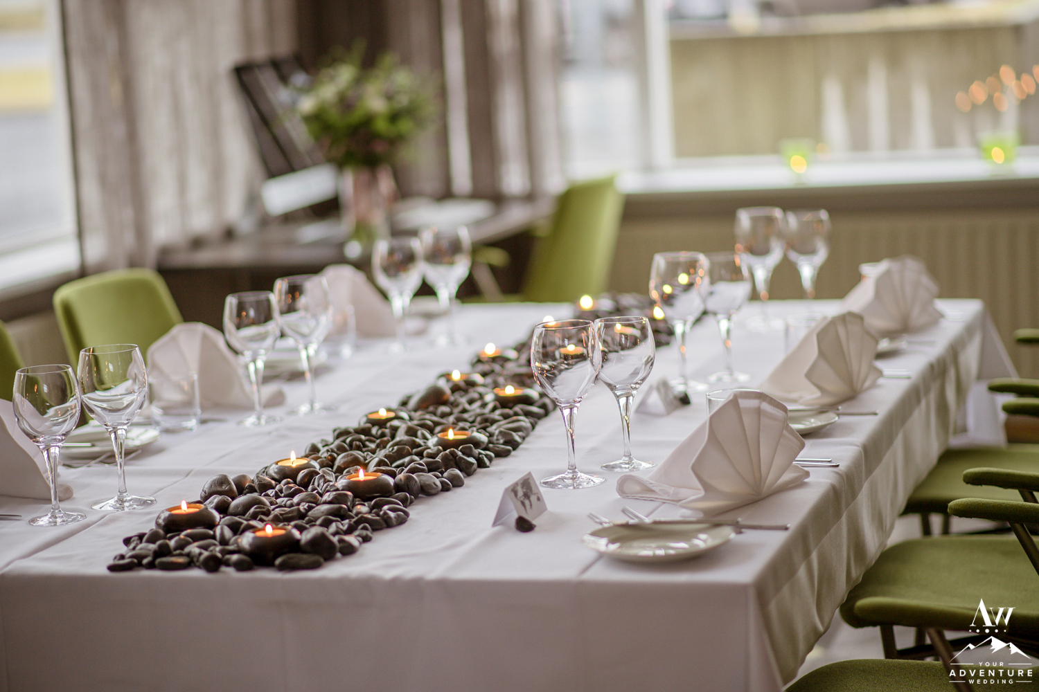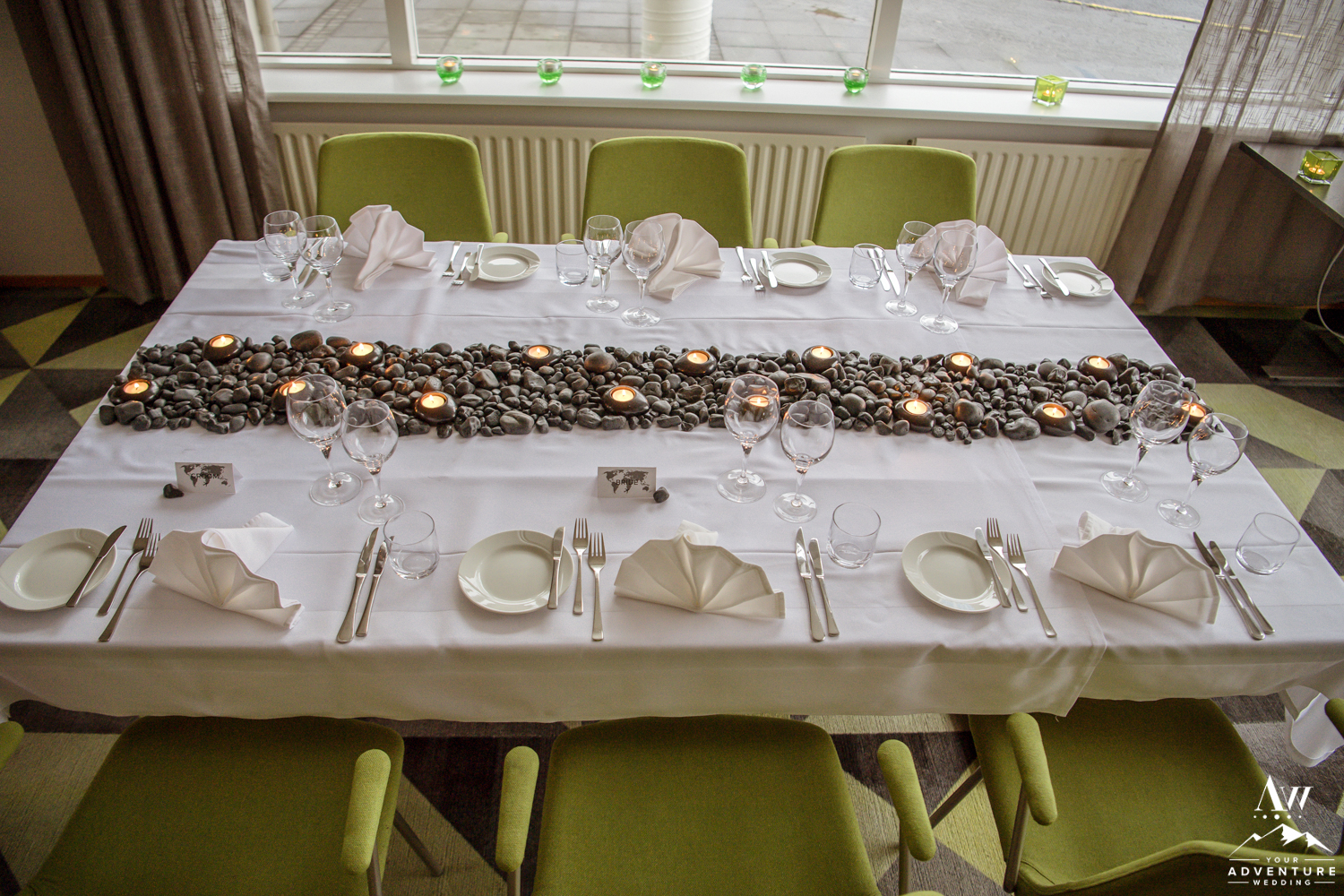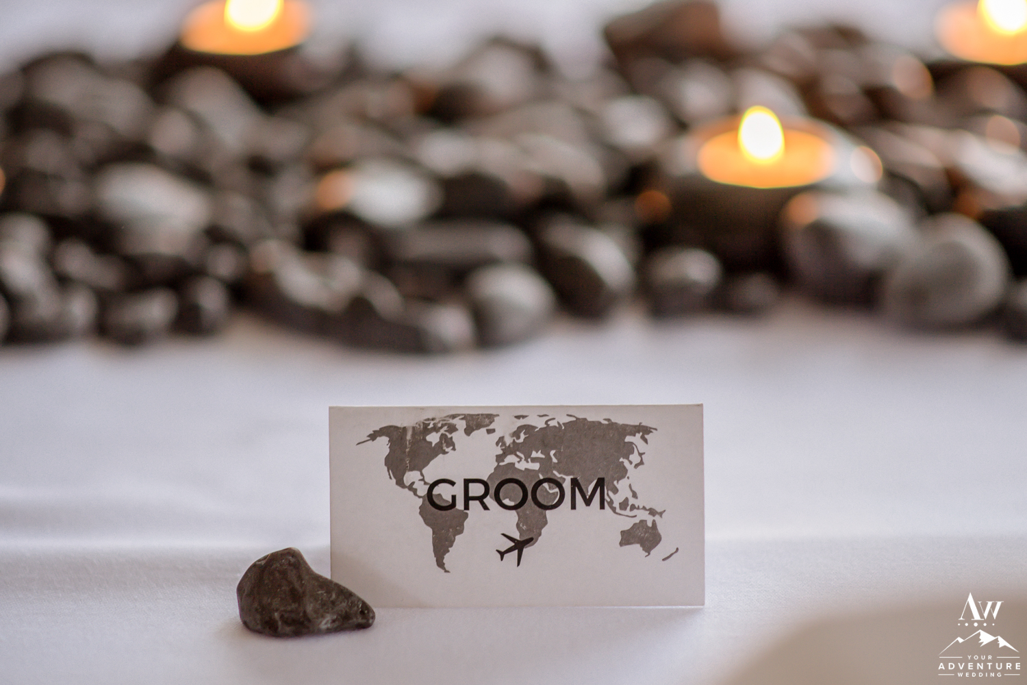 Upon arriving back to Icelandair Klaustur, the small Iceland wedding group was able to have a bit of time to rest and refresh before coming back down to an elegant reception. Jacalyn and Michael’s idea for their Iceland wedding reception décor was to have basalt rocks line the table as a table runner. Mixed between were tea lights made from basalt rocks. Our Iceland Wedding Planner team surprised the duo with gray map “Bride” and “Groom” place cards, which was so pretty and perfect for them considering their love of maps and traveling continues to be part of their core relationship foundation!