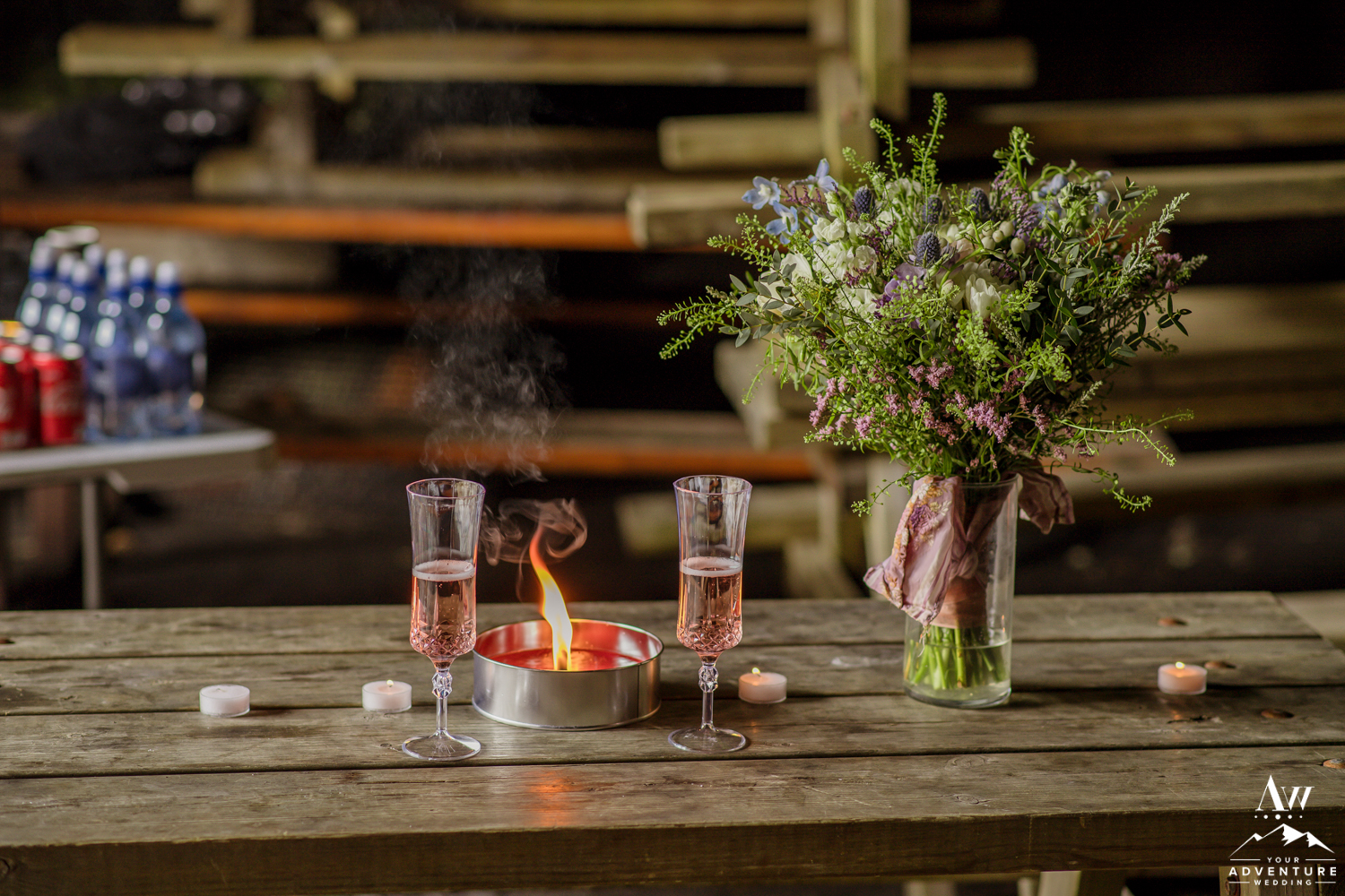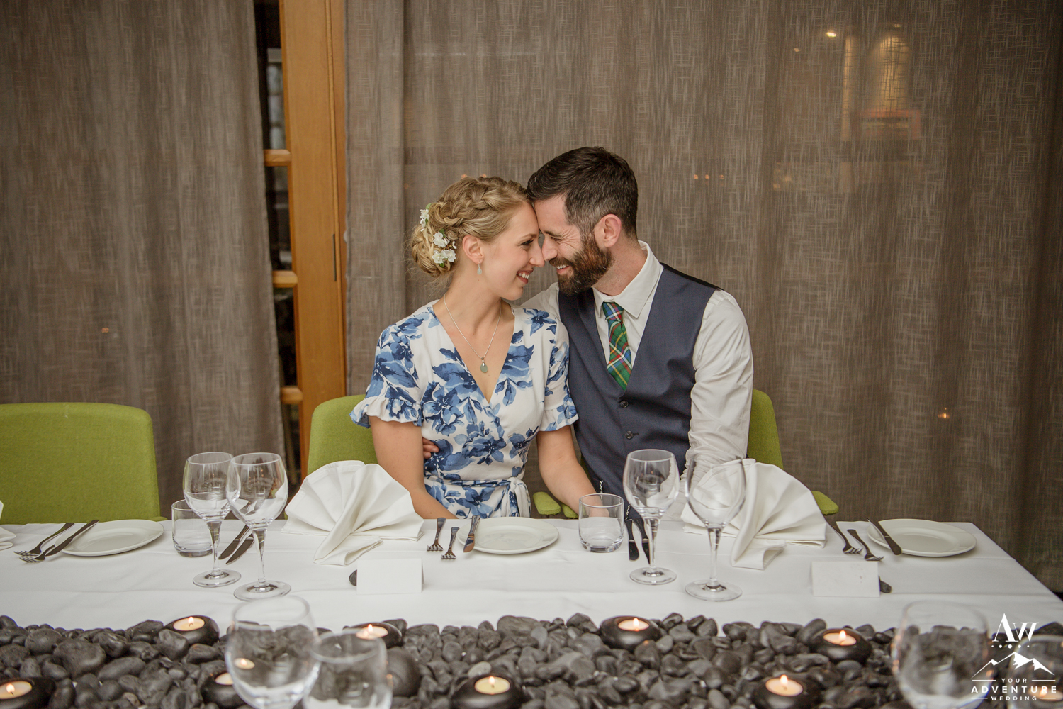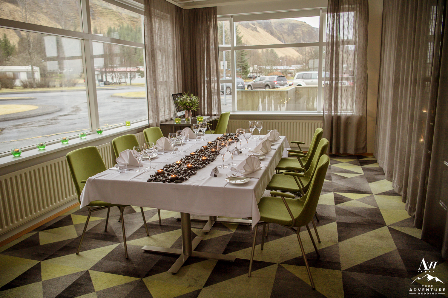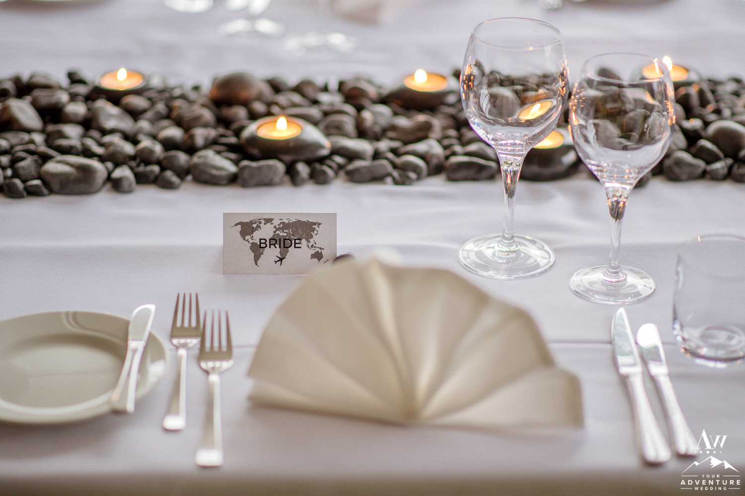 Upon arriving back to Icelandair Klaustur, the small Iceland wedding group was able to have a bit of time to rest and refresh before coming back down to an elegant reception. Jacalyn and Michael’s idea for their Iceland wedding reception décor was to have basalt rocks line the table as a table runner. Mixed between were tea lights made from basalt rocks. Our Iceland Wedding Planner team surprised the duo with gray map “Bride” and “Groom” place cards, which was so pretty and perfect for them considering their love of maps and traveling continues to be part of their core relationship foundation!