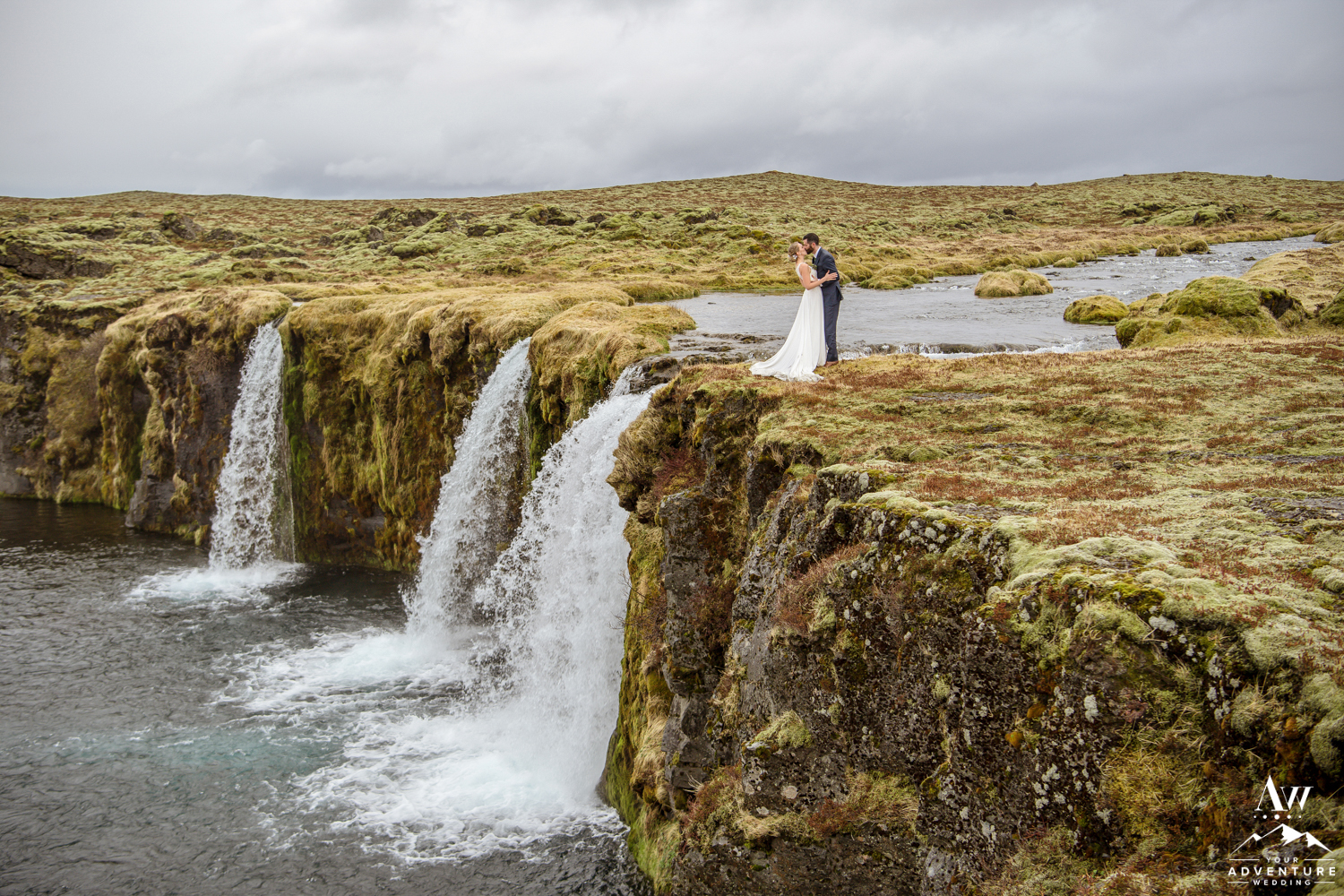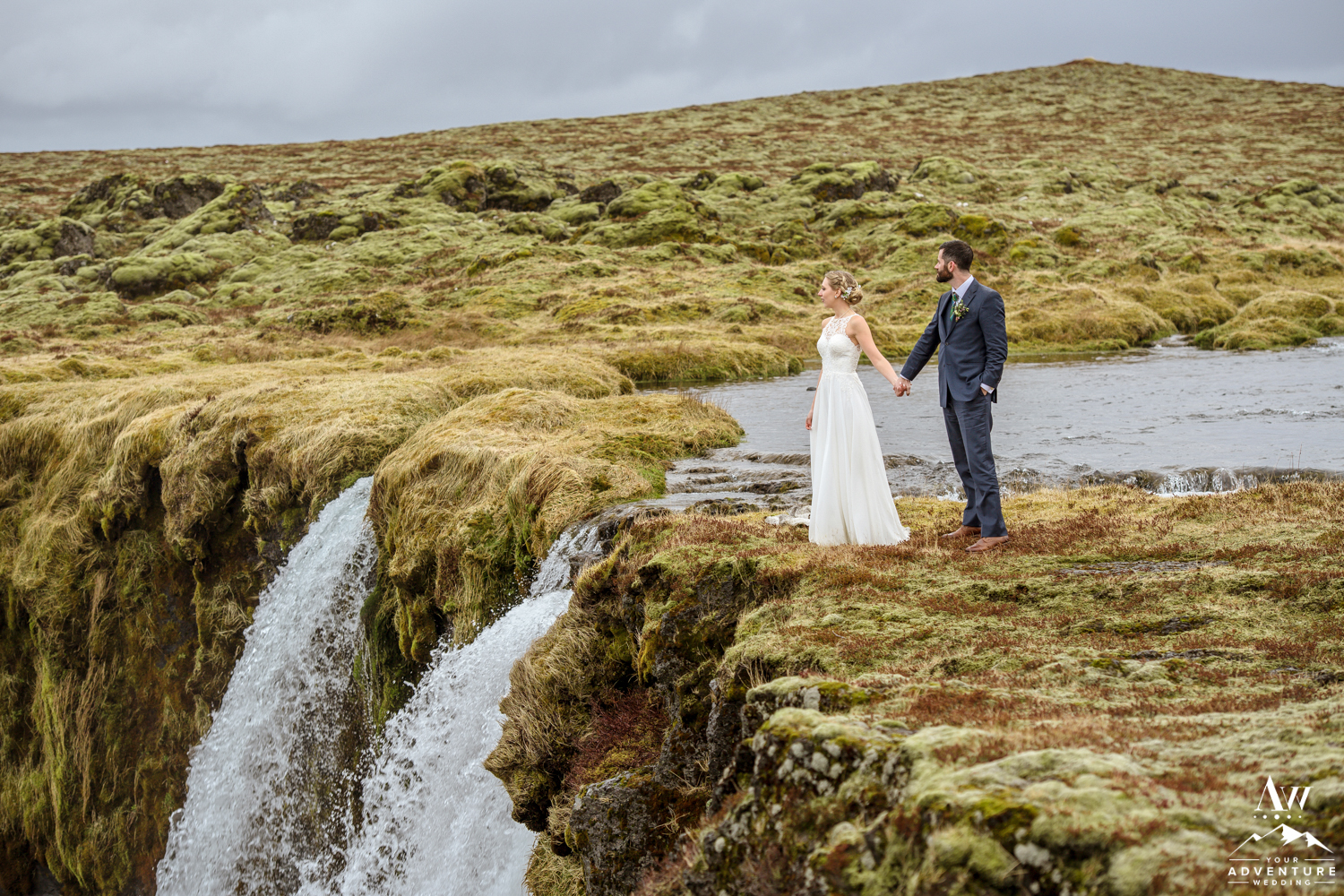 When you are planning an adventure wedding, it’s important to have a timeline with a good balance of exploration, time to mingle (if bringing guests), and to have epic Iceland wedding photos taken. The next location on Jacalyn and Michael’s Southern Iceland wedding adventure was one of our many exclusively private waterfalls! These two spent time exploring both the base of the waterfall and climbed on top for an endless view! It’s amazing to see the power the waterfall exudes and to hear the sounds. Bringing that memory home with you is way better than any silly souvenir!