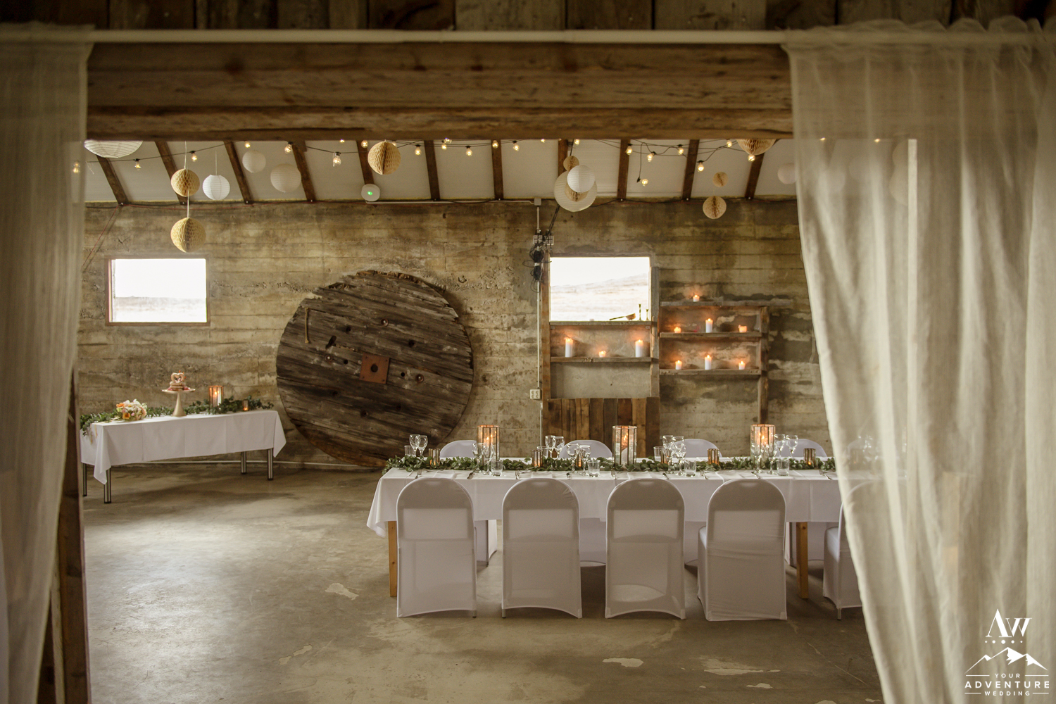 The group returned to Hotel Borealis around 6:30pm.  They had about 60 minutes to rest and refresh before embarking on Part Two of the day… The Iceland wedding reception!  Hotel Borealis has a lovely rustic barn to hold a private Iceland wedding reception in.  Our Iceland Wedding Planner team decorated the elegant reception with earthy brown accents, candles, and eucalyptus.  The group delighted in a 3 course meal and finished the night with a traditional Iceland wedding cake!