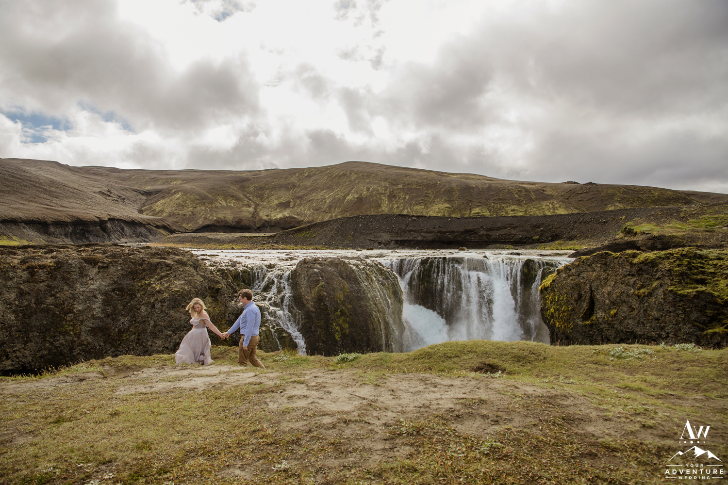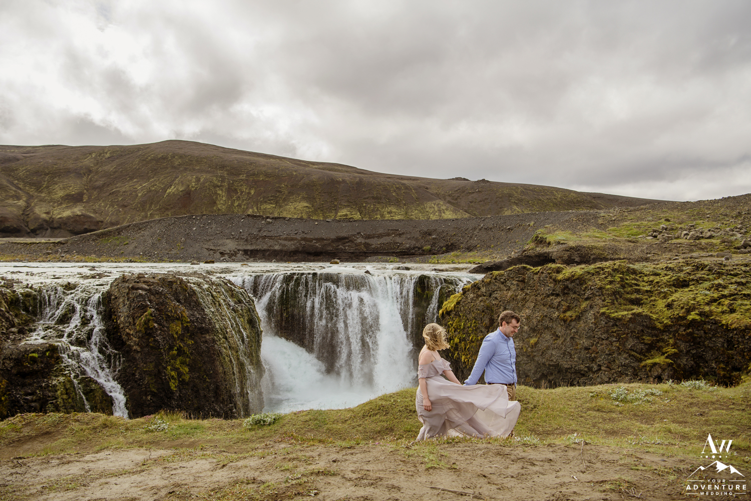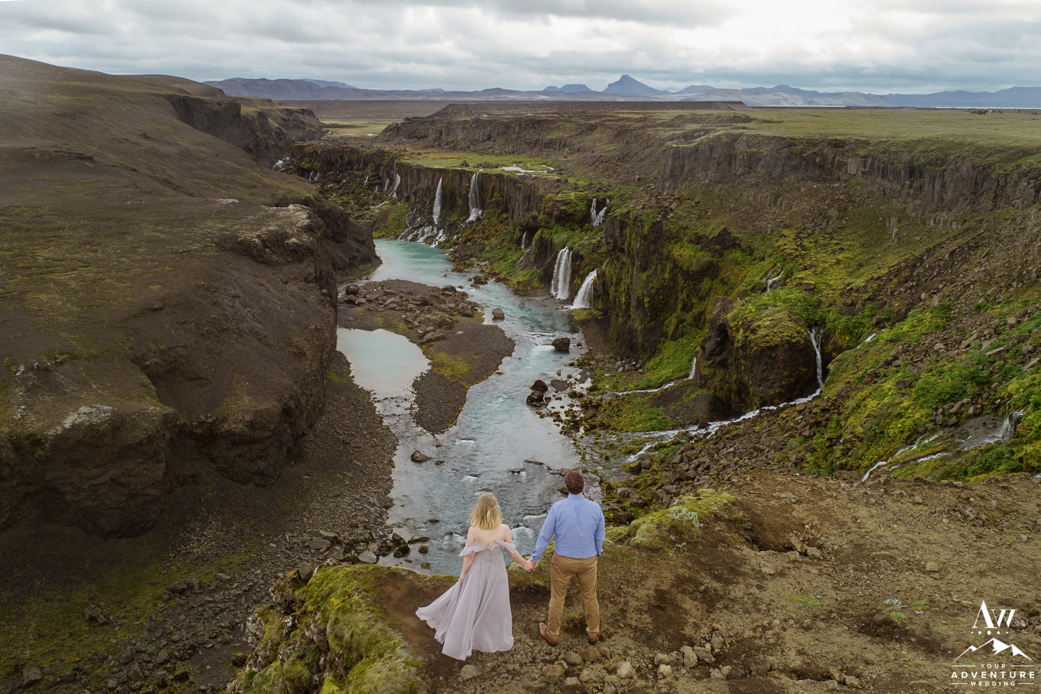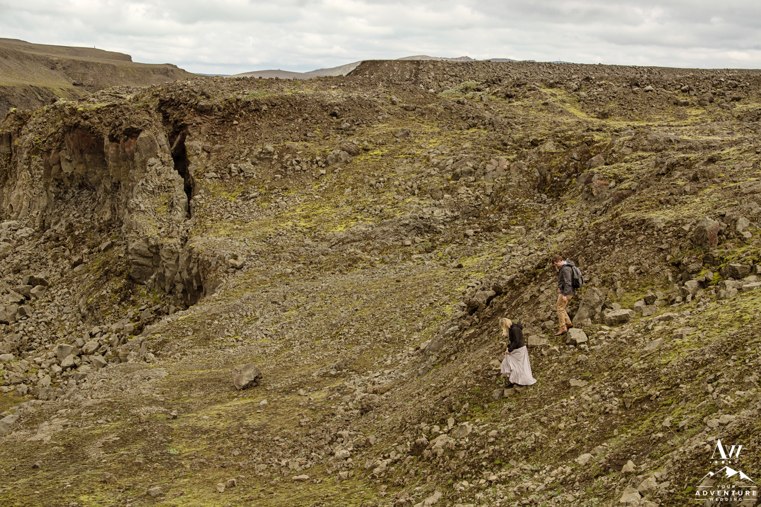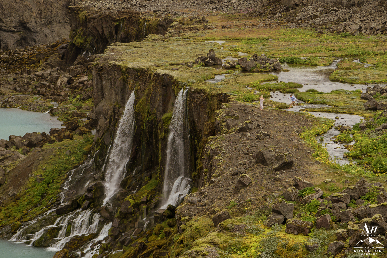 As soon as Rachel and John left last year after their August cave elopement in Iceland, they wanted to come back. Iceland is forever in their hearts. To continue their obsession for the landscape, they are both followers of our Iceland Wedding Planner Instagram account. Our team weekly goes out to scout new Iceland wedding locations (follow our Insta-Stories if you find yourself curious). One week Rachel was blown away by an area we fondly refer to as our Jurassic Park Waterfall.