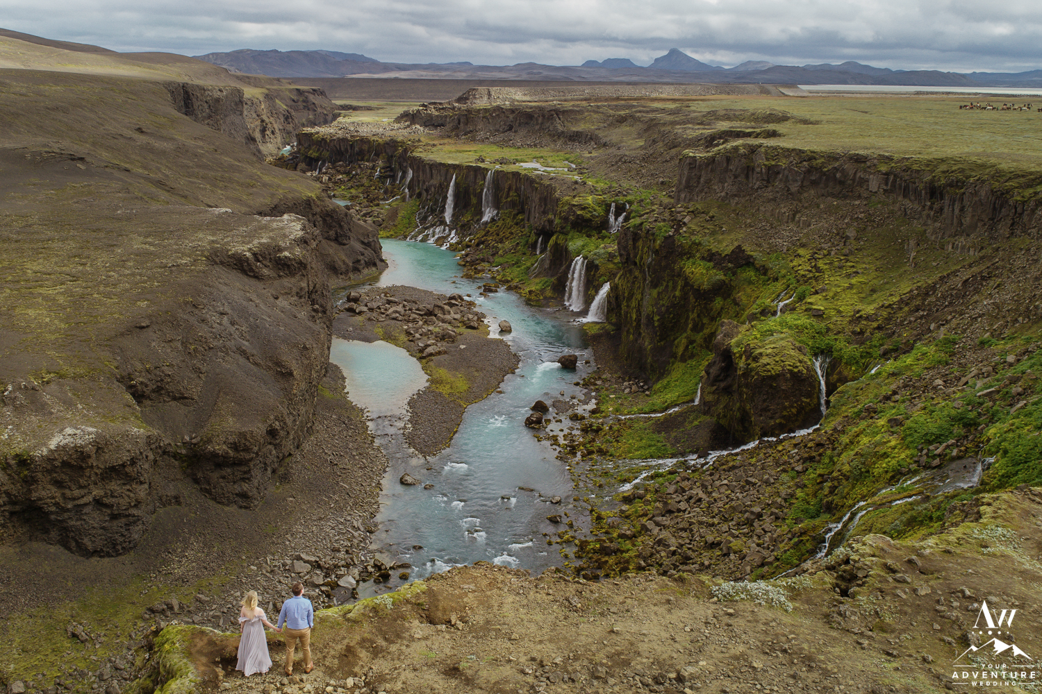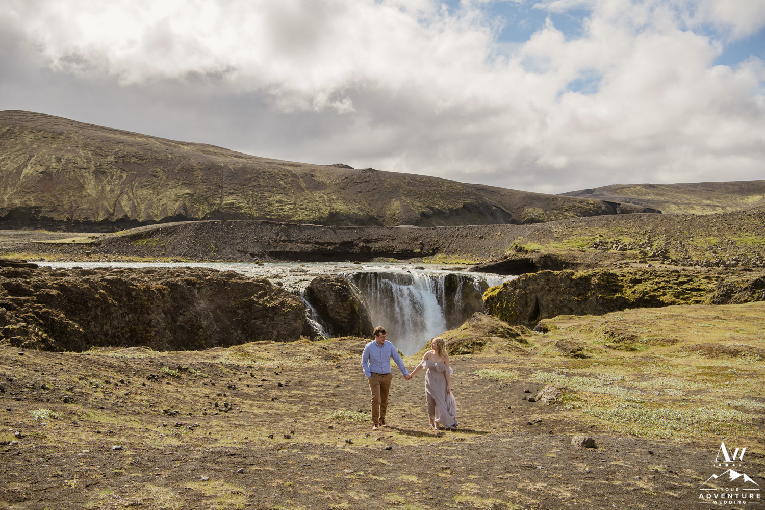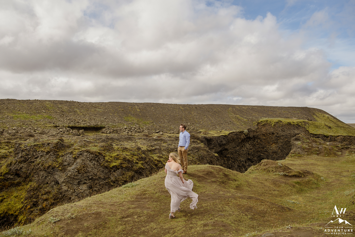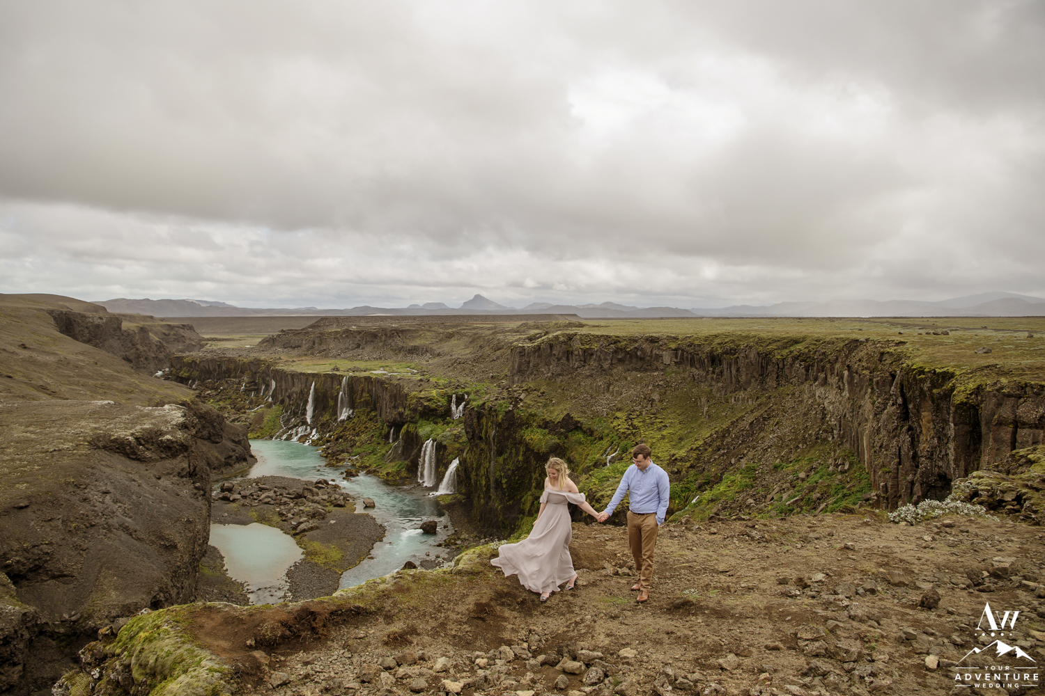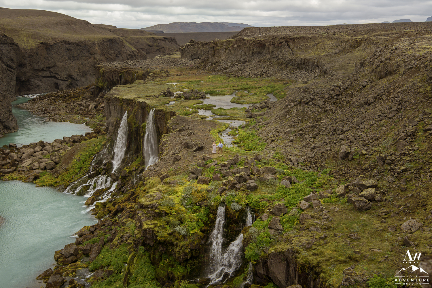 As soon as Rachel and John left last year after their August cave elopement in Iceland, they wanted to come back. Iceland is forever in their hearts. To continue their obsession for the landscape, they are both followers of our Iceland Wedding Planner Instagram account. Our team weekly goes out to scout new Iceland wedding locations (follow our Insta-Stories if you find yourself curious). One week Rachel was blown away by an area we fondly refer to as our Jurassic Park Waterfall.