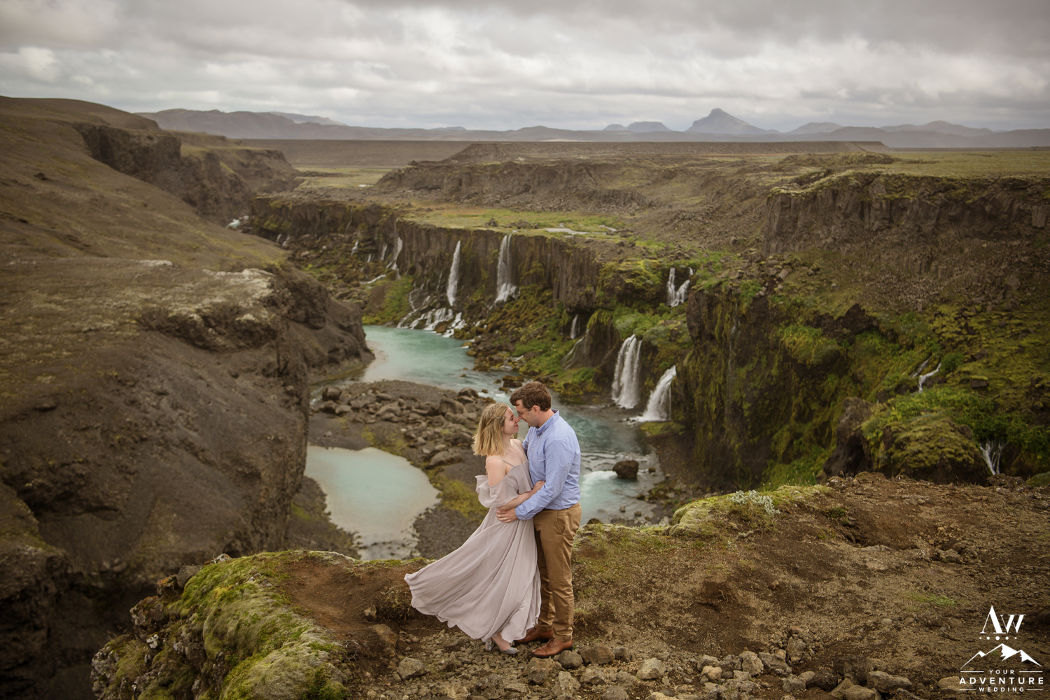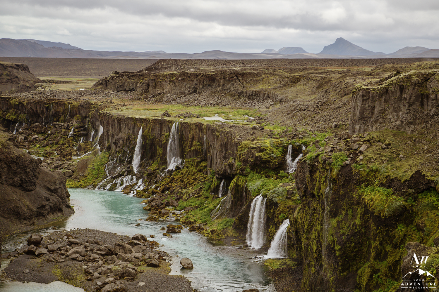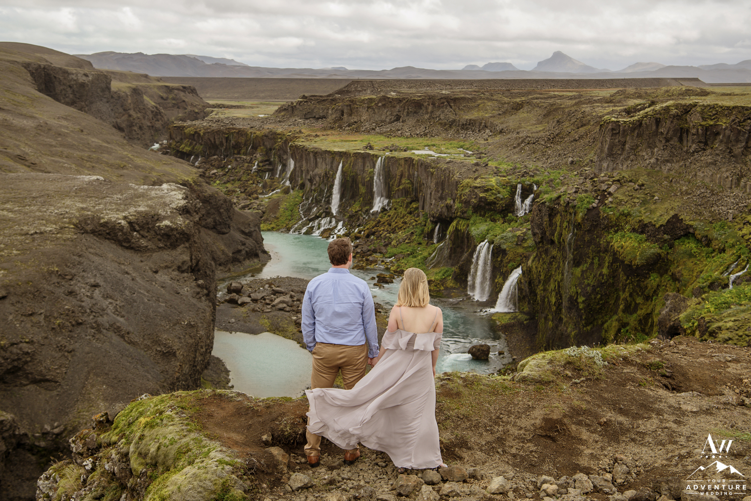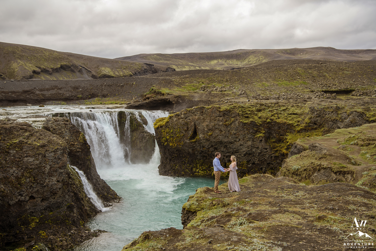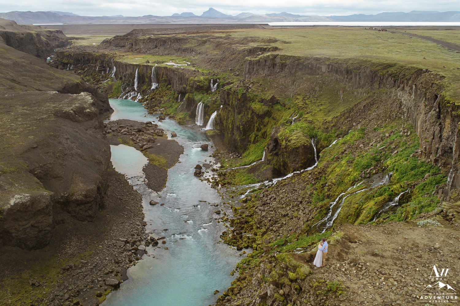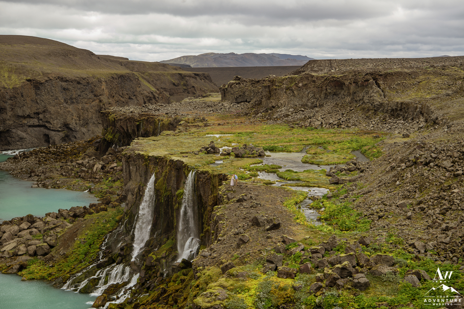 As soon as Rachel and John left last year after their August cave elopement in Iceland, they wanted to come back. Iceland is forever in their hearts. To continue their obsession for the landscape, they are both followers of our Iceland Wedding Planner Instagram account. Our team weekly goes out to scout new Iceland wedding locations (follow our Insta-Stories if you find yourself curious). One week Rachel was blown away by an area we fondly refer to as our Jurassic Park Waterfall.