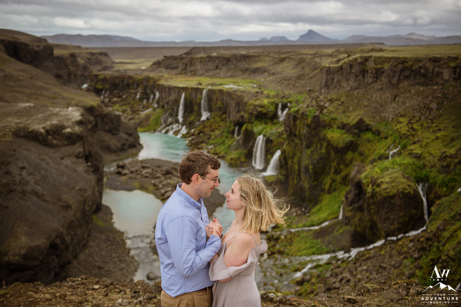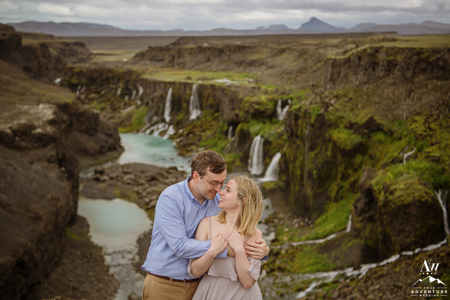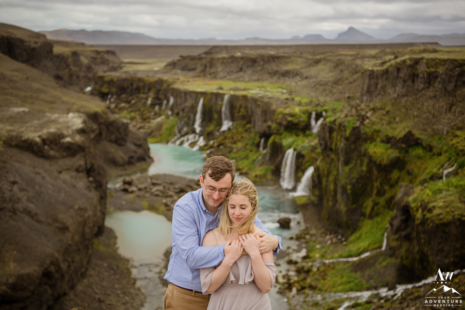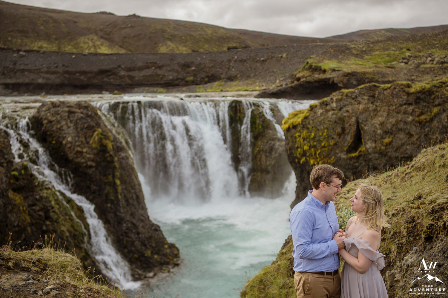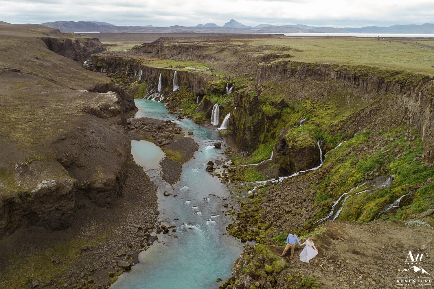 As soon as Rachel and John left last year after their August cave elopement in Iceland, they wanted to come back. Iceland is forever in their hearts. To continue their obsession for the landscape, they are both followers of our Iceland Wedding Planner Instagram account. Our team weekly goes out to scout new Iceland wedding locations (follow our Insta-Stories if you find yourself curious). One week Rachel was blown away by an area we fondly refer to as our Jurassic Park Waterfall.