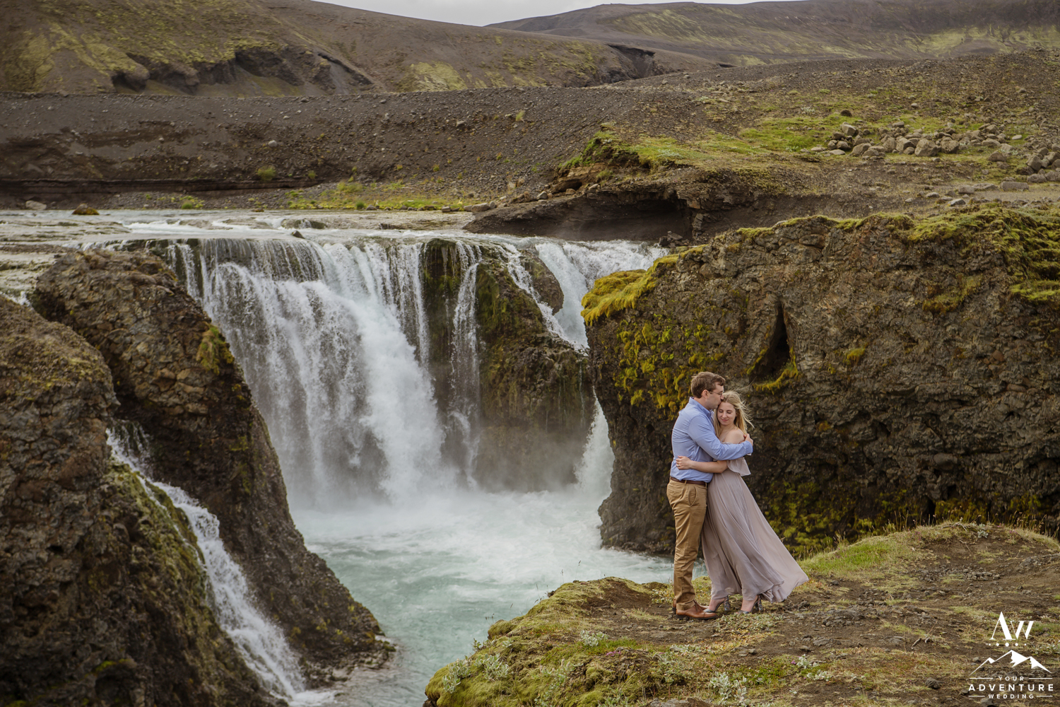 The first waterfall Rachel and John visited with our Iceland wedding photographer via red super jeep, was one that is in the highlands and hidden. Walking up to the falls they were blown away by the sounds and views. The smiles, the looks, the adoration… These two were seriously GUSHING of love!! They really get what it’s like to be a forever newlywed!