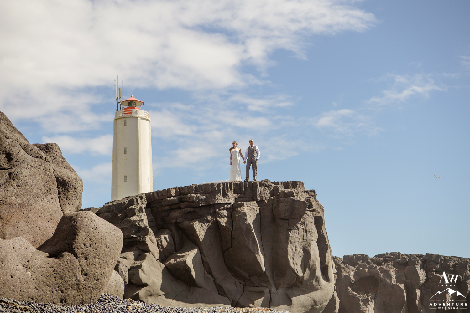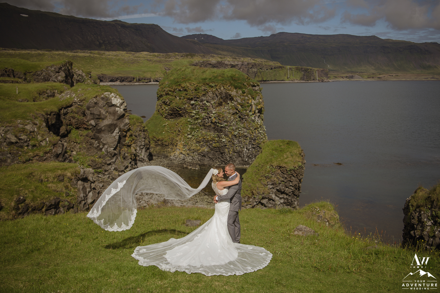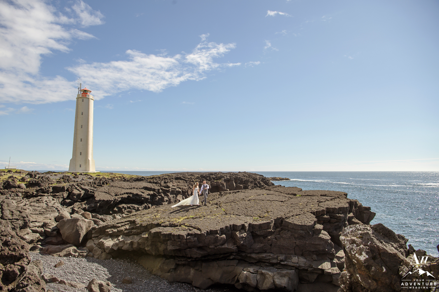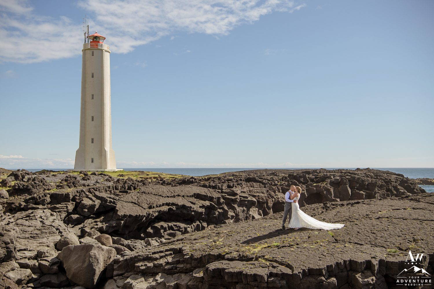 There are many lighthouses throughout the Snaefellsness Peninsula to explore. One of our personal favorites and a bit less touristy is Malarrifsviti. The area is very dramatic, with the black sand, rocks, and sea cliffs, making it an ideal backdrop for Iceland wedding photos. Nearby to this beautiful place, is the famed Londrangar Basalt Cliffs (amazing for bird watching in August)!