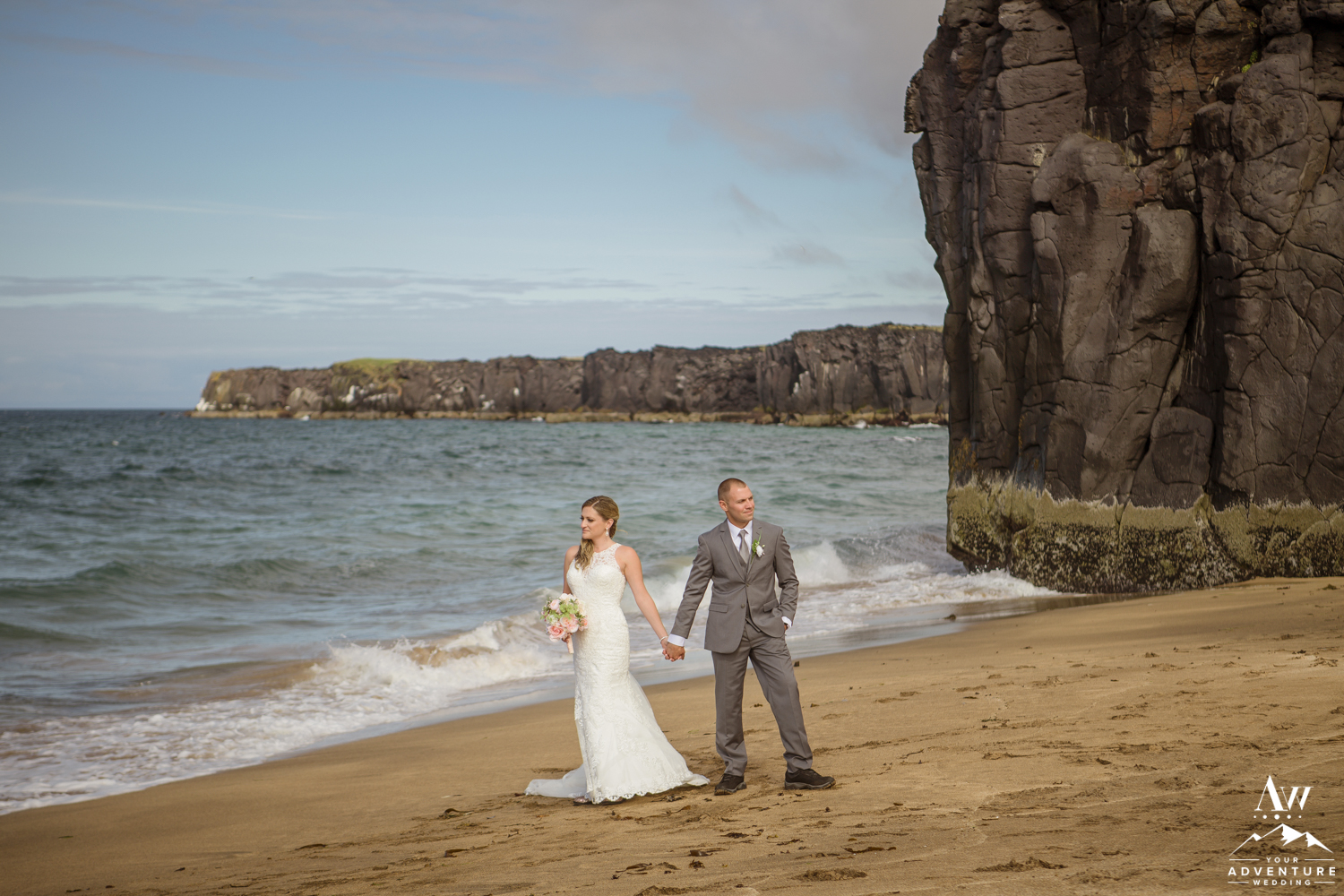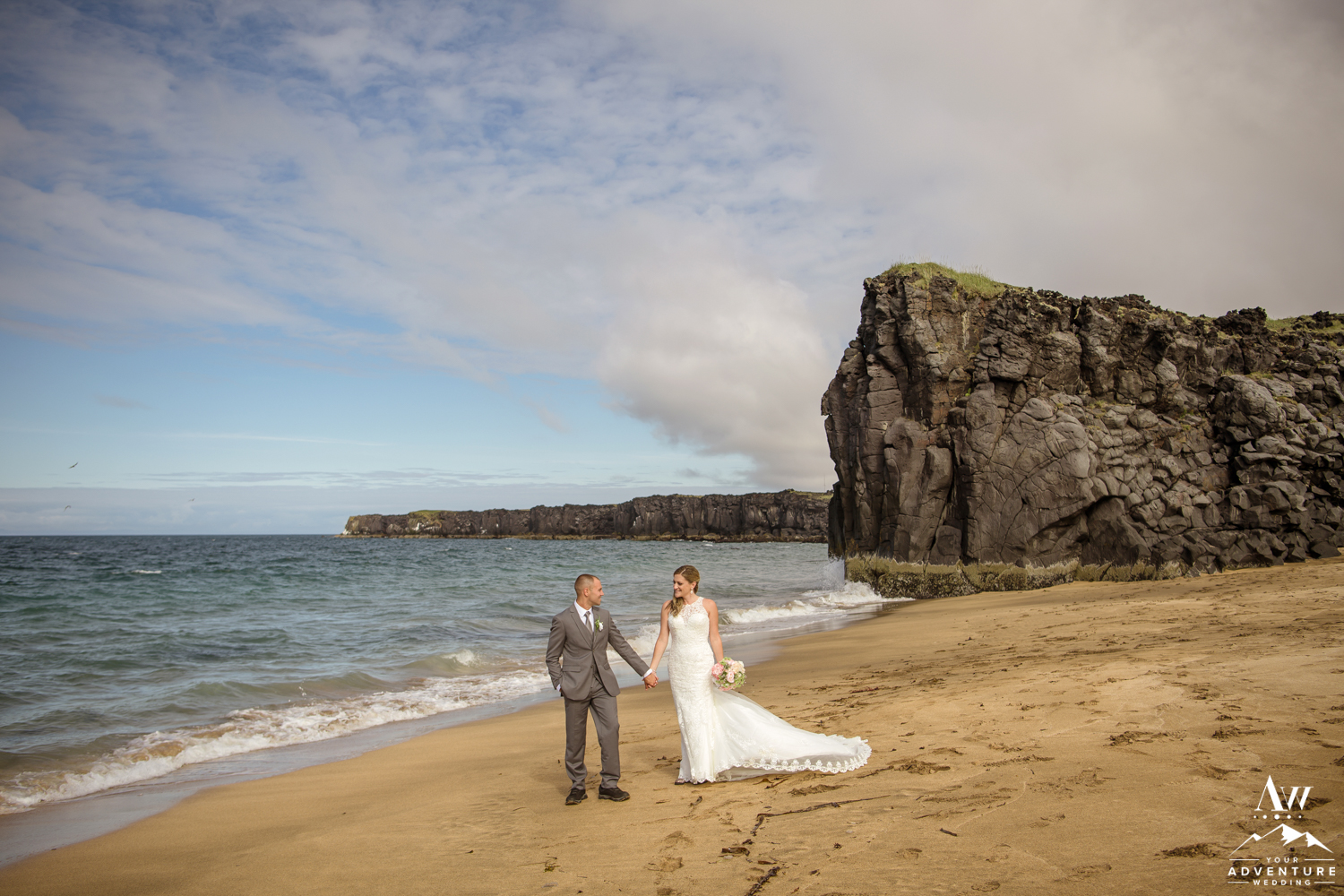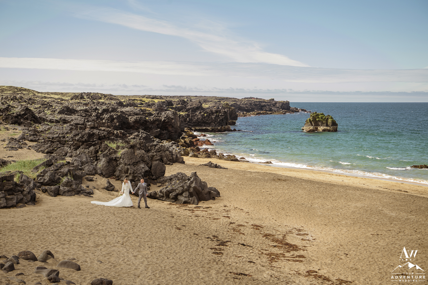 There are more black sand beaches than golden in Iceland. But the Snaefellsness Peninsula is an area that has many golden sands to delight in. Skarðsvík Beach is one of our favorites to explore when having an Iceland wedding at Hotel Glymur. It has high sea cliffs, docile waves, sparkly sand, and sometimes a view of the Snaefellsjökull Glacier on a clear day! Brooke, Ricky, and their 70+ Iceland wedding guests thorough enjoyed their time here exploring the beach!