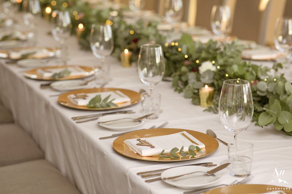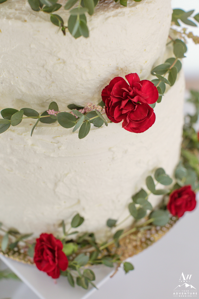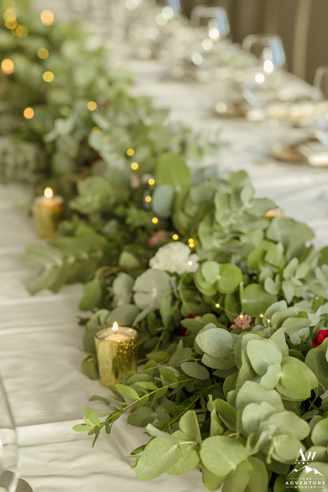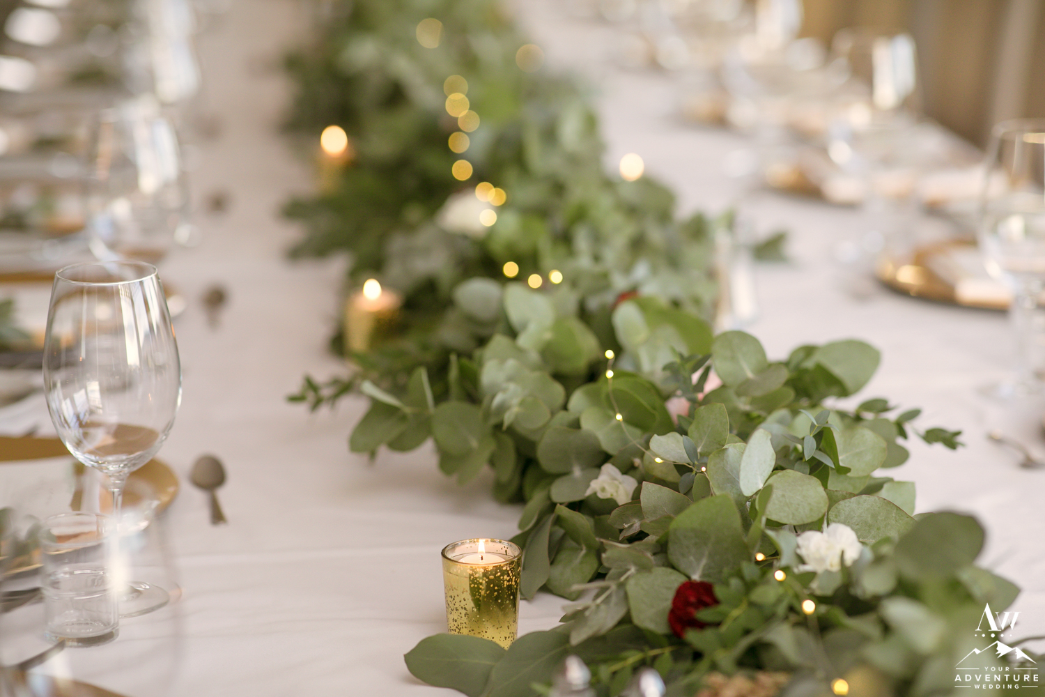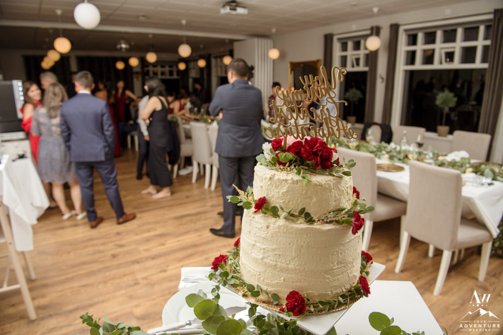 The theme of the luxury wedding Iceland reception was mountain romance. The views from the reception space was a 180 agree view of the mountains. And on the table there was an incredible eucalyptus garland with pops of reds and pinks alongside of the fairy lights. Our stylist Tinna crafted some gorgeous magic both table side and on the cake!