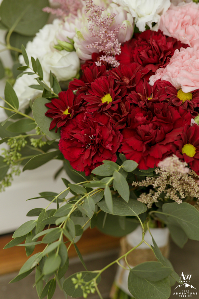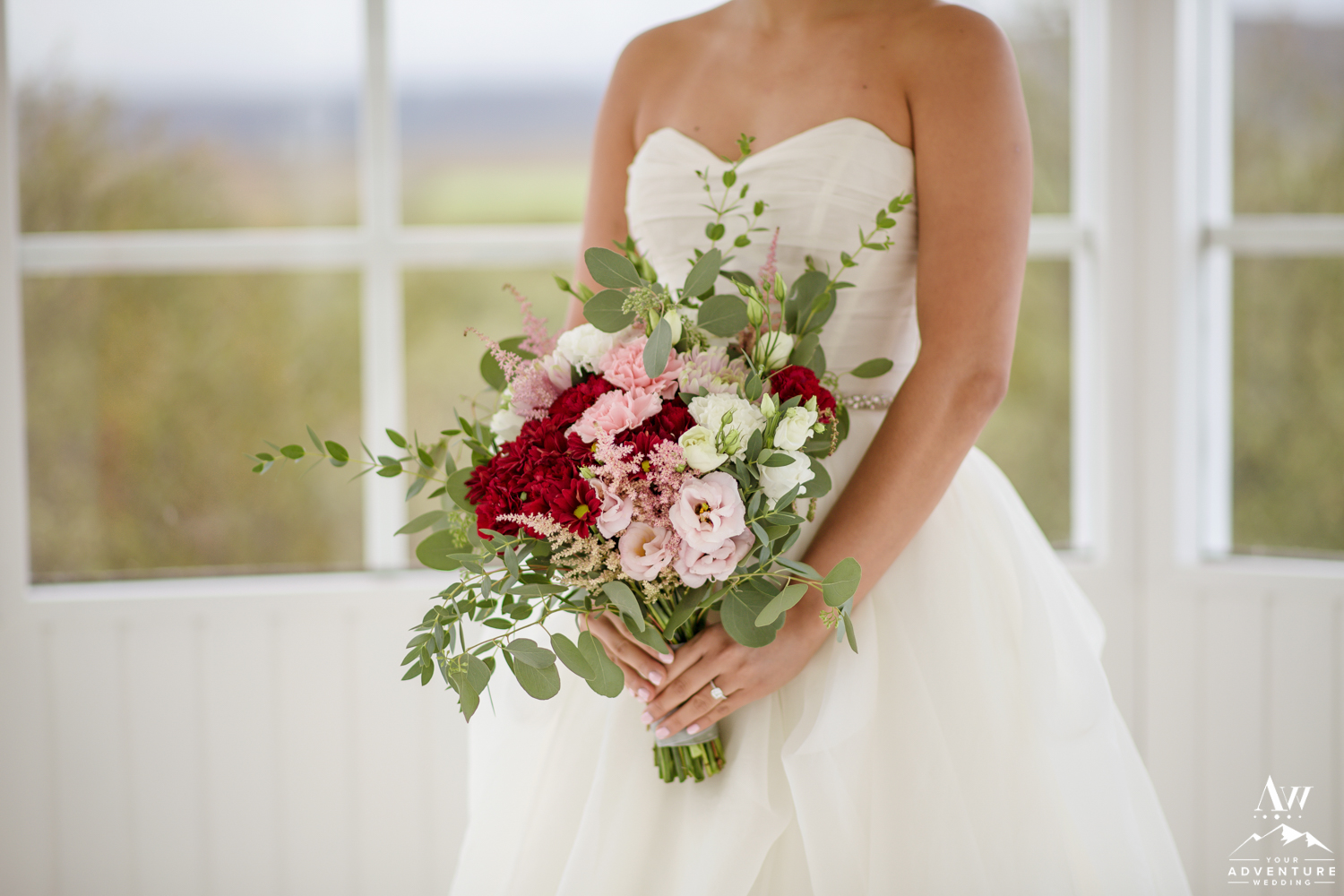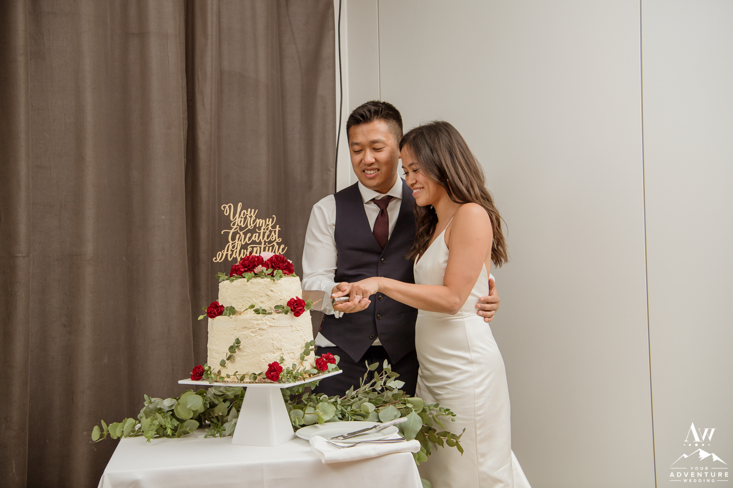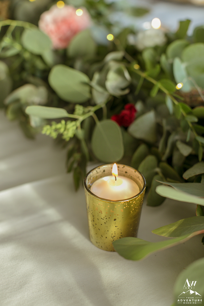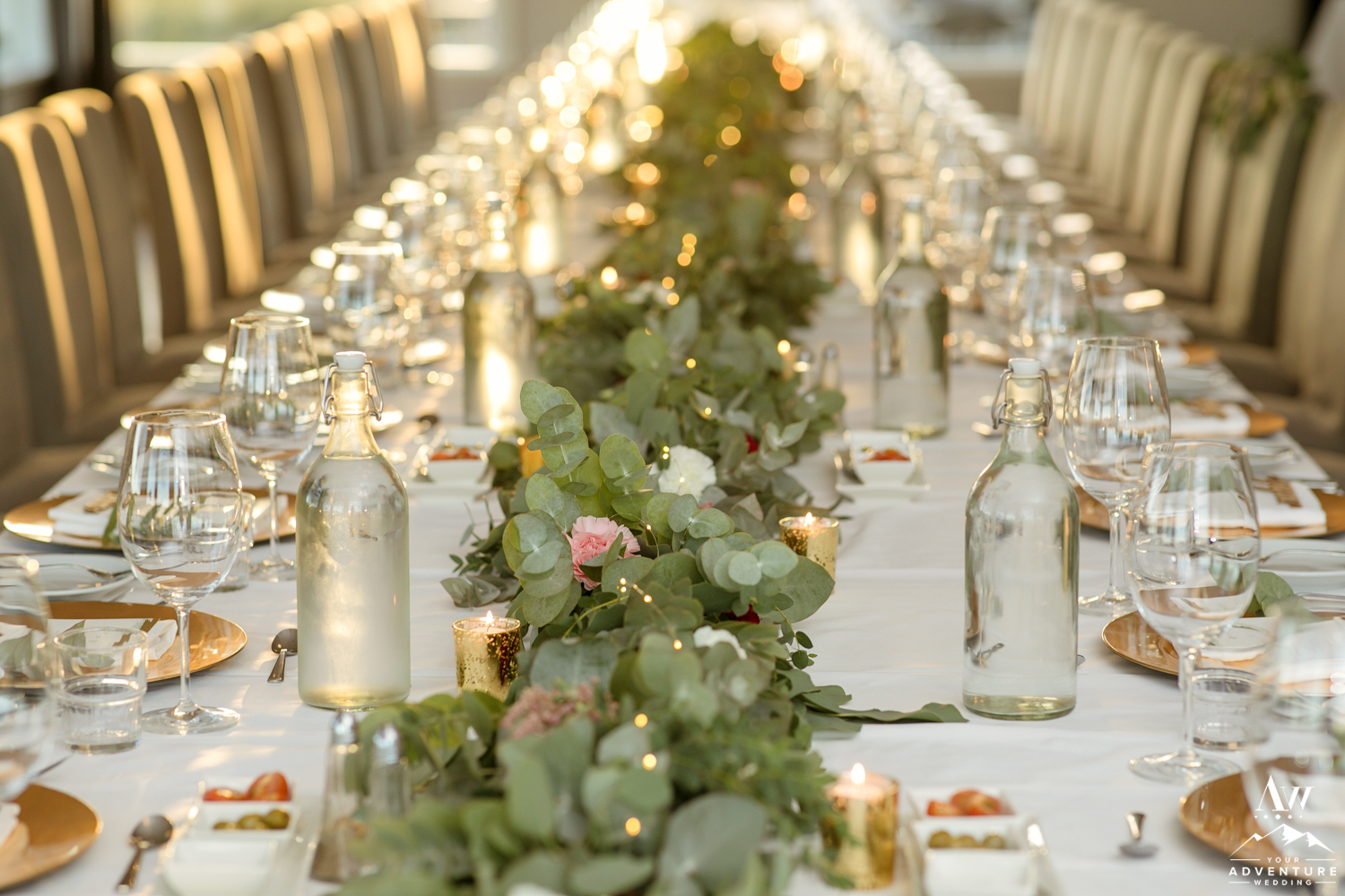 The theme of the luxury wedding Iceland reception was mountain romance. The views from the reception space was a 180 agree view of the mountains. And on the table there was an incredible eucalyptus garland with pops of reds and pinks alongside of the fairy lights. Our stylist Tinna crafted some gorgeous magic both table side and on the cake!