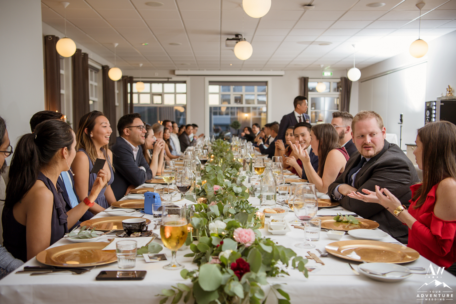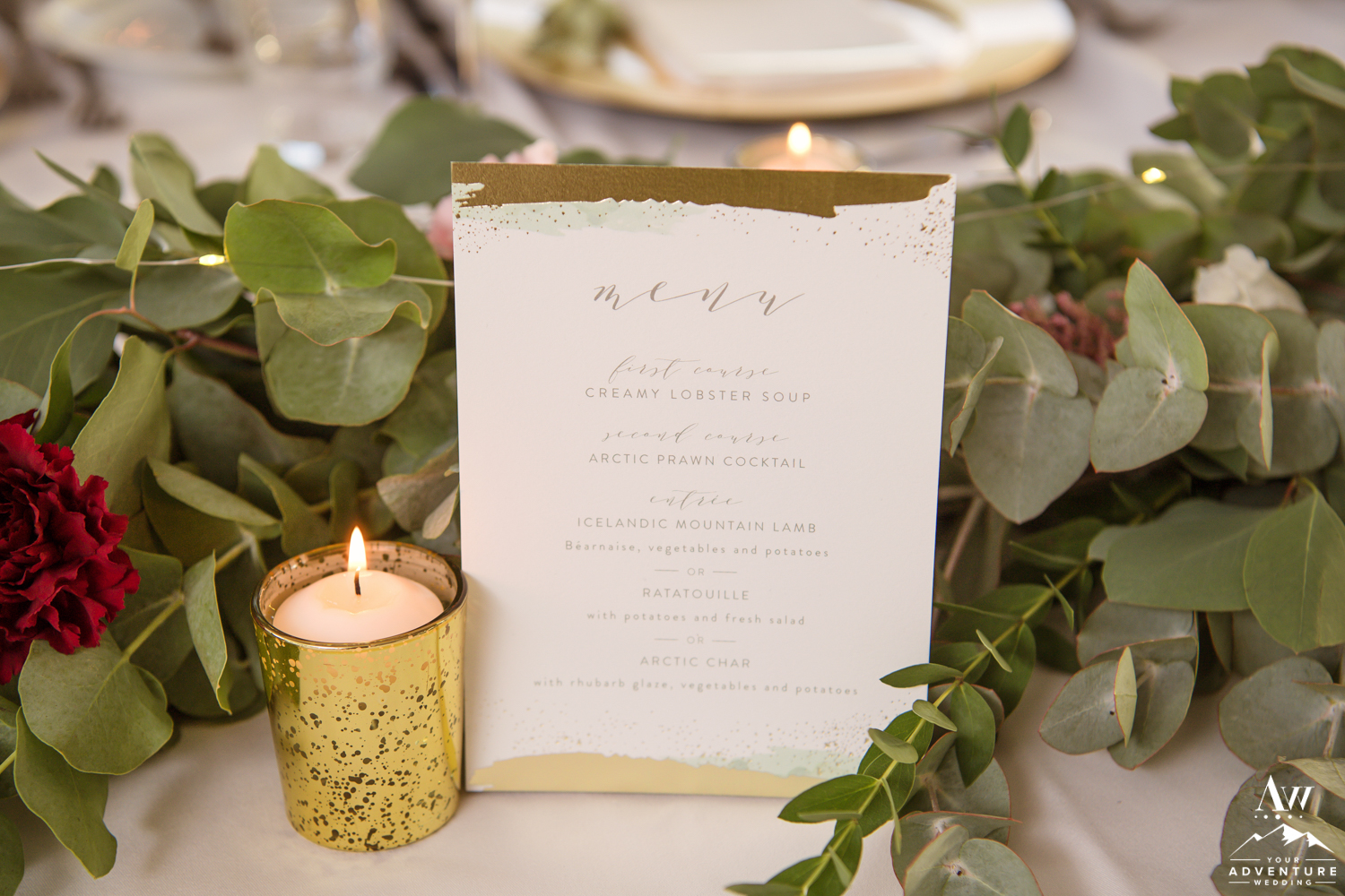 Gold accents flowed through the table from the charger plates, place cards, and elegant Iceland wedding menus. Being foodies, it was important to Lily and Ray they have a 3 traditional Icelandic courses plus an American style wedding cake. How fun to have a “You Are My Greatest Adventure” wedding cake topper too? Around midnight the group took to the 4 bedroom house, gazebo, and hot tub for a luxury after party!