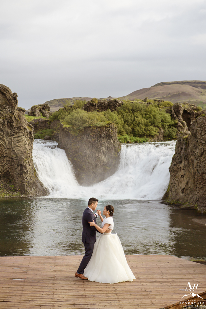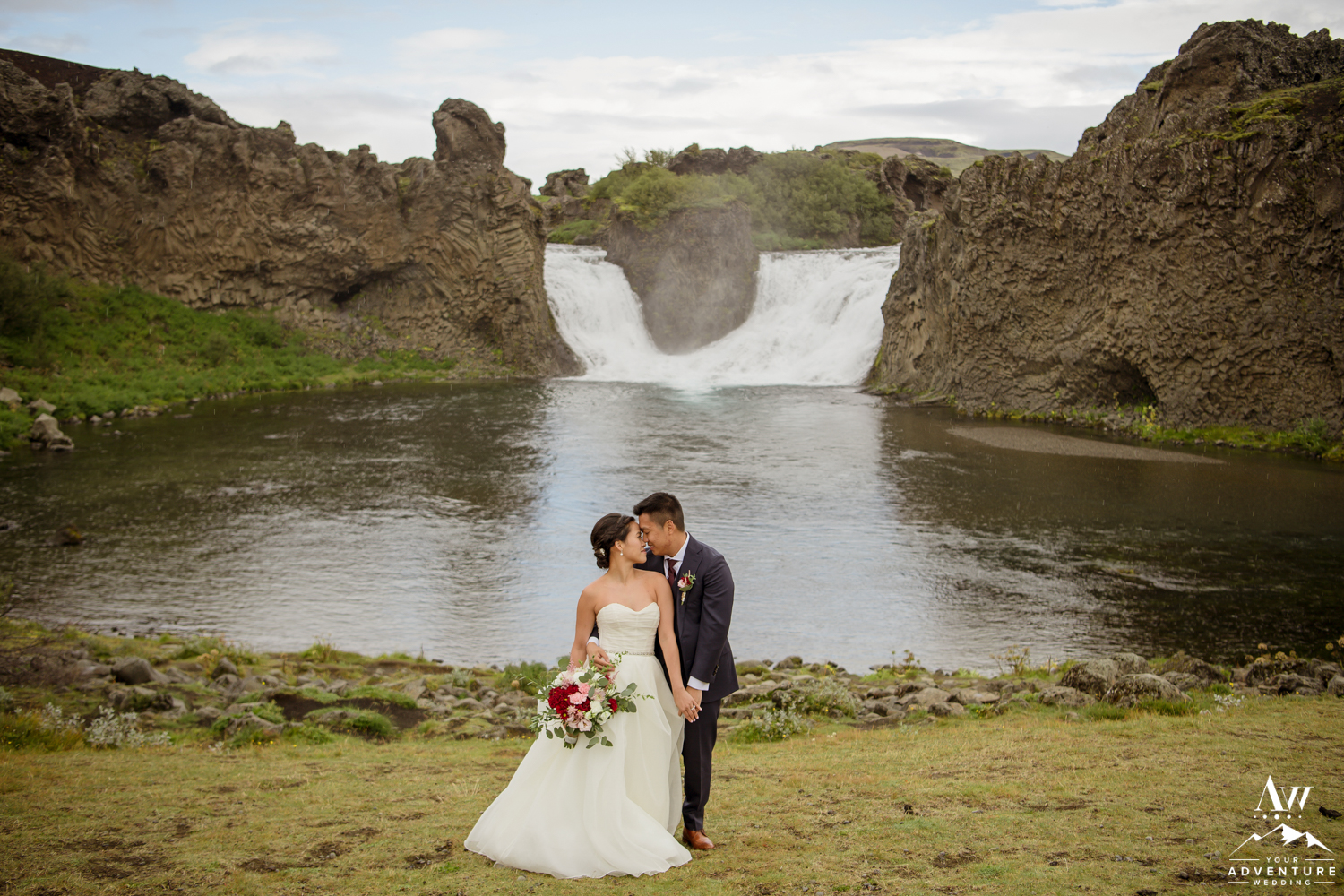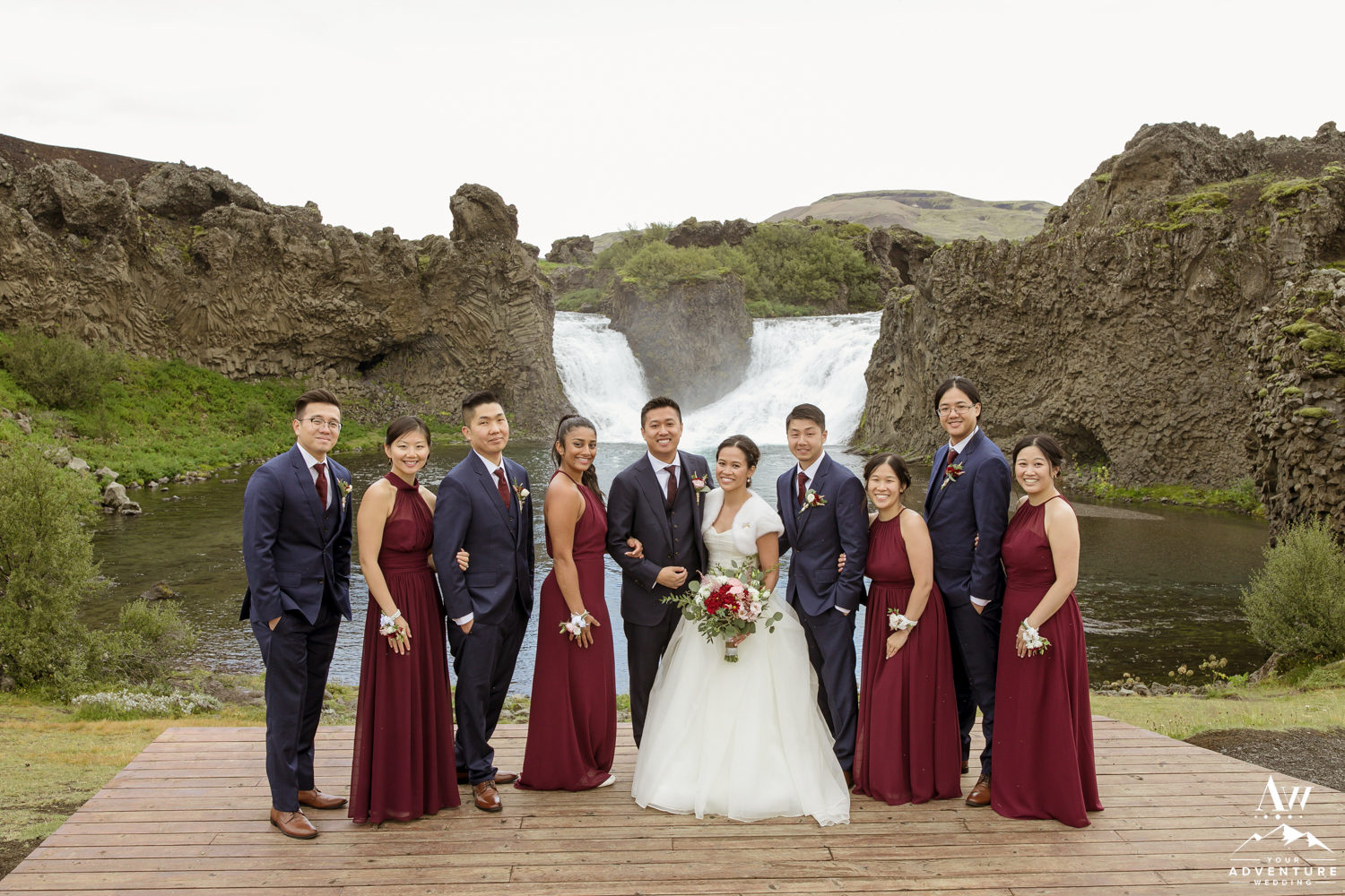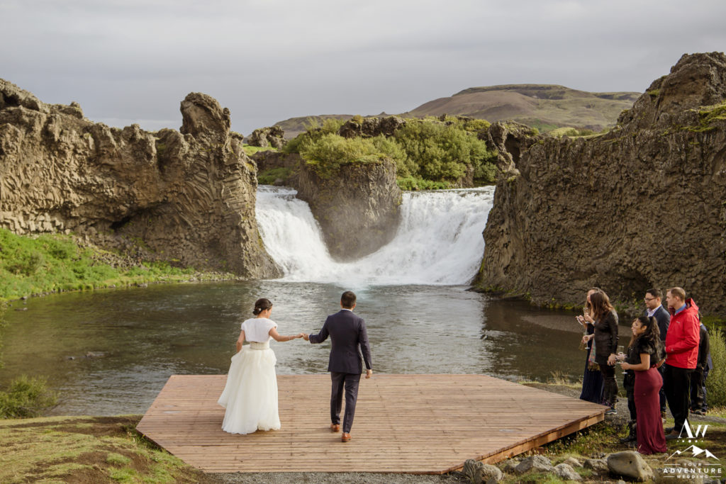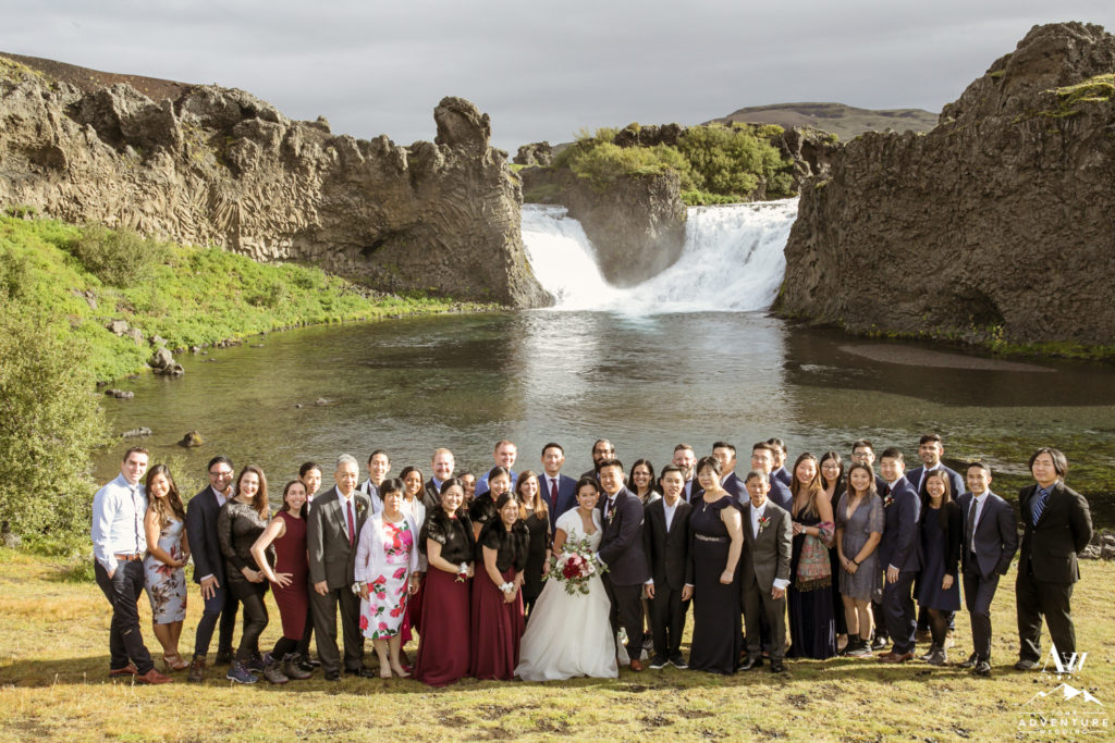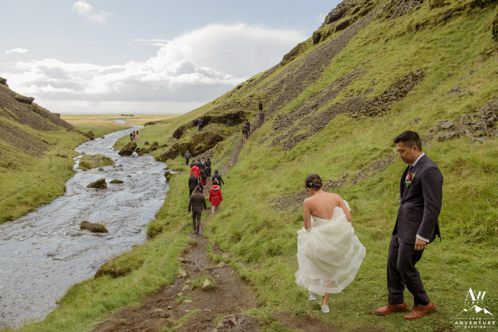 What adventure wedding would be complete without having a traditional hot dog BBQ for lunch and hiking?! None! Our team was onsite upon arrival of Ray and Lily’s Iceland wedding group, with special permission to hold a hot dog BBQ at a hidden waterfall. The guests thoroughly enjoyed the traditional luxury wedding Iceland experience! Afterwards, the group embarked on a short 15 minute hike to a hidden canyon waterfall as part of the adventurous wedding day agenda.