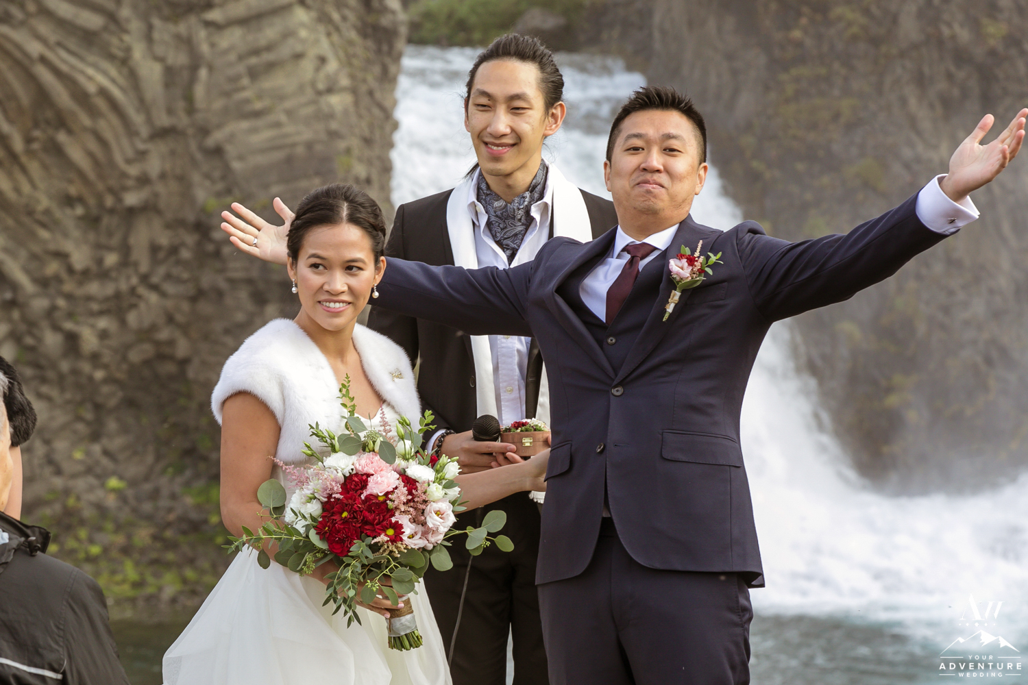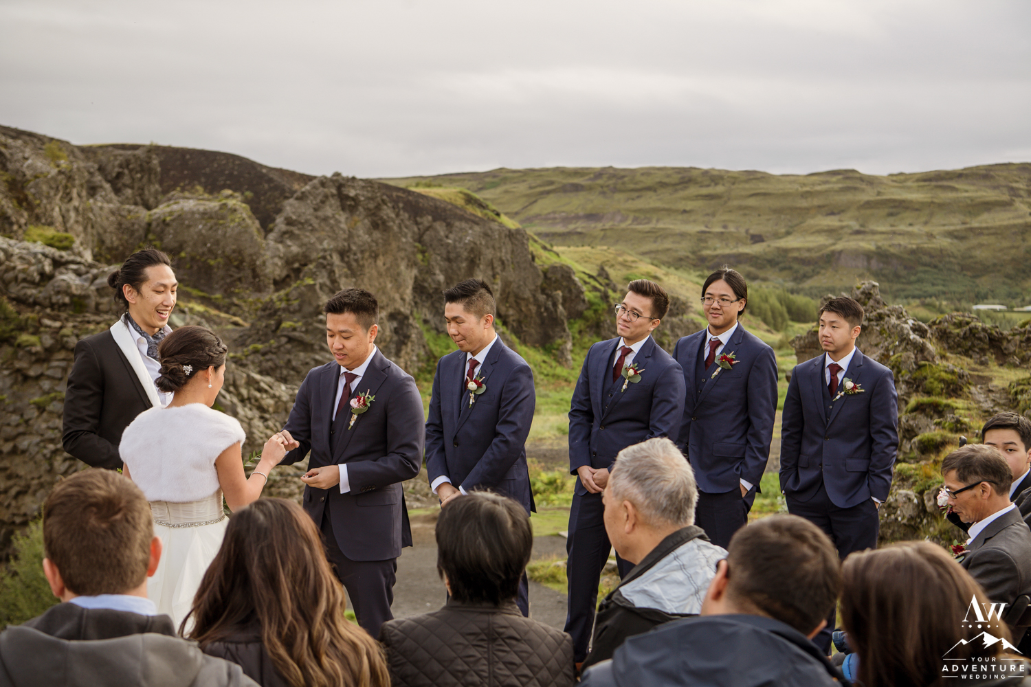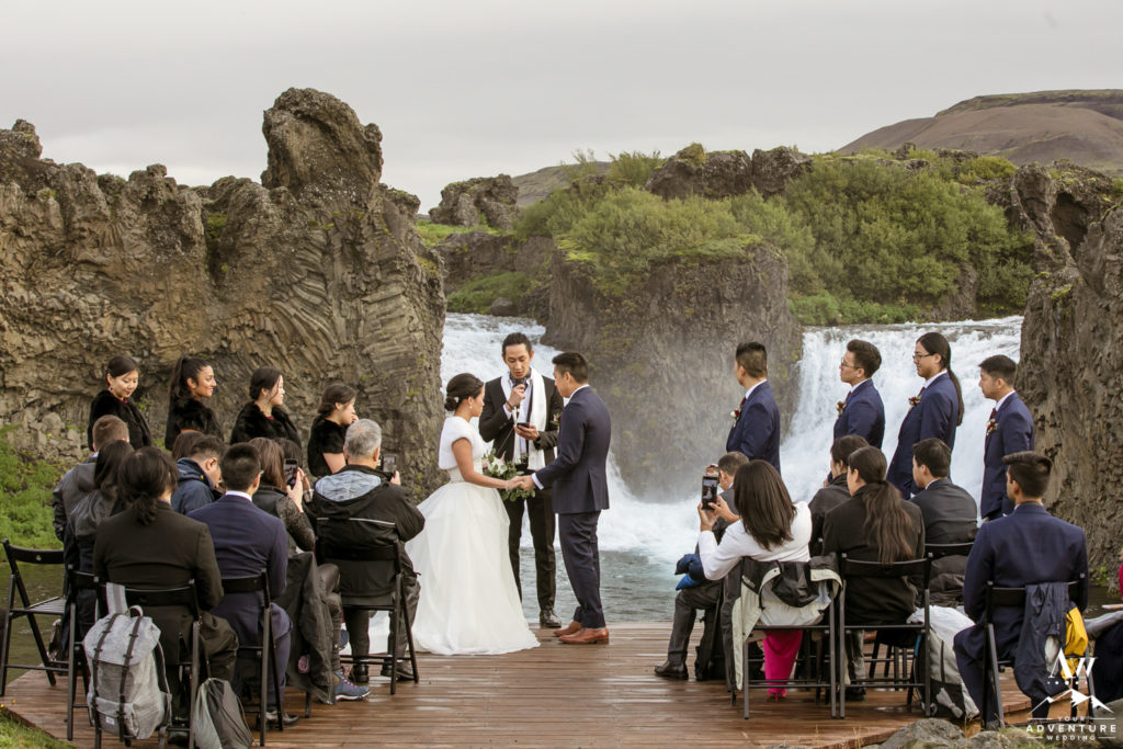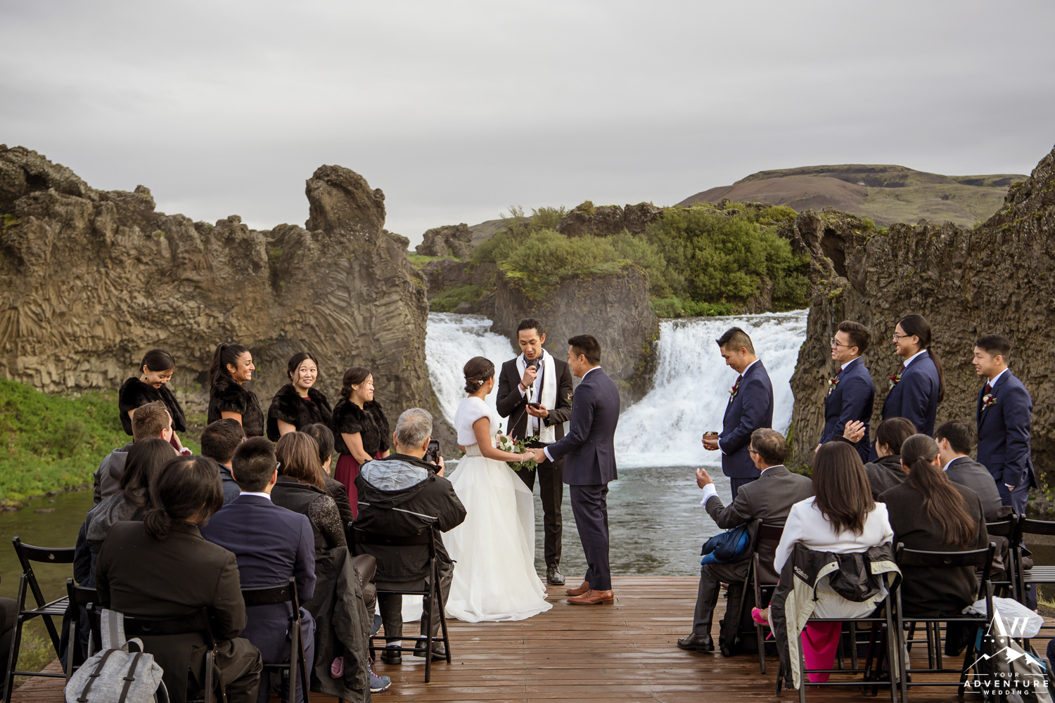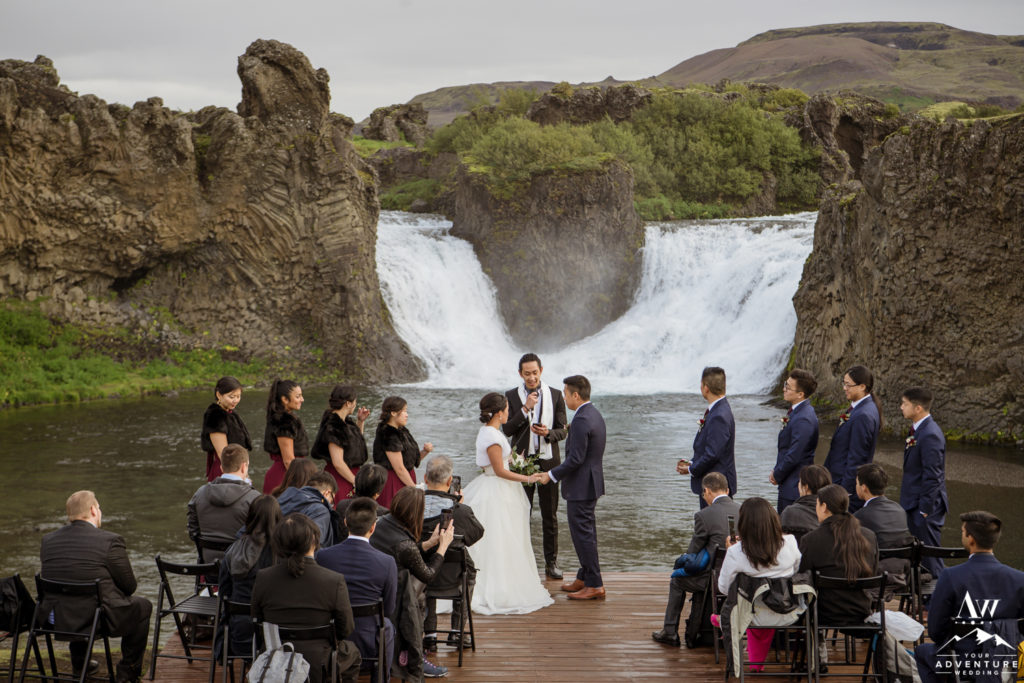Ceremony locations should have a special meaning to you or at the very least leave you and your Iceland wedding guests in inspiring awe! Holding their luxury wedding Iceland ceremony at a unity waterfall was perfect for Lily and Ray! Their bridal party had a gorgeous walk down the aisle while their guests remained seated in black wooden folding chairs! Lily and Ray’s close friend lead the short and sweet ceremony and everyone LOVED it!