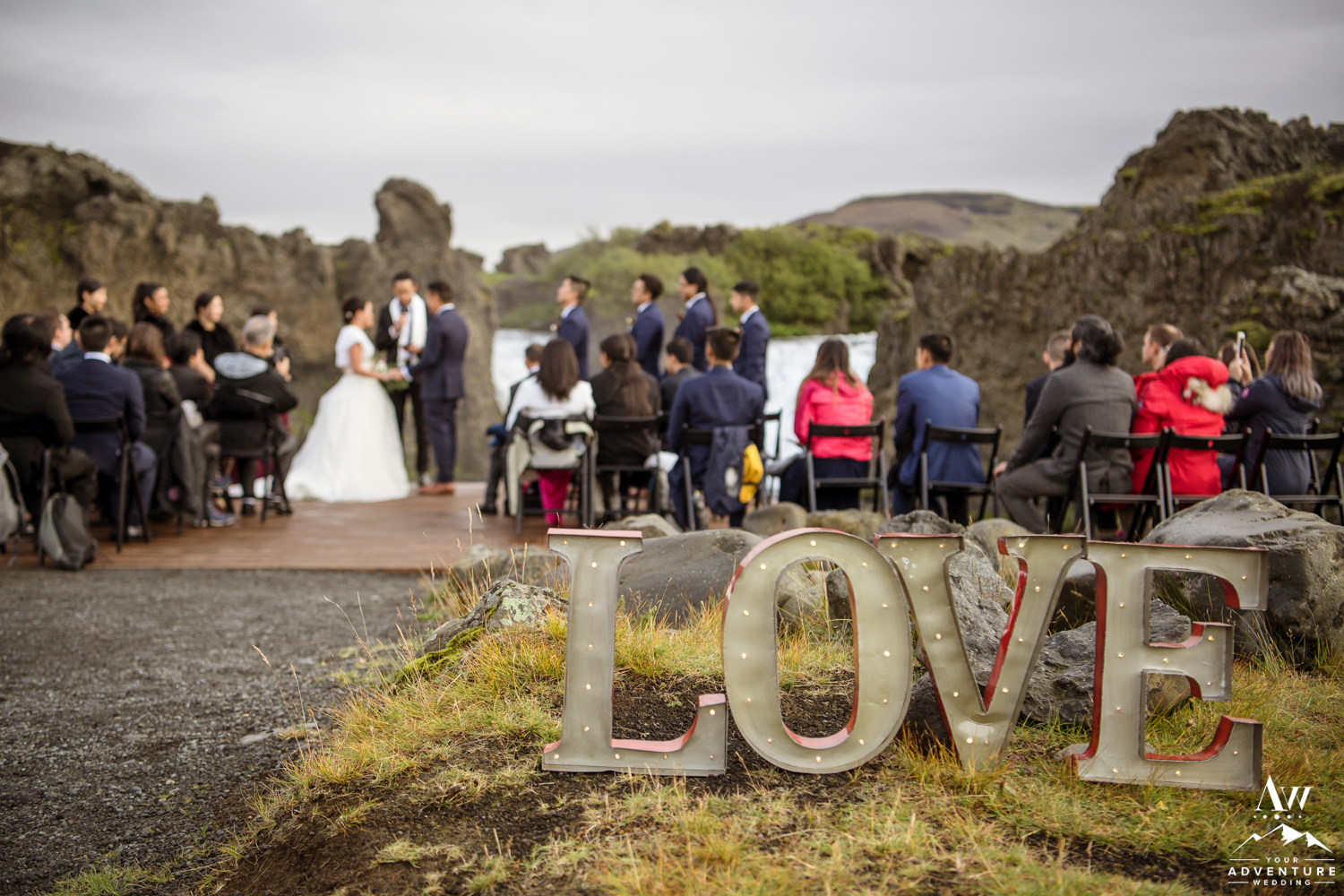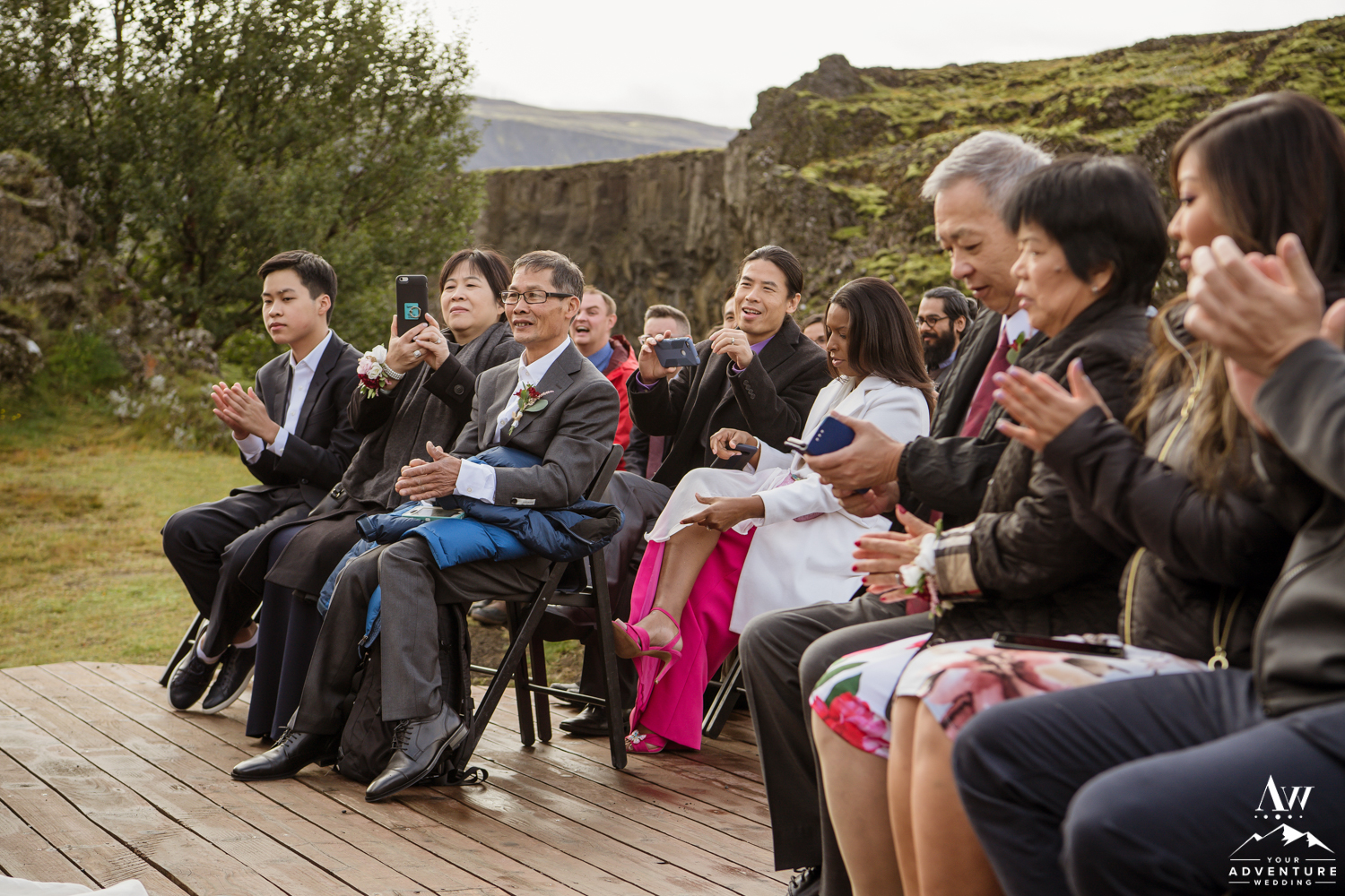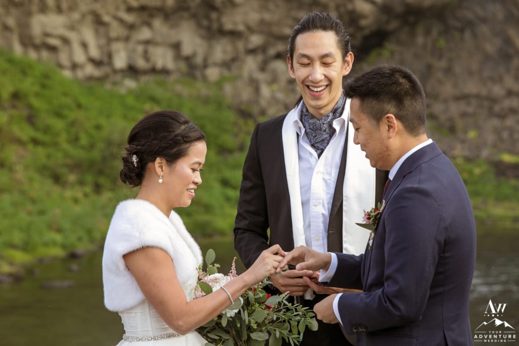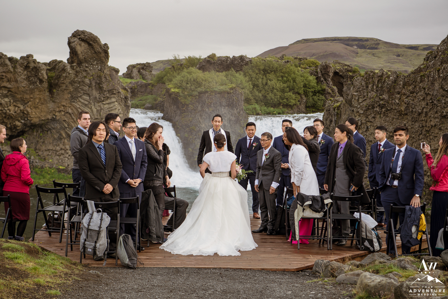 Ceremony locations should have a special meaning to you or at the very least leave you and your Iceland wedding guests in inspiring awe! Holding their luxury wedding Iceland ceremony at a unity waterfall was perfect for Lily and Ray! Their bridal party had a gorgeous walk down the aisle while their guests remained seated in black wooden folding chairs! Lily and Ray’s close friend lead the short and sweet ceremony and everyone LOVED it!