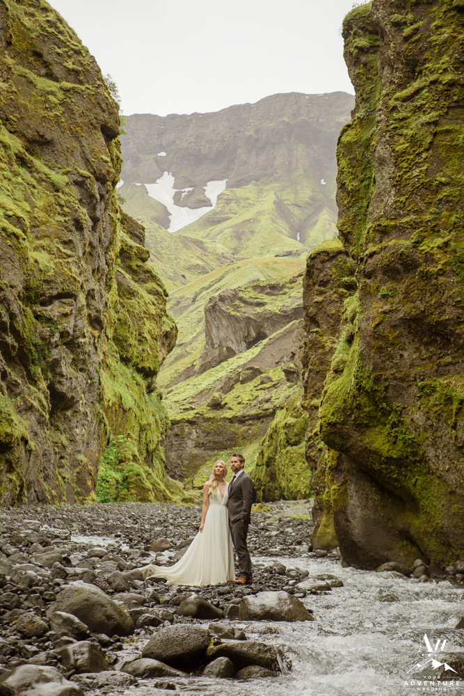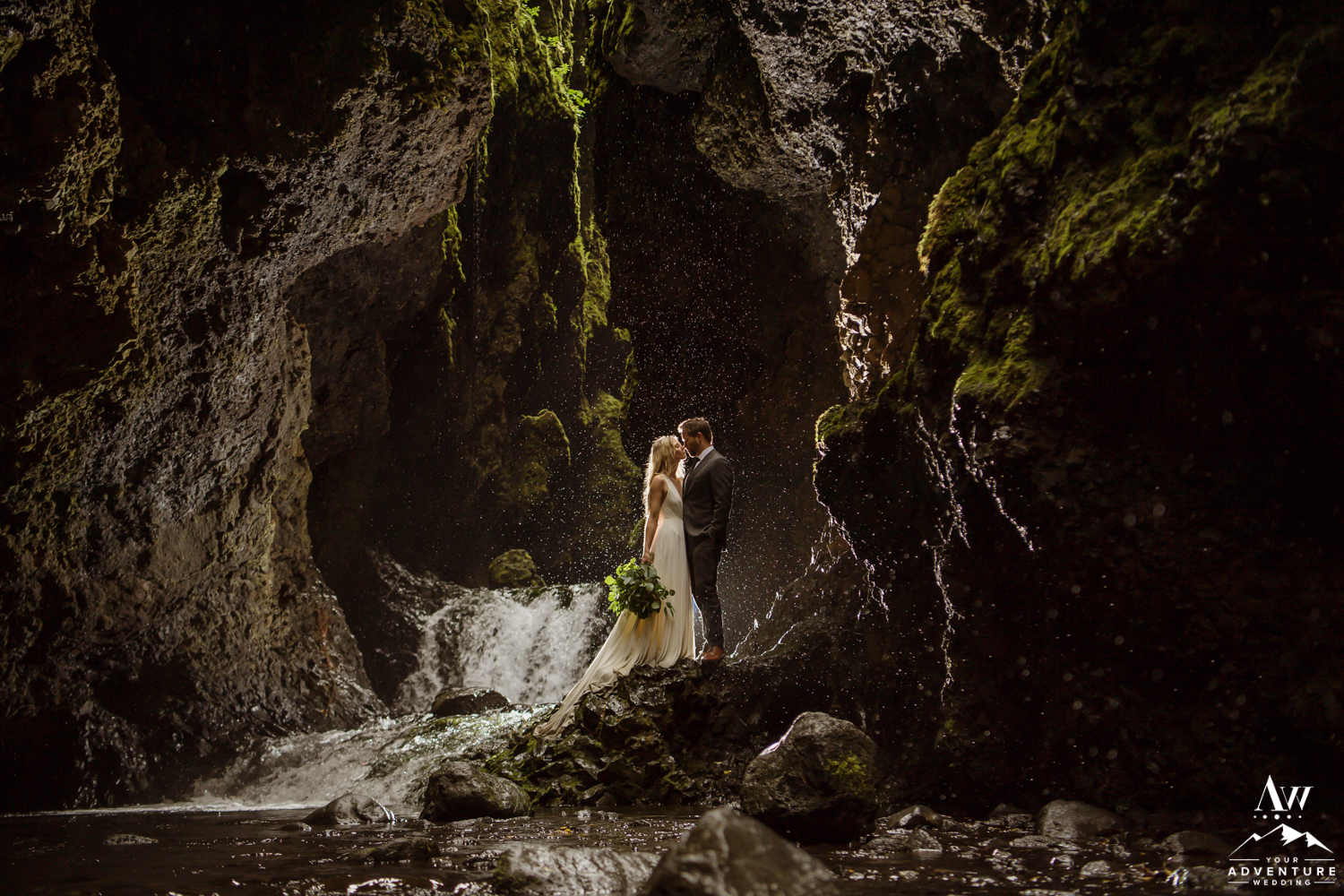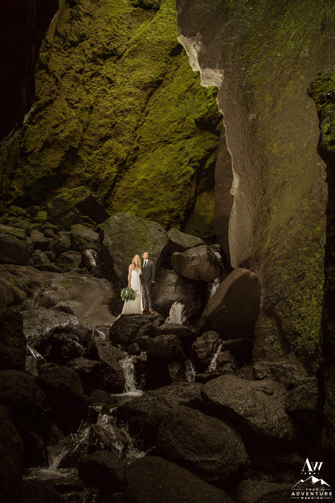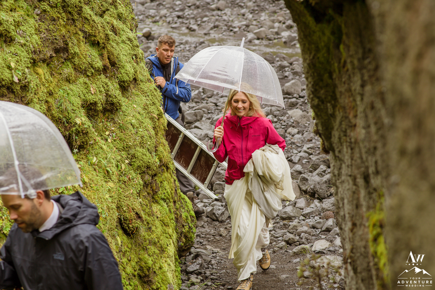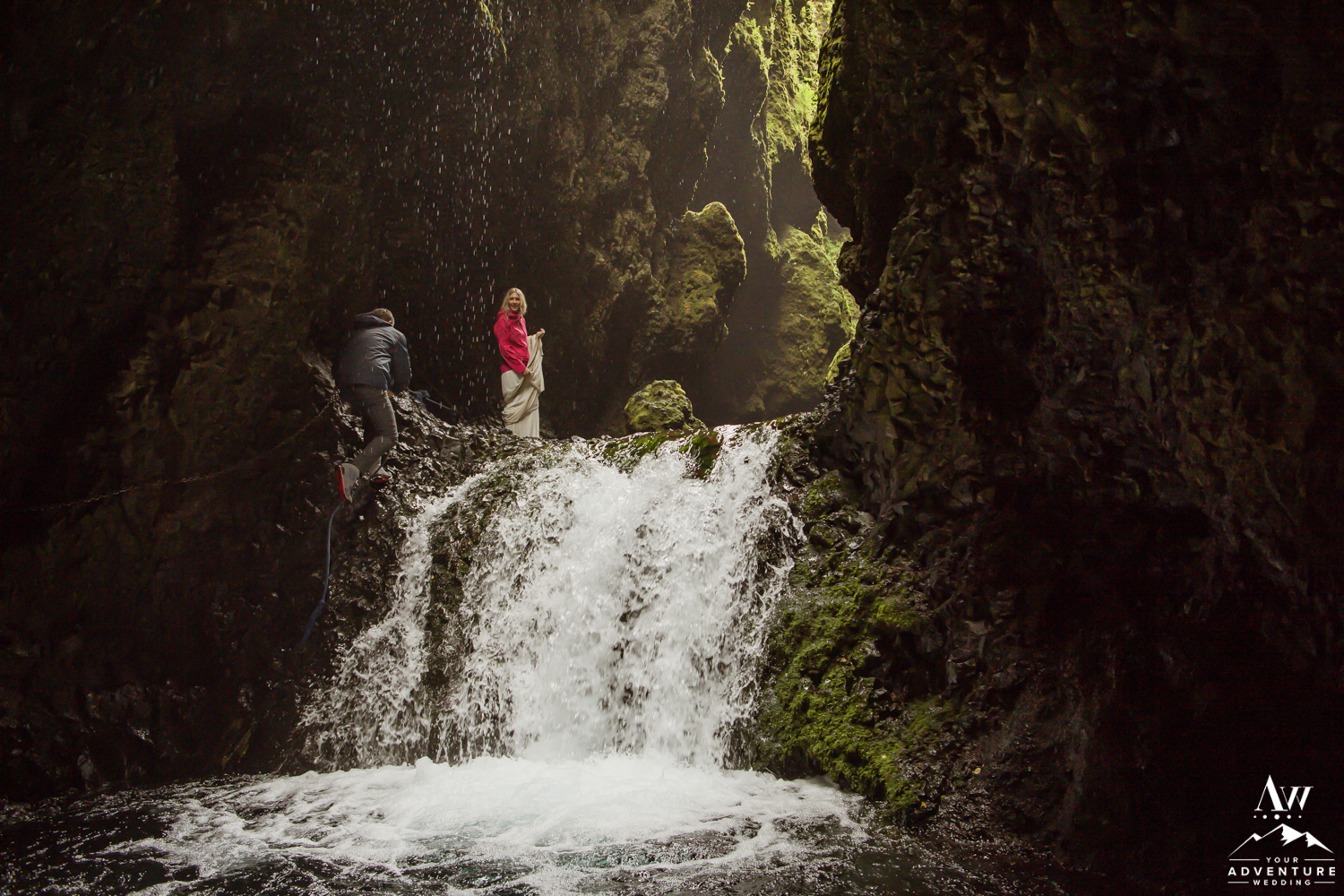 Okay okay, so hiking on your wedding day may be no big deal to most of your out there. But what do you think about hiking up a waterfall and then rock climbing over about 6 foot gorge, and then hiking the rest of the way literally through knee high water? Are you in or are you out? Heather and Mike opted in along with their Iceland elopement photographer, Ann! Side note… There may or may not have been shots of Brennivin as a reward at the end and Iceland elopement photographer, Ann Peters could have been wearing waders, I dunno! 😉