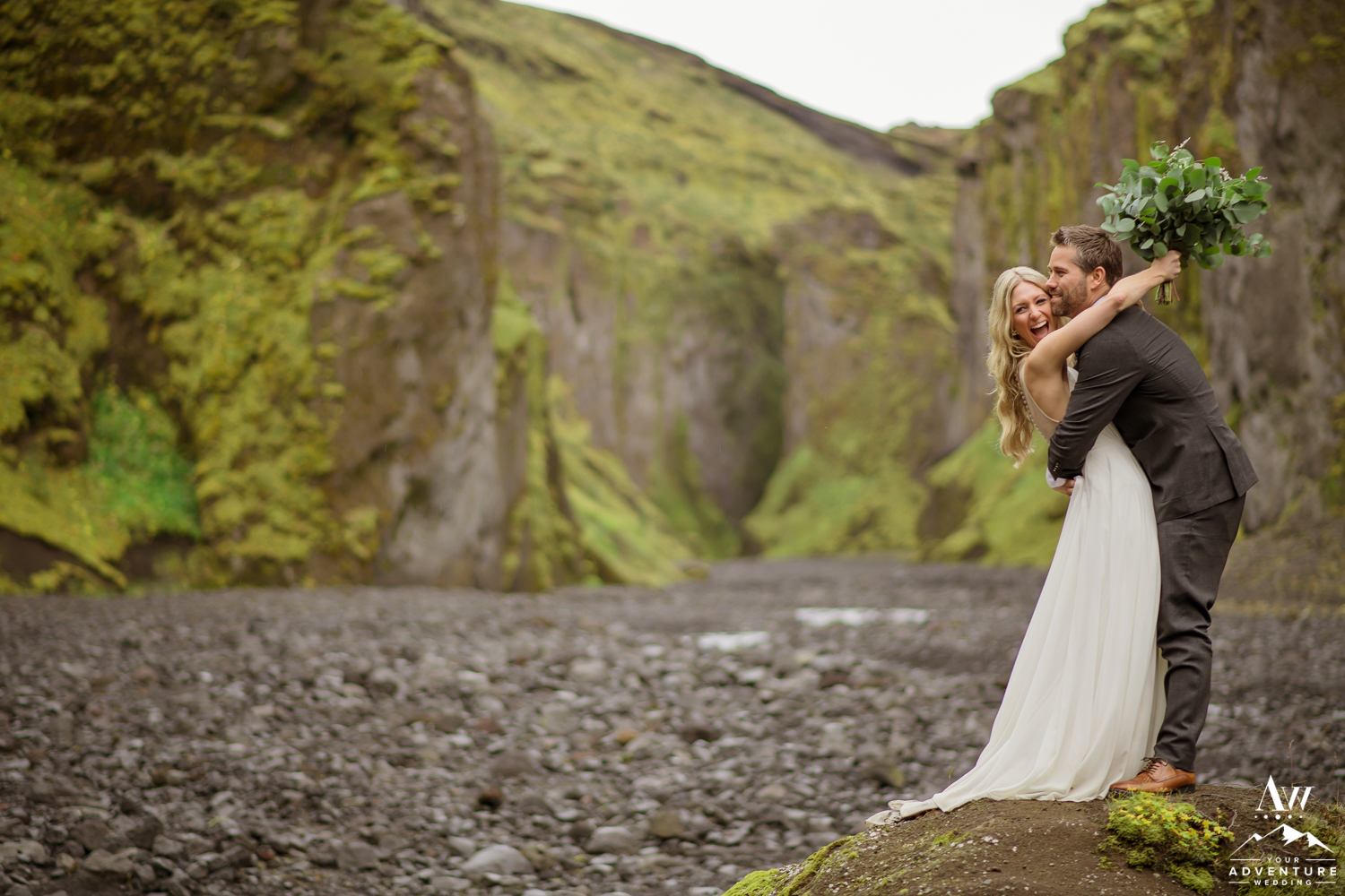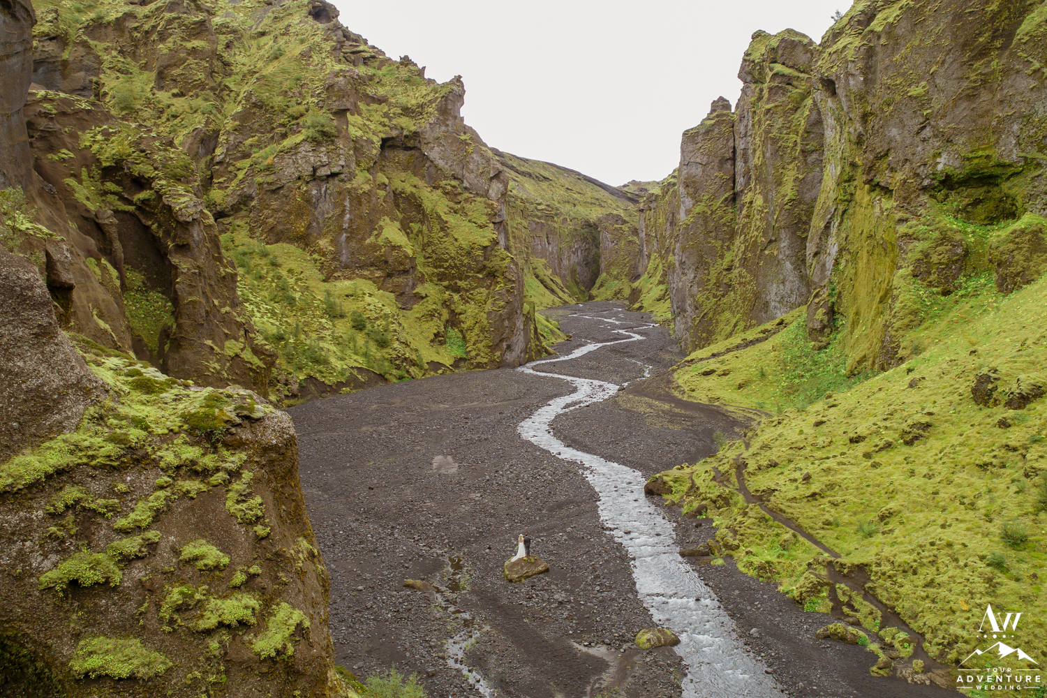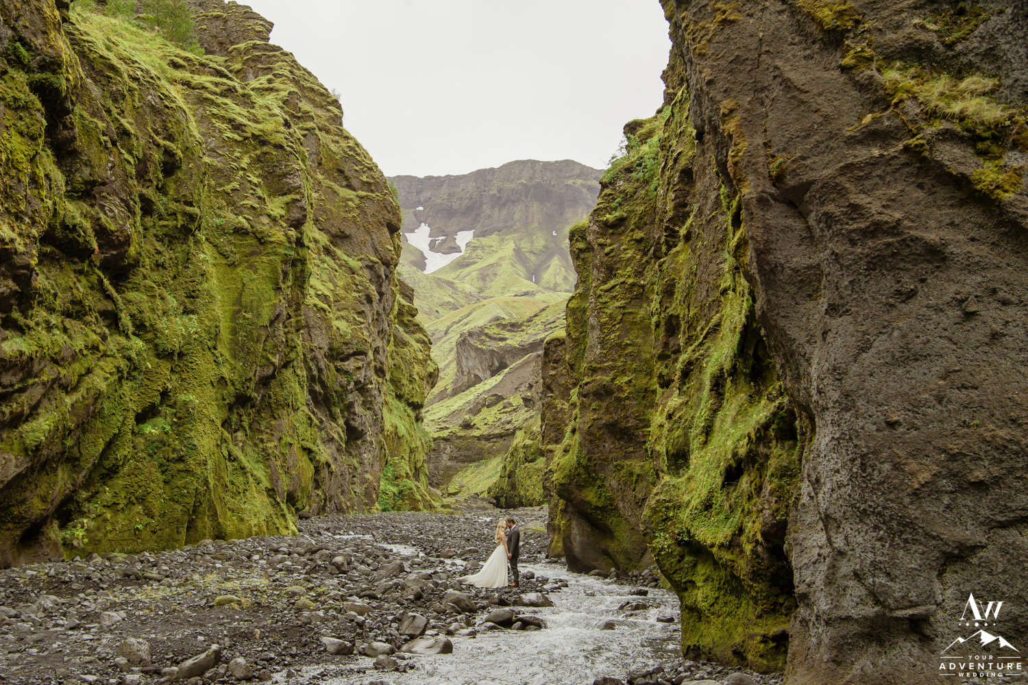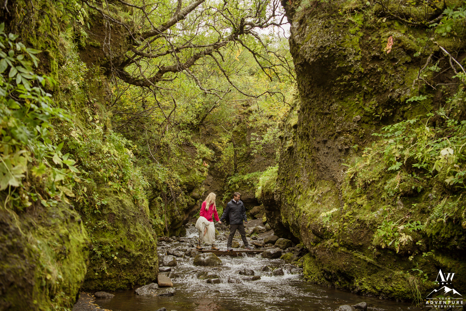 Okay okay, so hiking on your wedding day may be no big deal to most of your out there. But what do you think about hiking up a waterfall and then rock climbing over about 6 foot gorge, and then hiking the rest of the way literally through knee high water? Are you in or are you out? Heather and Mike opted in along with their Iceland elopement photographer, Ann! Side note… There may or may not have been shots of Brennivin as a reward at the end and Iceland elopement photographer, Ann Peters could have been wearing waders, I dunno! 😉