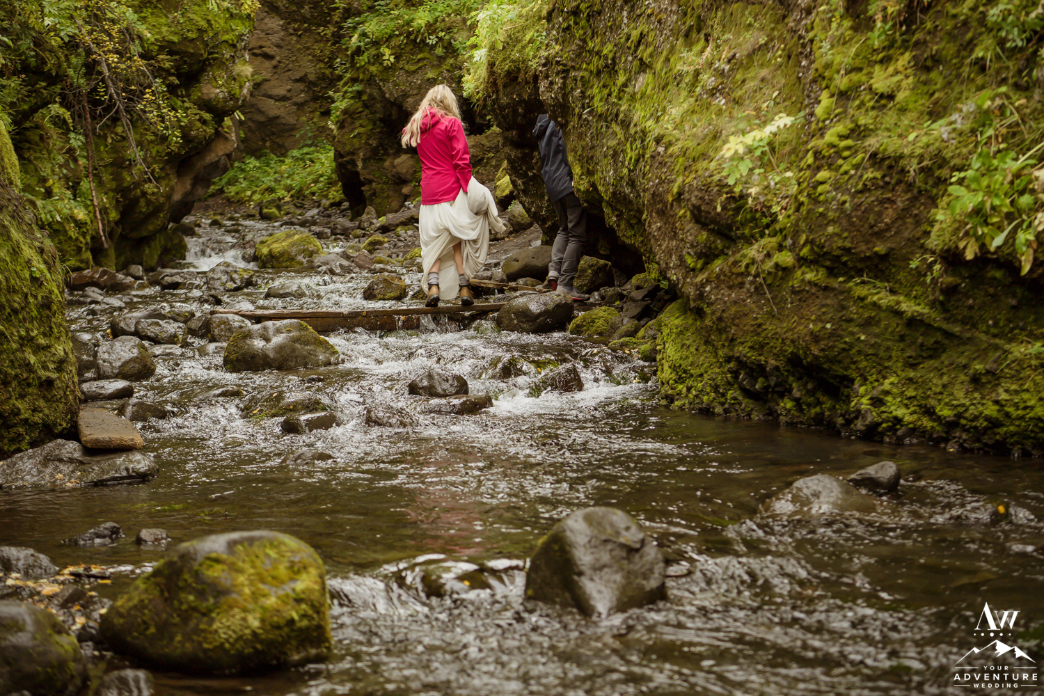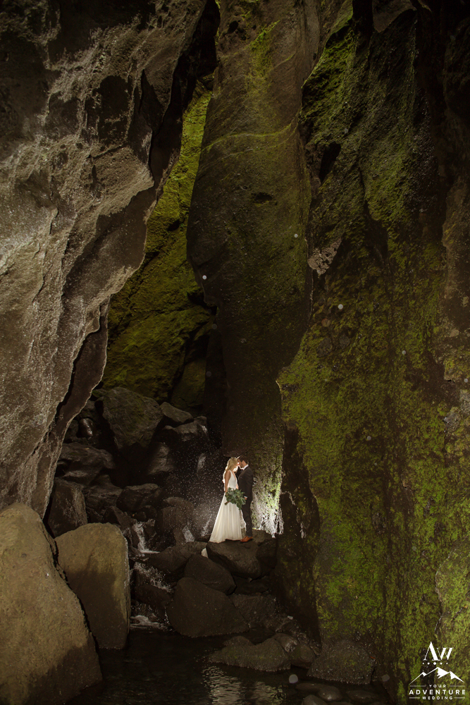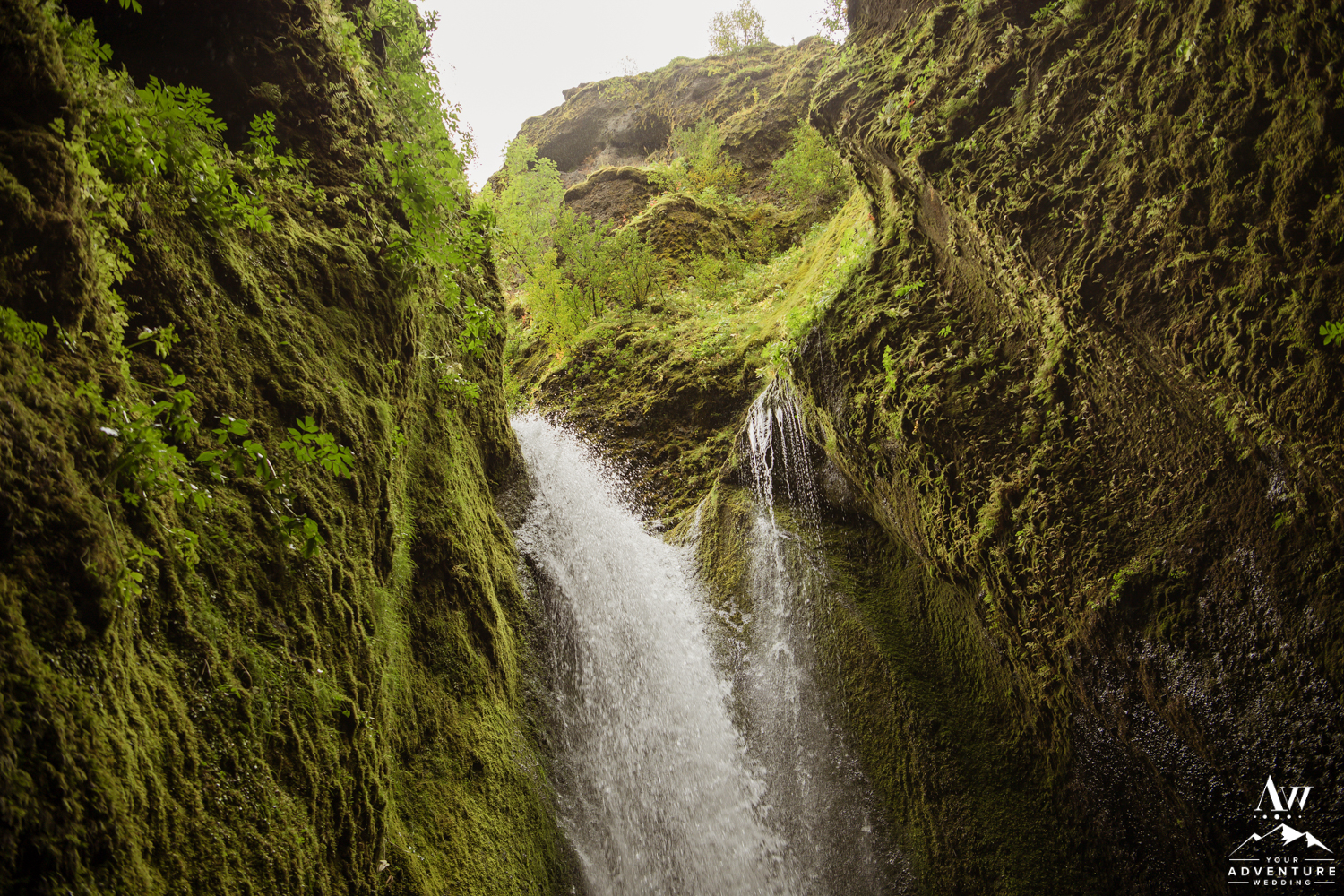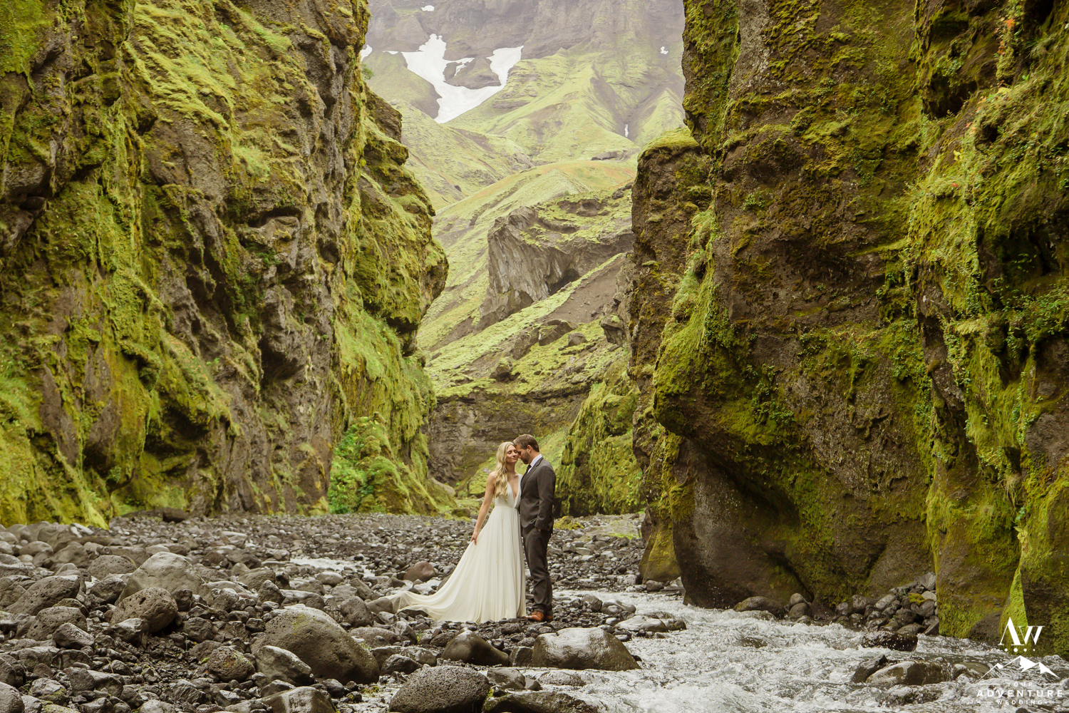 Okay okay, so hiking on your wedding day may be no big deal to most of your out there. But what do you think about hiking up a waterfall and then rock climbing over about 6 foot gorge, and then hiking the rest of the way literally through knee high water? Are you in or are you out? Heather and Mike opted in along with their Iceland elopement photographer, Ann! Side note… There may or may not have been shots of Brennivin as a reward at the end and Iceland elopement photographer, Ann Peters could have been wearing waders, I dunno! 😉