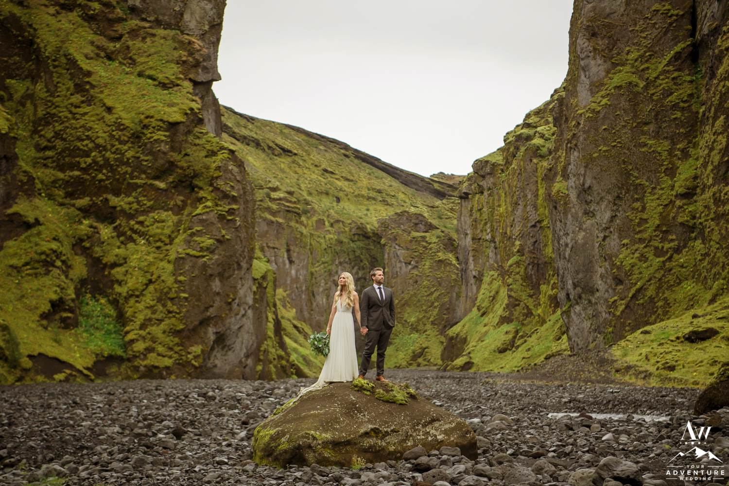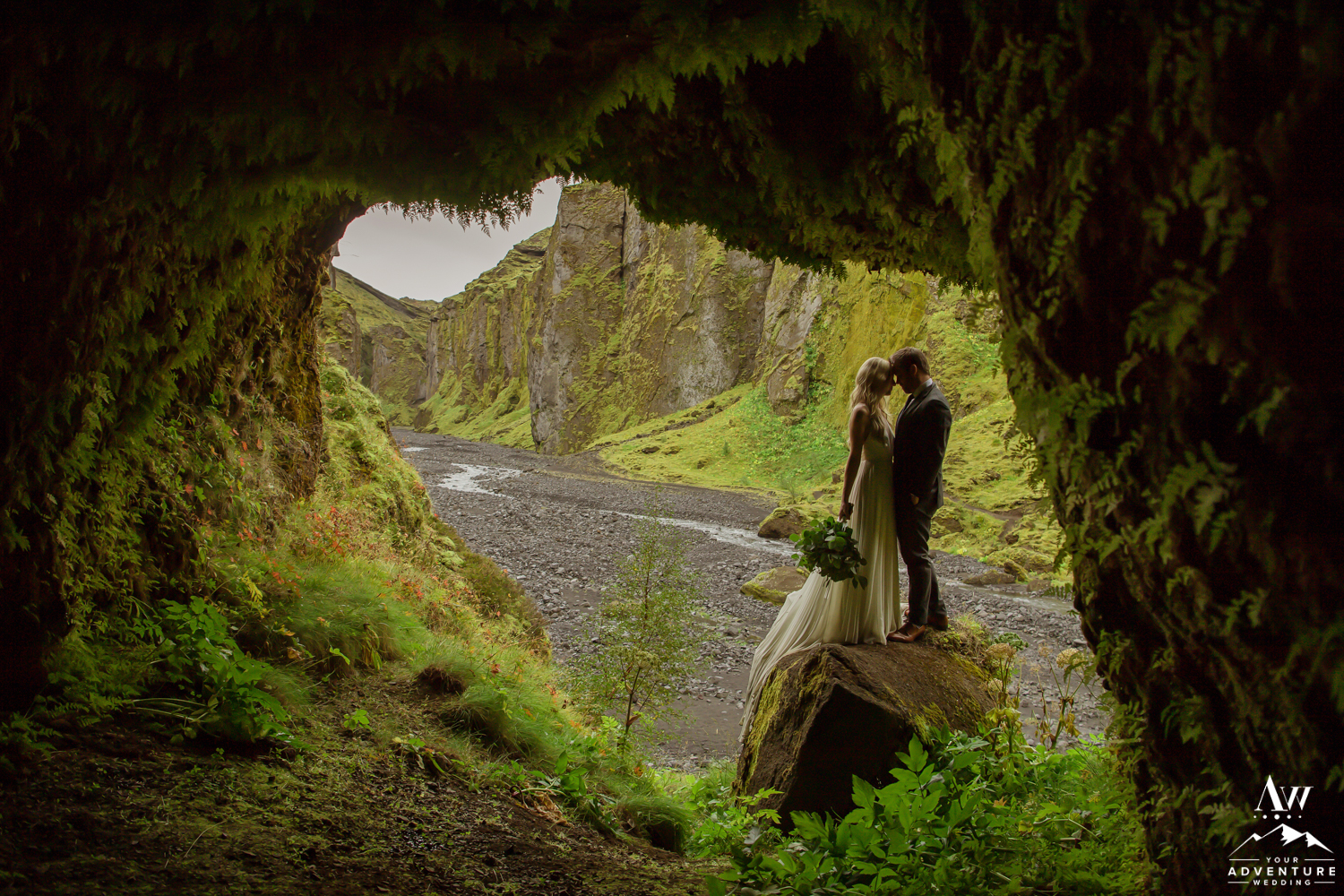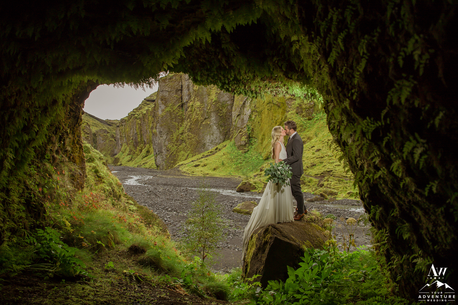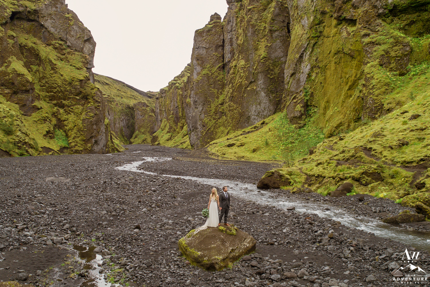 Okay okay, so hiking on your wedding day may be no big deal to most of your out there. But what do you think about hiking up a waterfall and then rock climbing over about 6 foot gorge, and then hiking the rest of the way literally through knee high water? Are you in or are you out? Heather and Mike opted in along with their Iceland elopement photographer, Ann! Side note… There may or may not have been shots of Brennivin as a reward at the end and Iceland elopement photographer, Ann Peters could have been wearing waders, I dunno! 😉