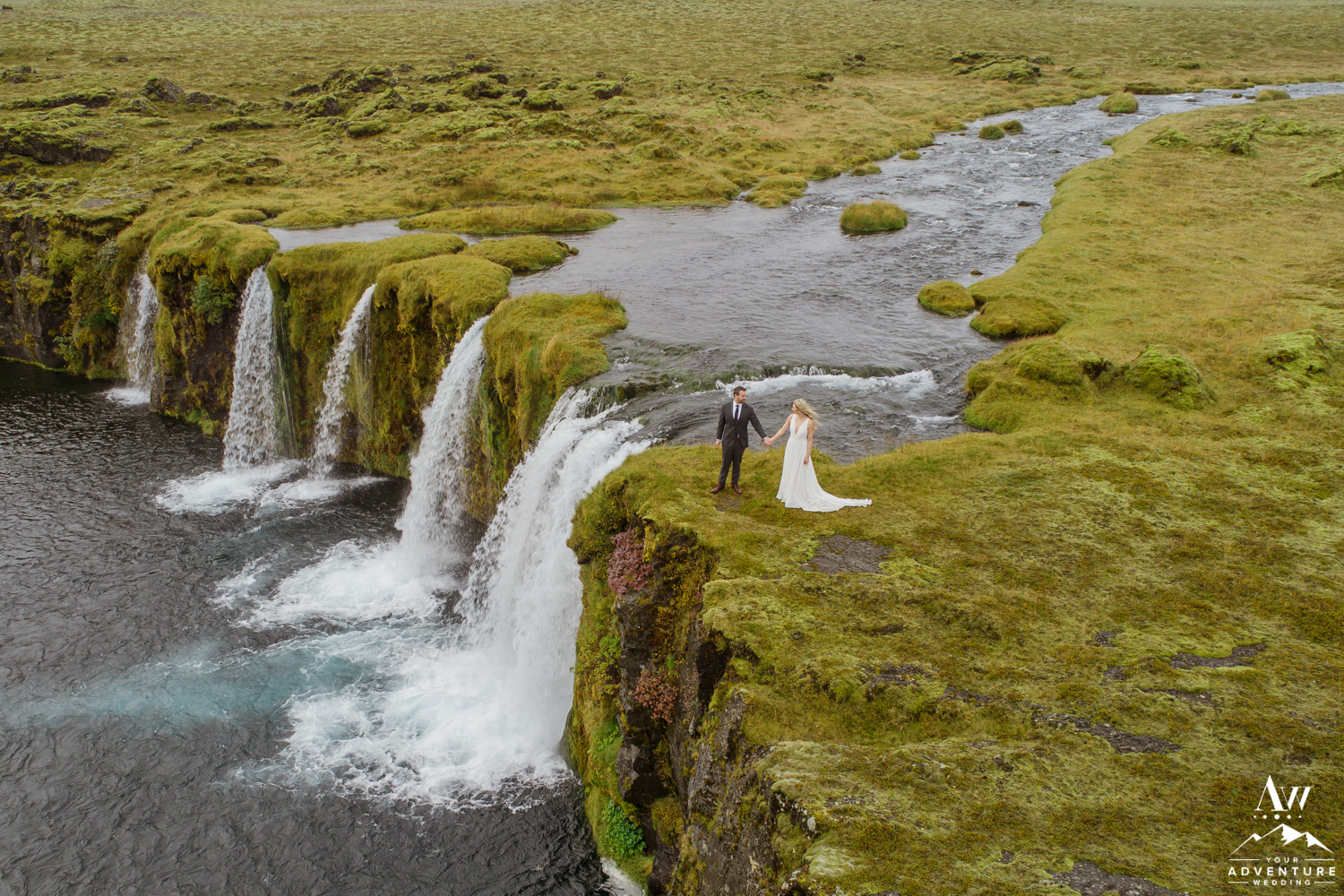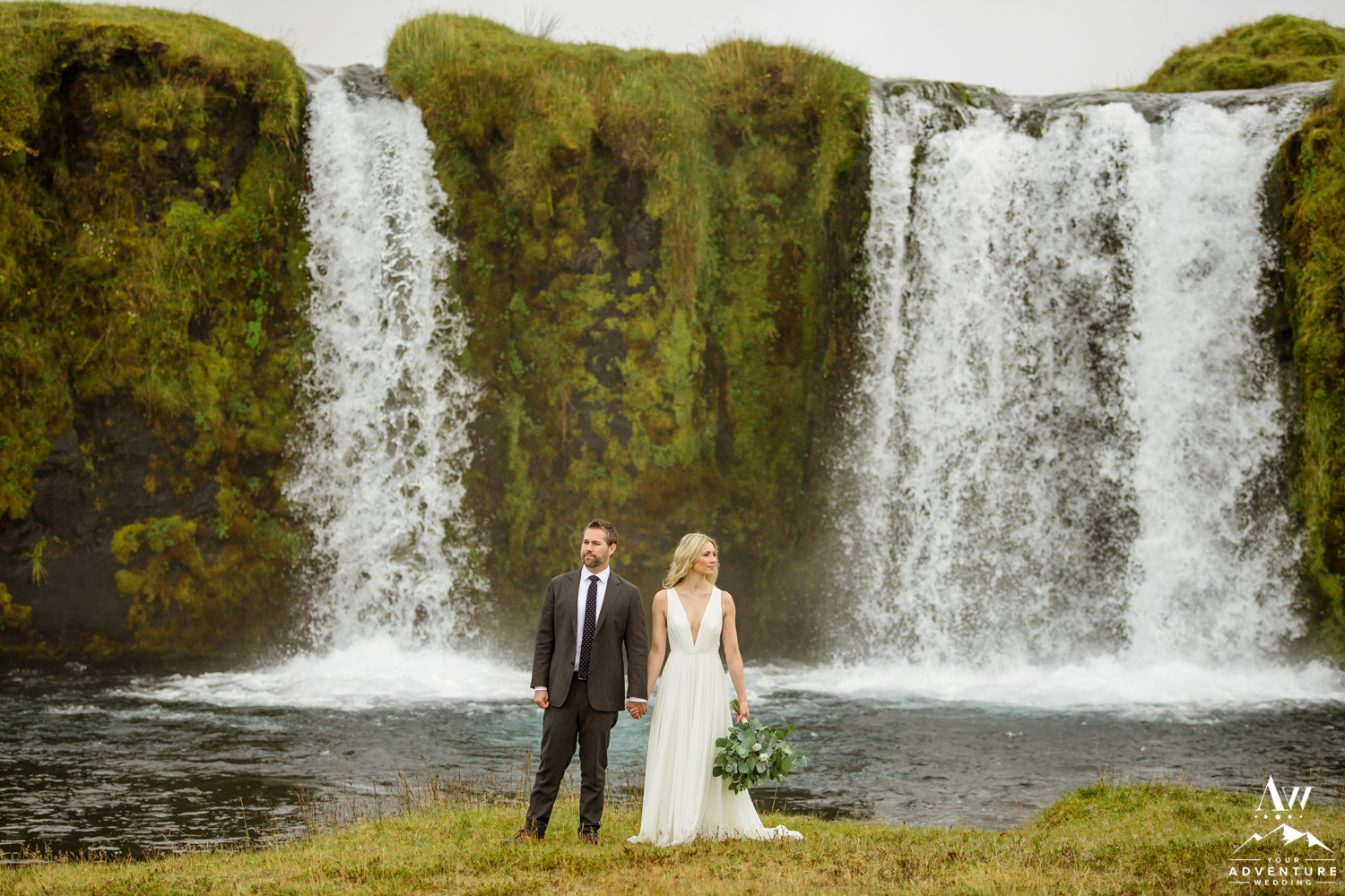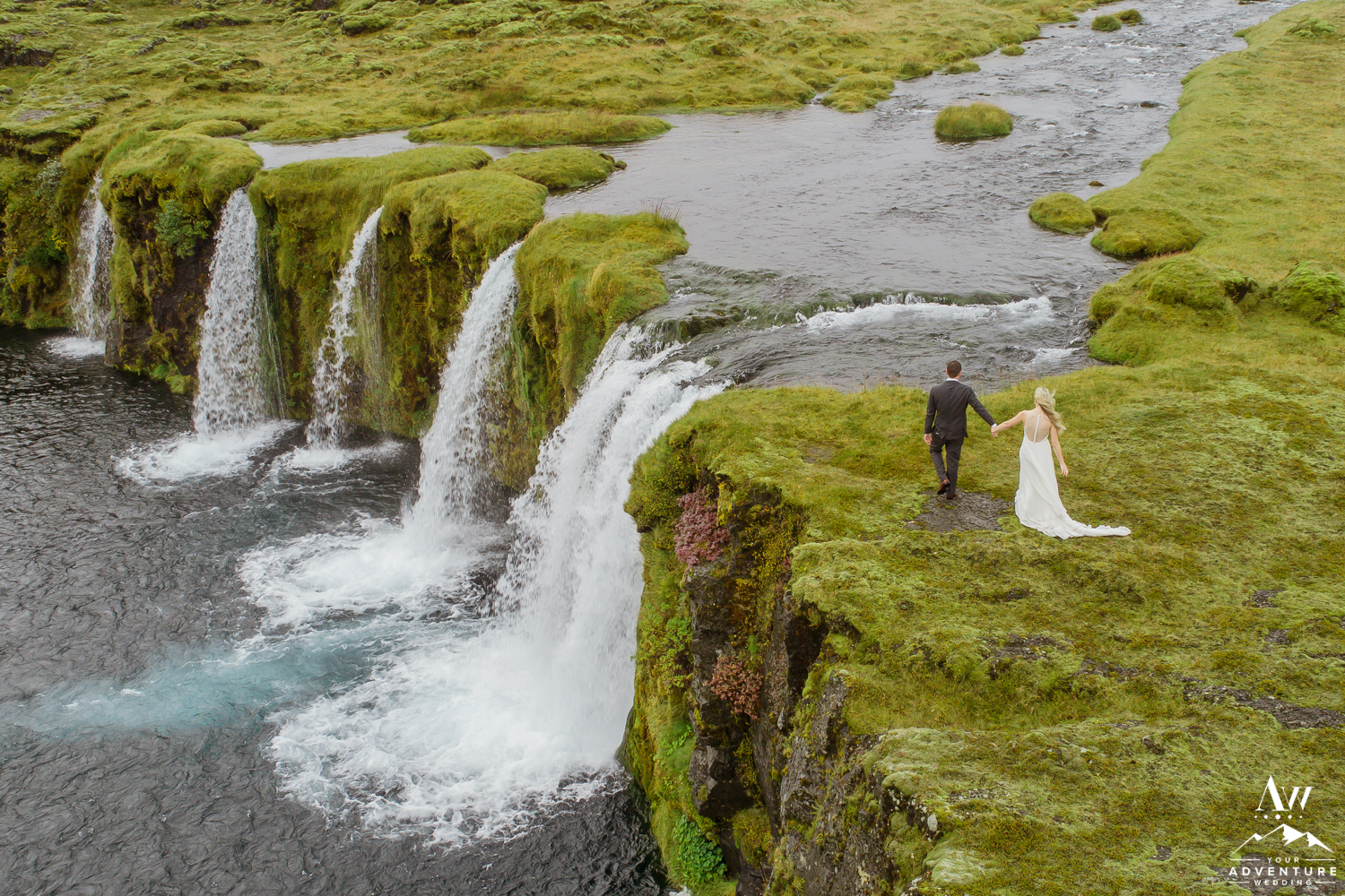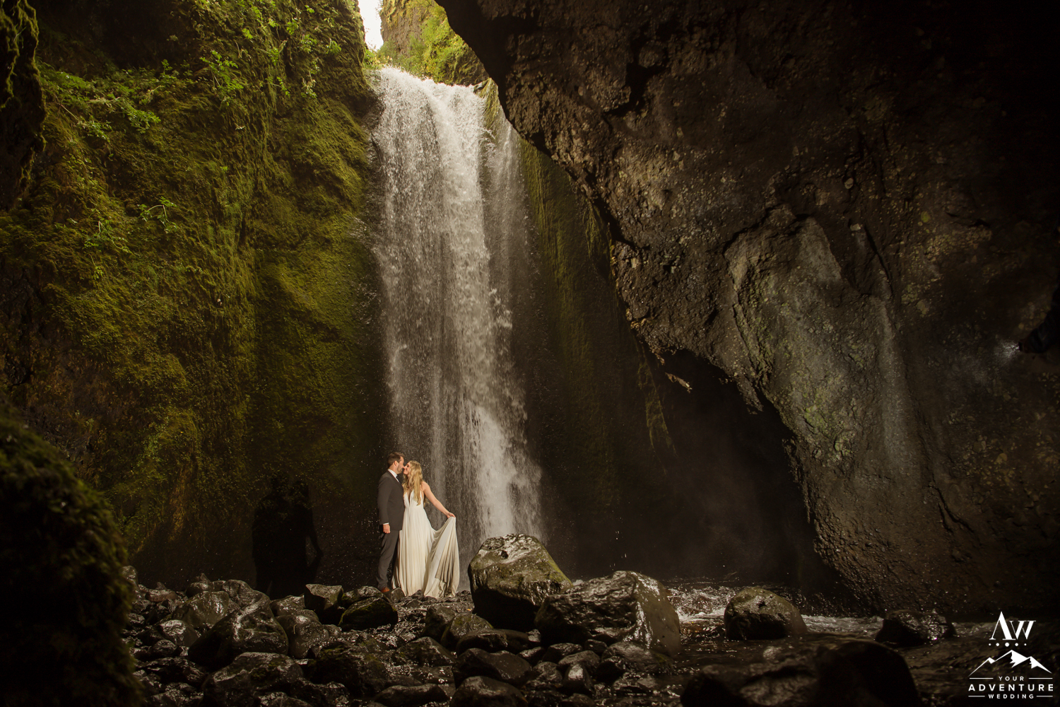 Spending a few minutes after the ceremony together just enjoying the view is an important part of the experience factor of our adventure style elopements. The day goes so fast, so it is critical you take as many moments to savor and memory bank it! Finding the right balance between time to explore yourselves, adventuring around the area, and having amazing wedding photos is not only our job but our Iceland elopement photographer too! We set the schedule, but they follow it 😉 So! Onto the amazing wedding adventure photos at this private waterfall!