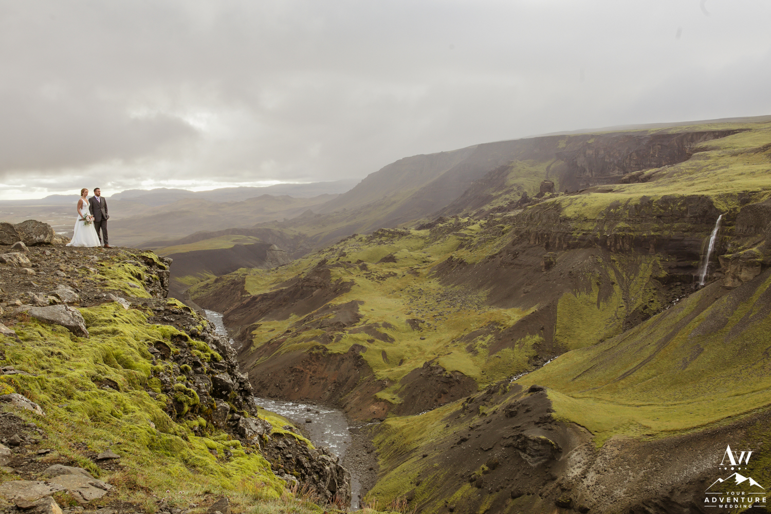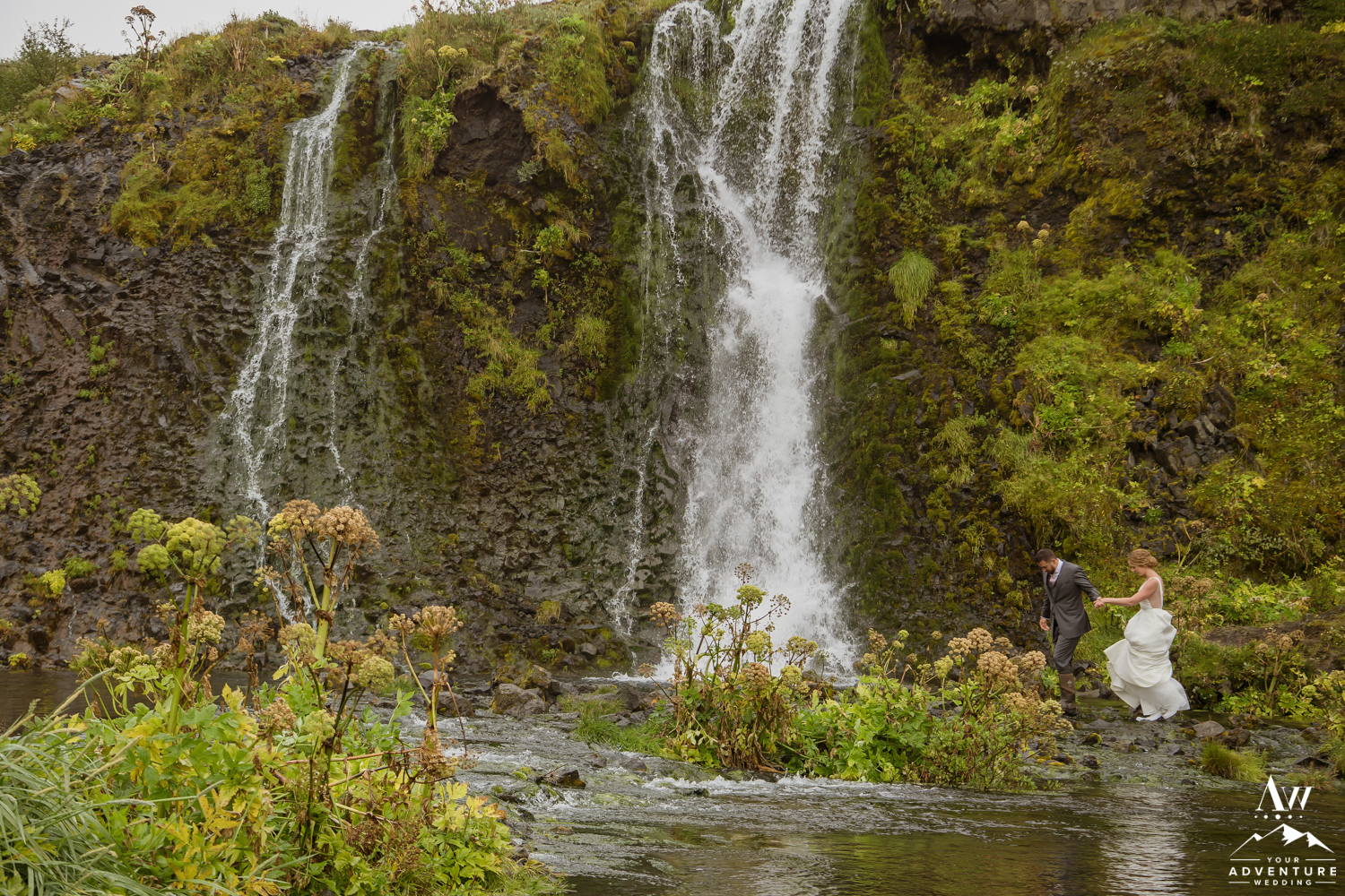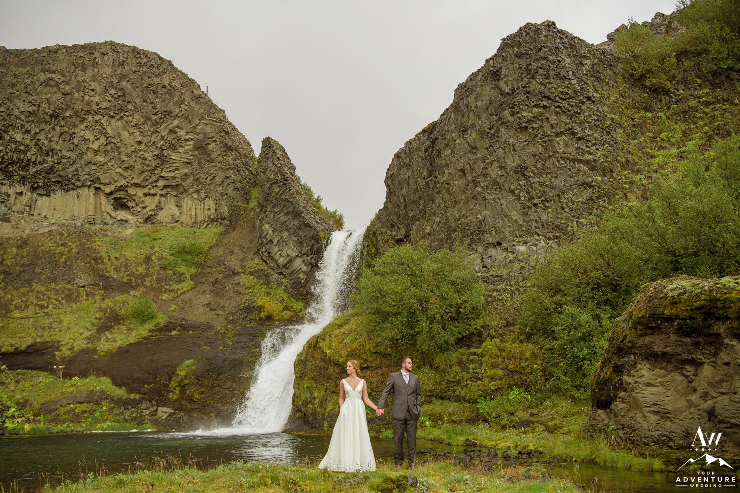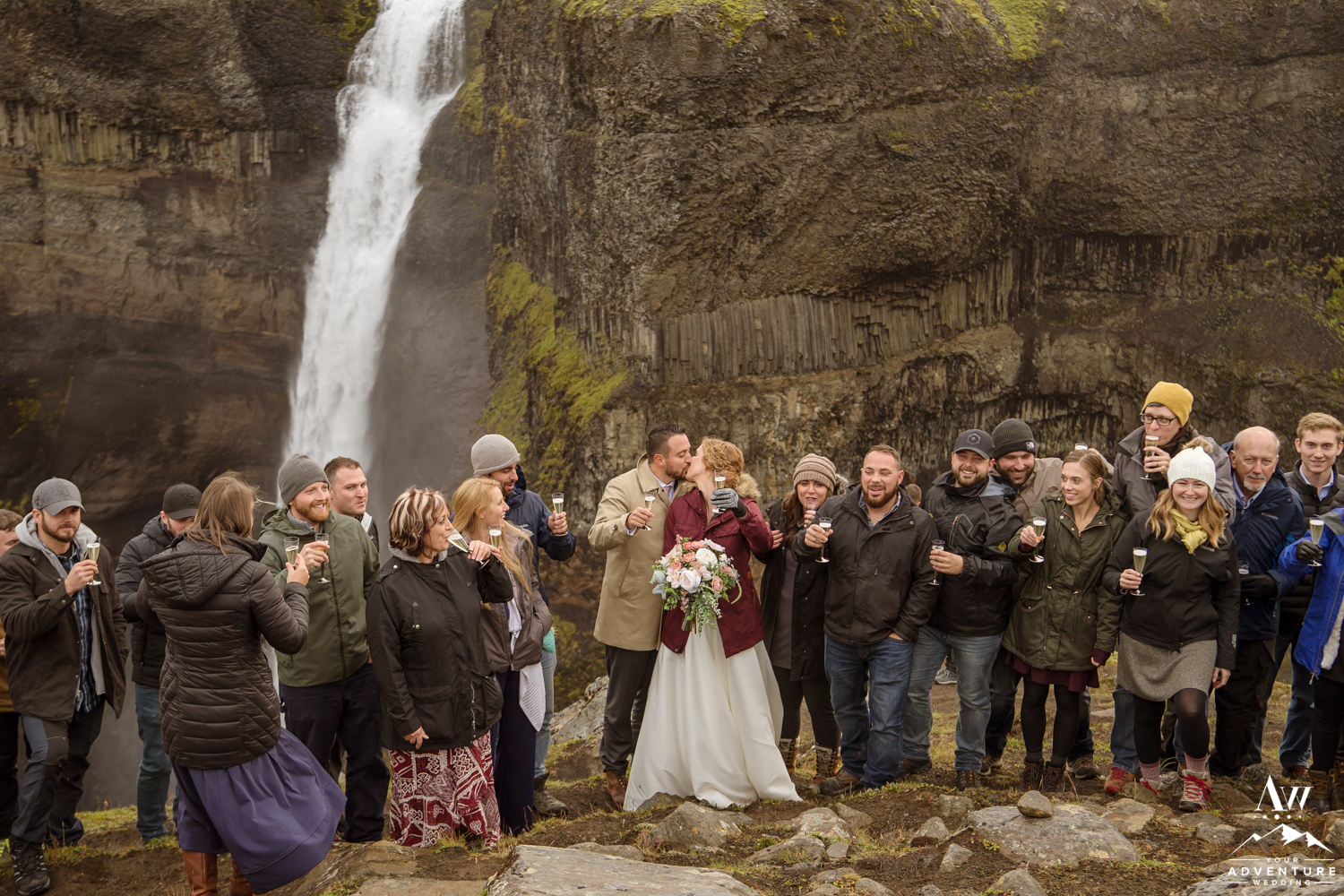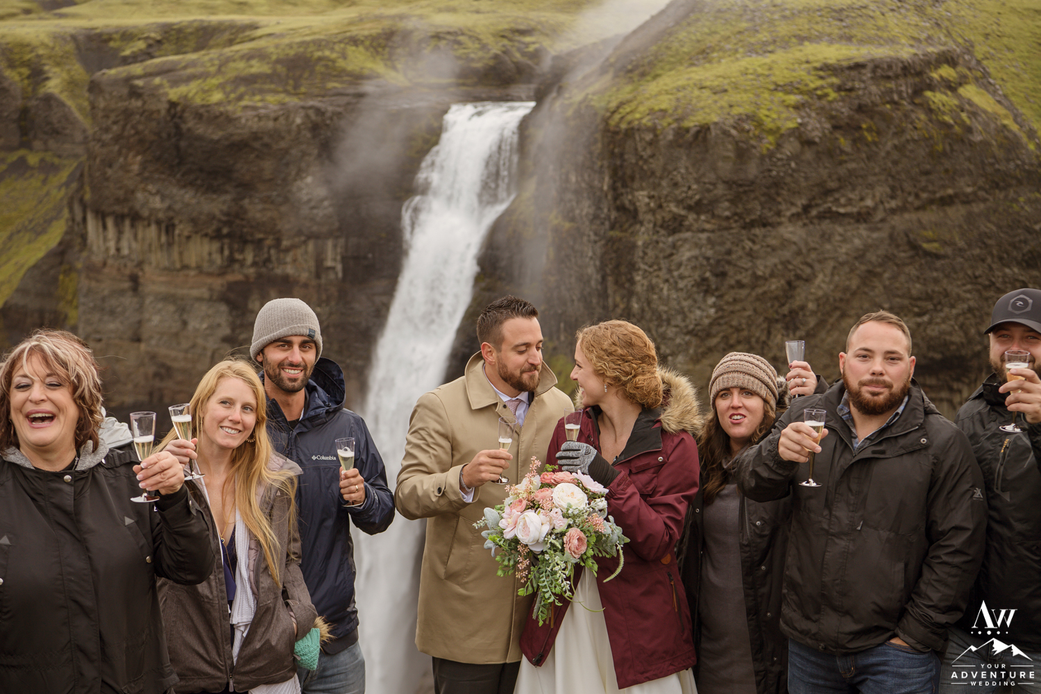 In our opinion champagne goes quite well with waterfalls, so a toast was in order before exploring the falls and the valley views! What is compelling about this Iceland adventure wedding location is that you get the best of all of the worlds… Gorgeous tall waterfalls, endless mountain views, and if you wanted to a challenging fun hike down into the valley! For time sake, we didn’t go on the full hike, but Erin and Jake had epic Iceland wedding photos to remember their adventure there!