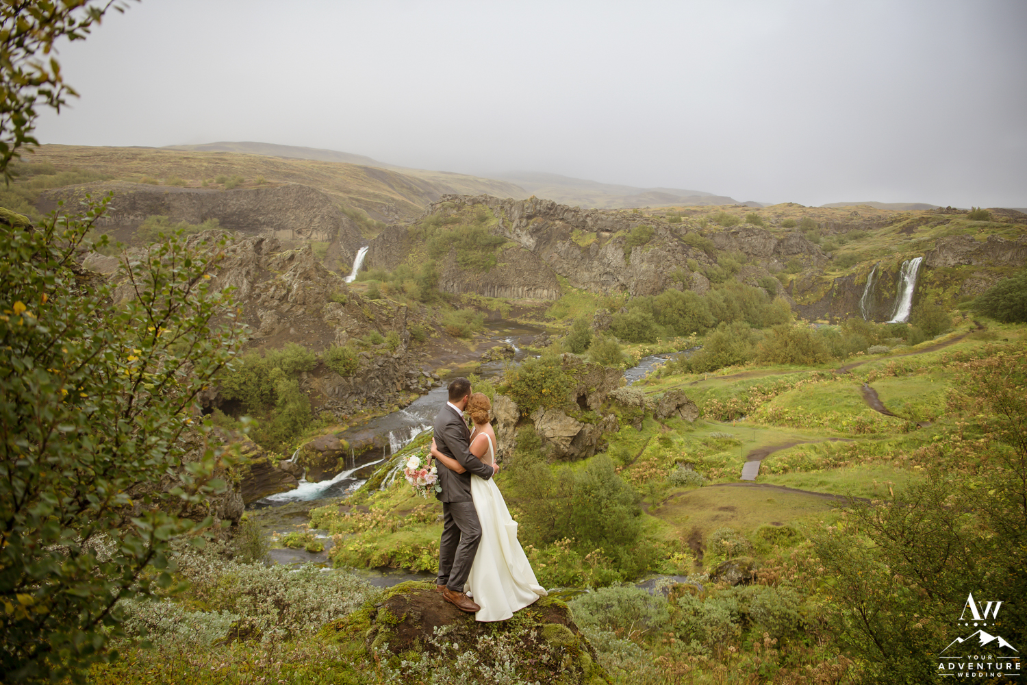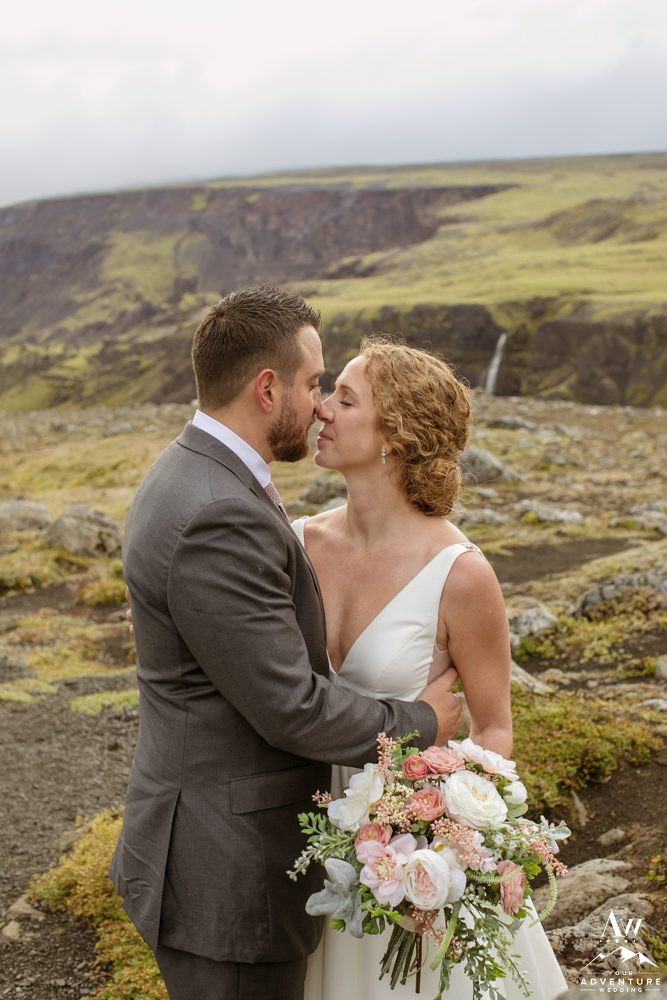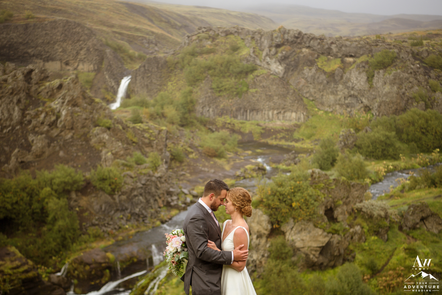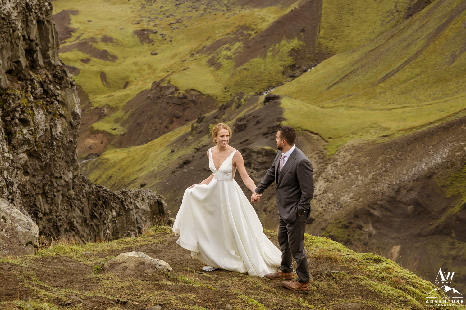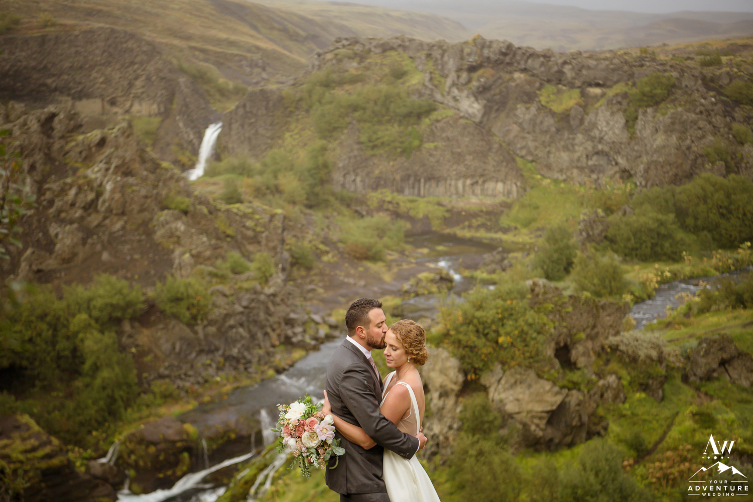 In our opinion champagne goes quite well with waterfalls, so a toast was in order before exploring the falls and the valley views! What is compelling about this Iceland adventure wedding location is that you get the best of all of the worlds… Gorgeous tall waterfalls, endless mountain views, and if you wanted to a challenging fun hike down into the valley! For time sake, we didn’t go on the full hike, but Erin and Jake had epic Iceland wedding photos to remember their adventure there!